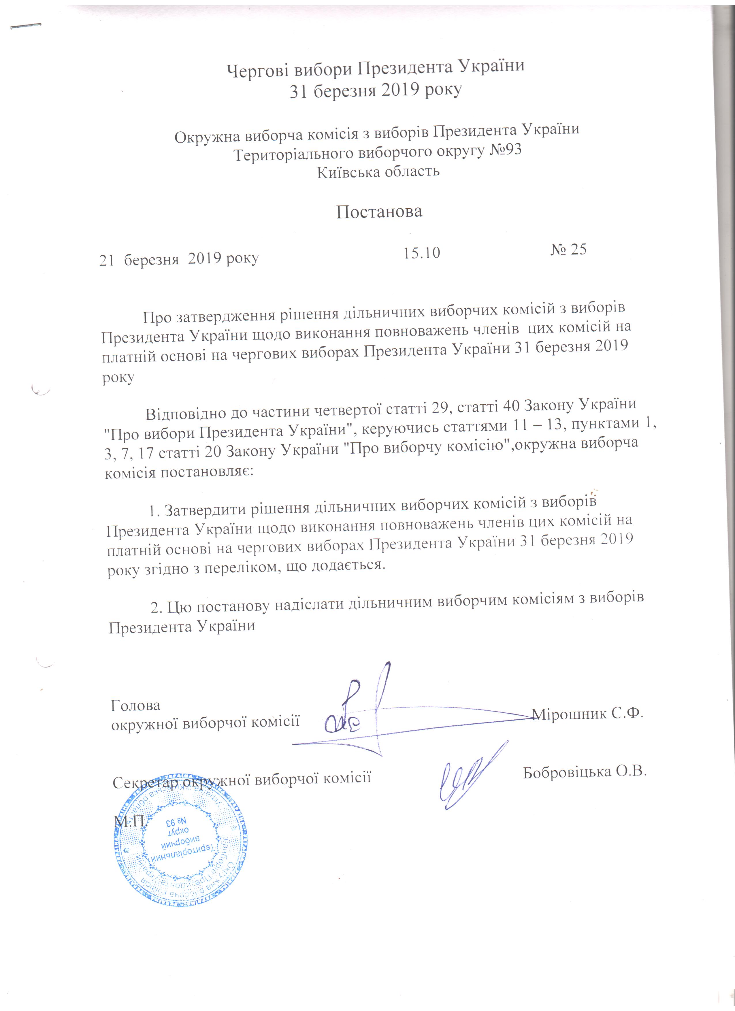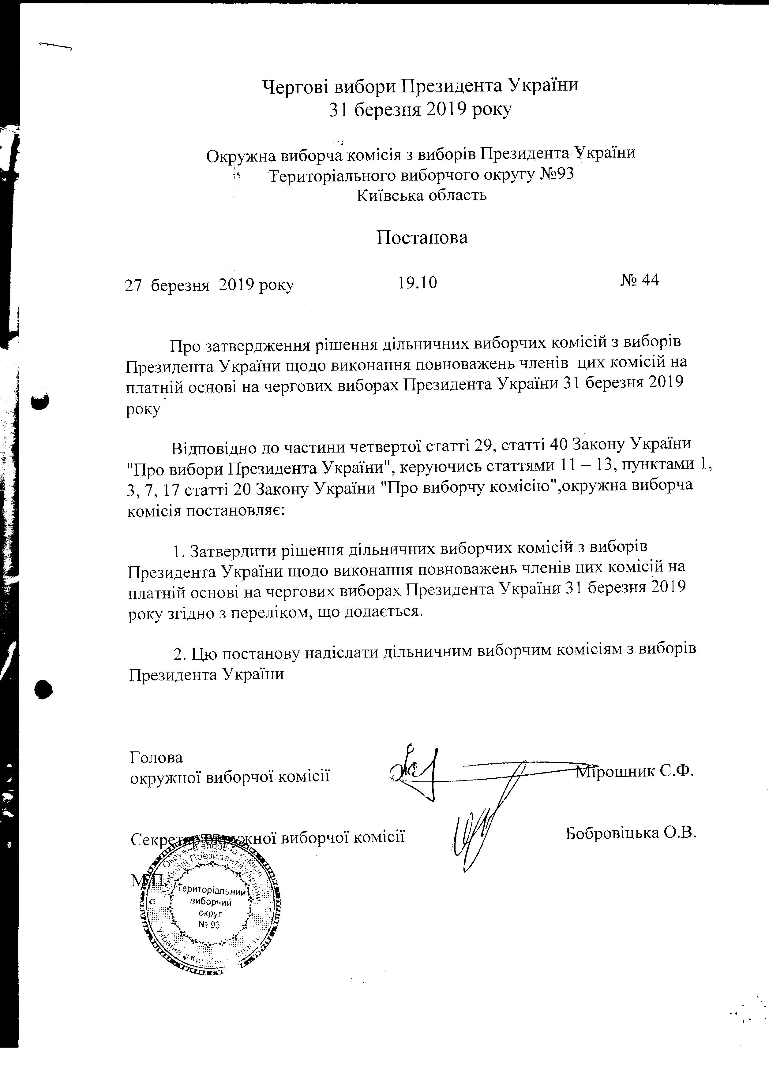 Про виконання членами ОВК з виборів Президента України ТВО № 93 своїх повноважень на платній основі |