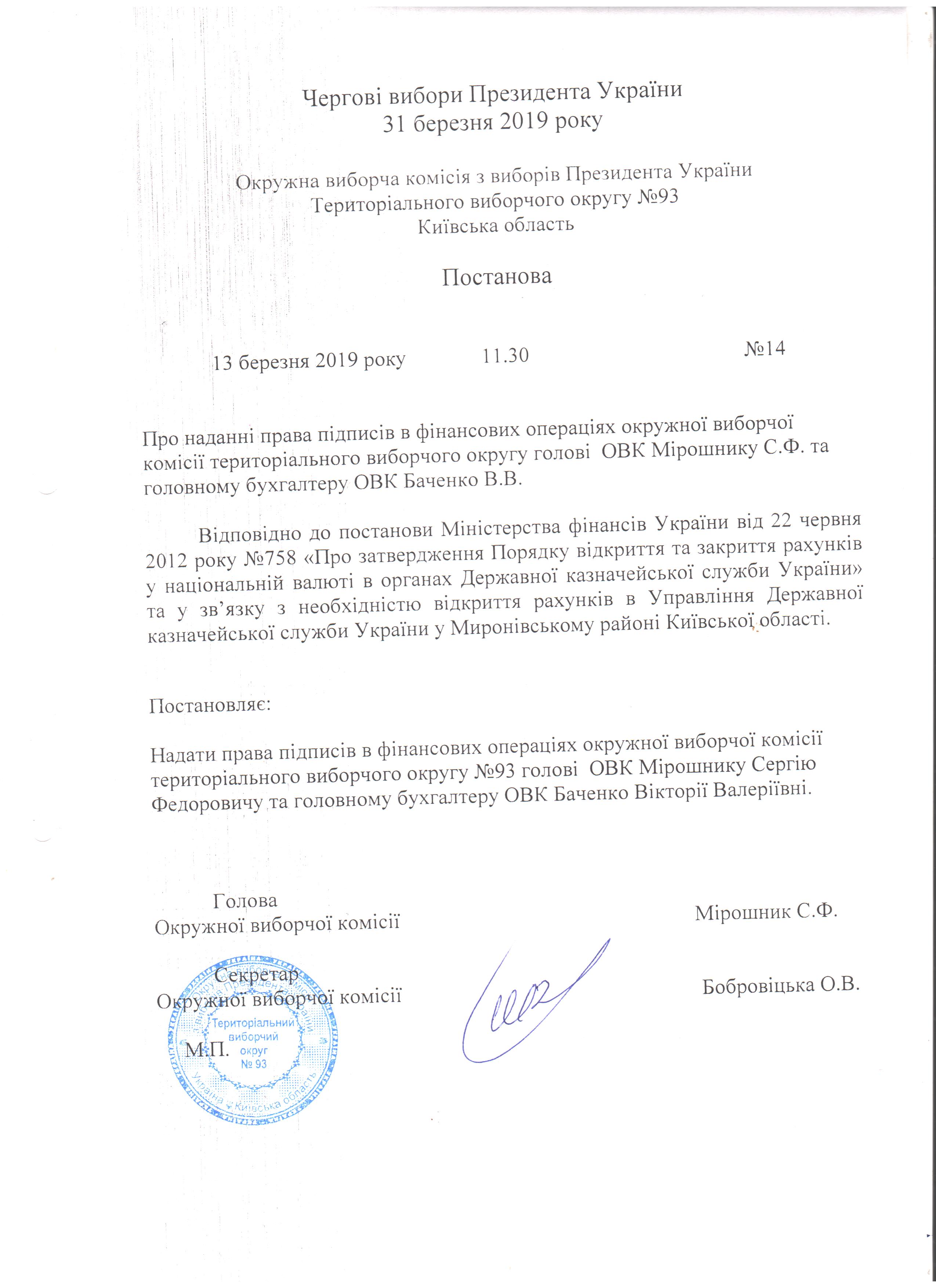 Про надання права підписів в фінансових операціях ОВК ТВО голові Мірошнику С.Ф. та головному бухгалтеру ОВК Баченко В.В. |