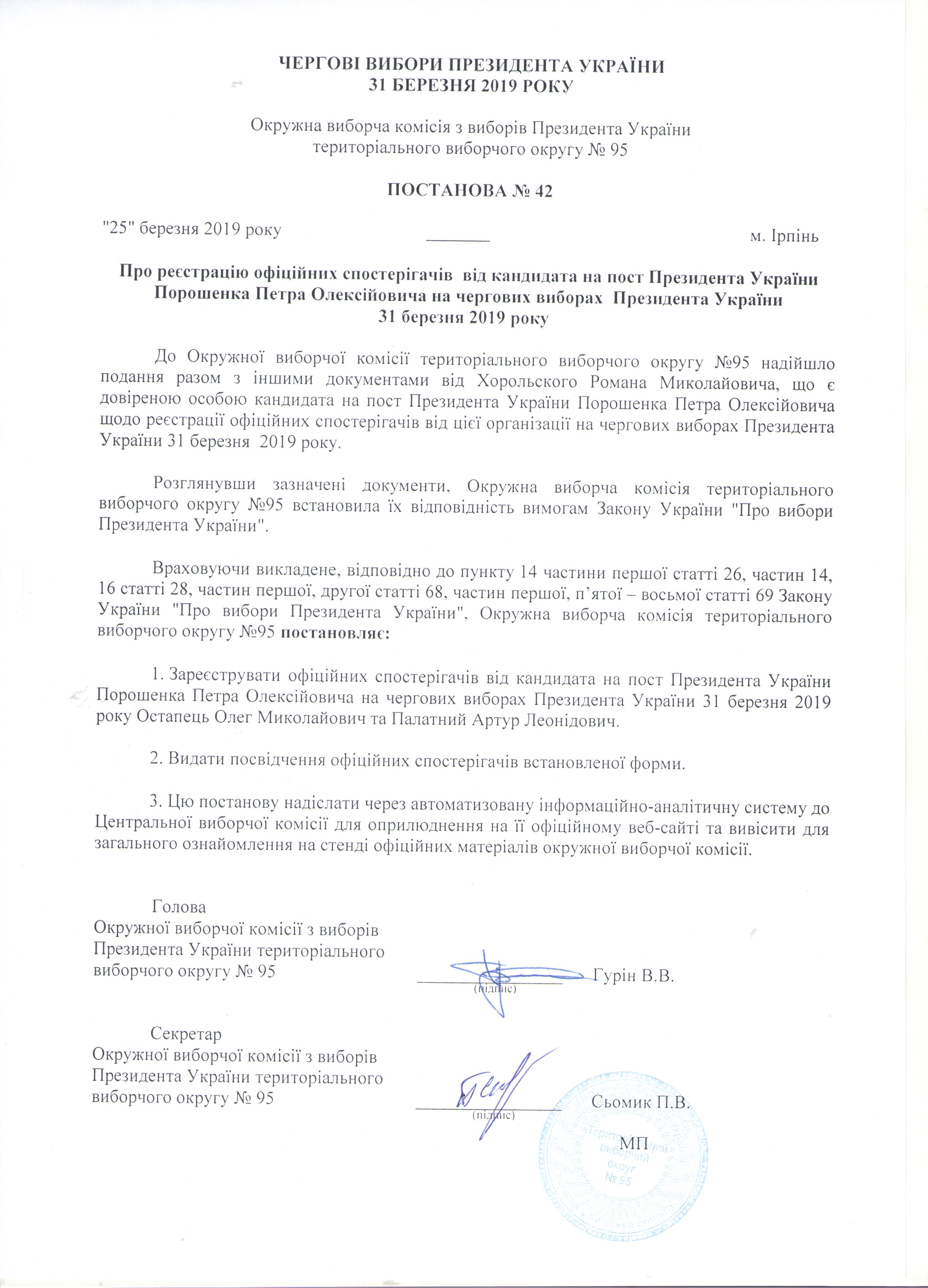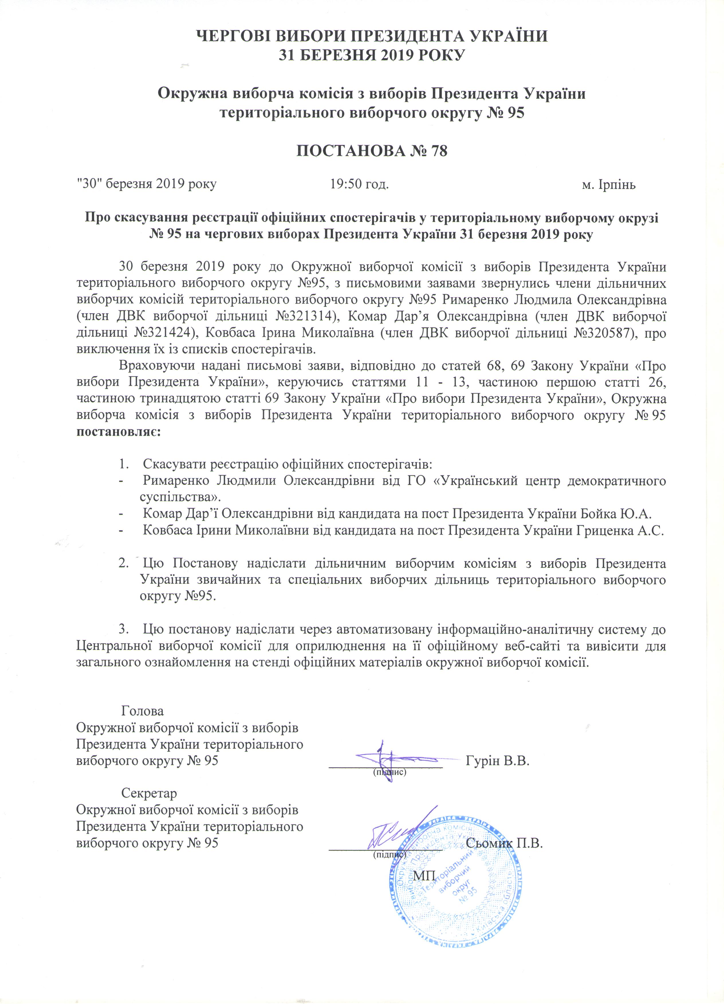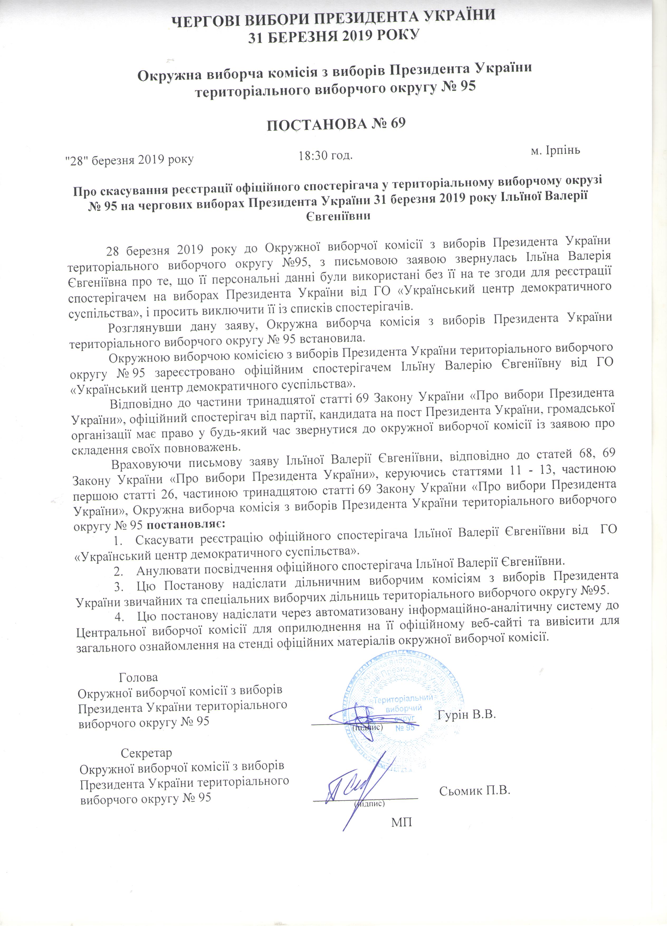 Про дострокове припинення повноважень офіційних спостерігачів у територіальному виборчому окрузі №95 на чергових виборах Президента України 31 березня 2019 року |