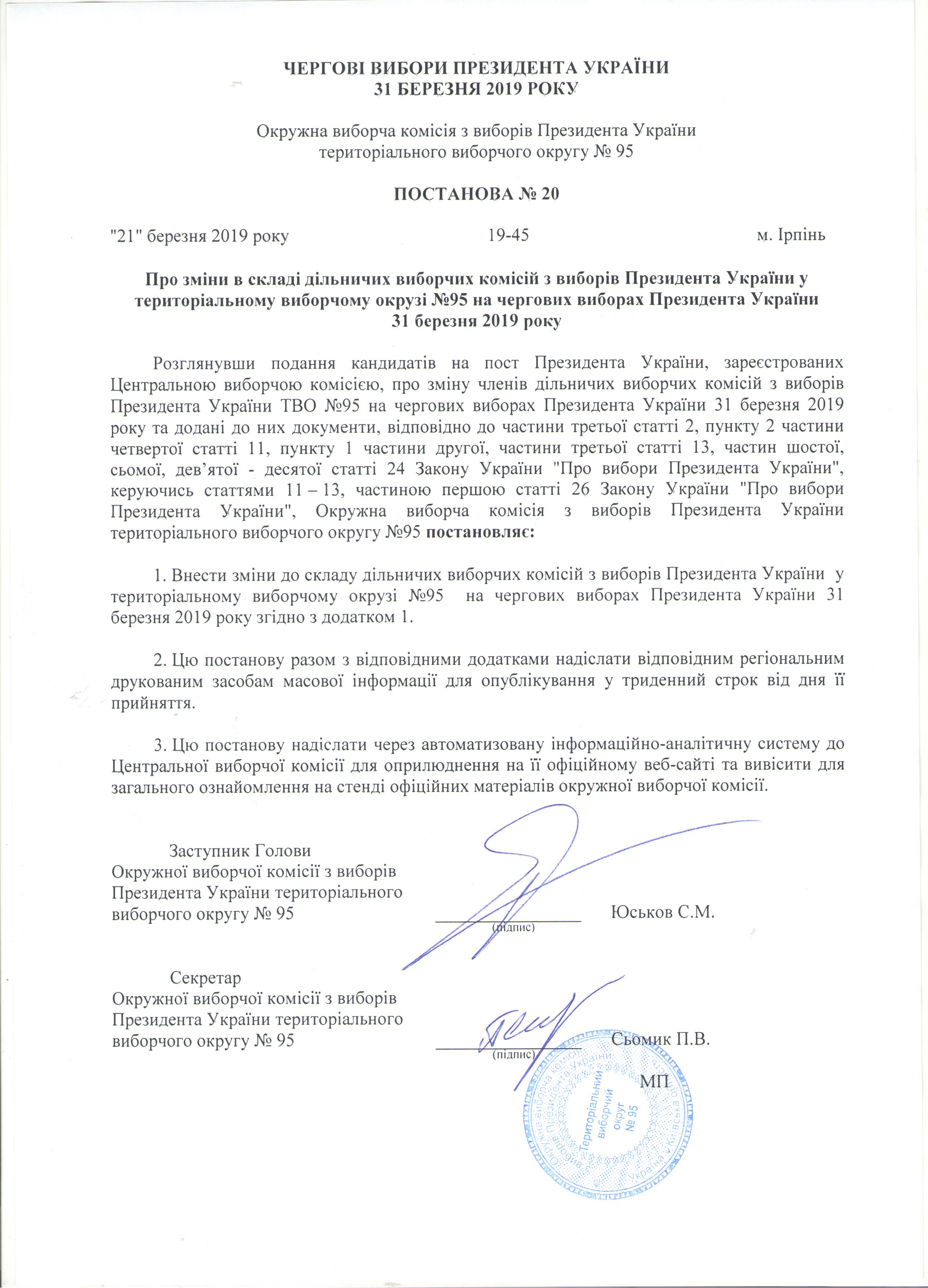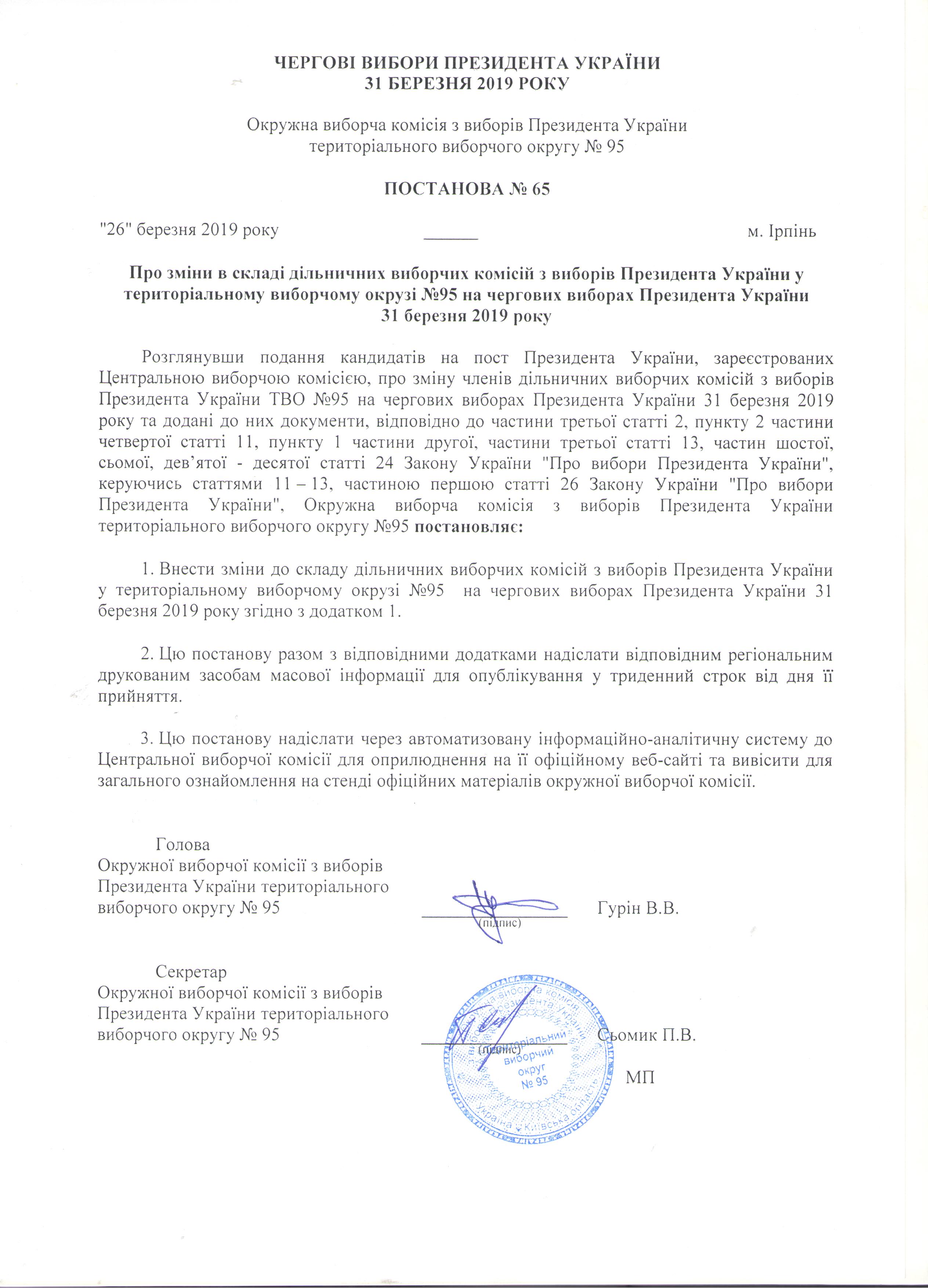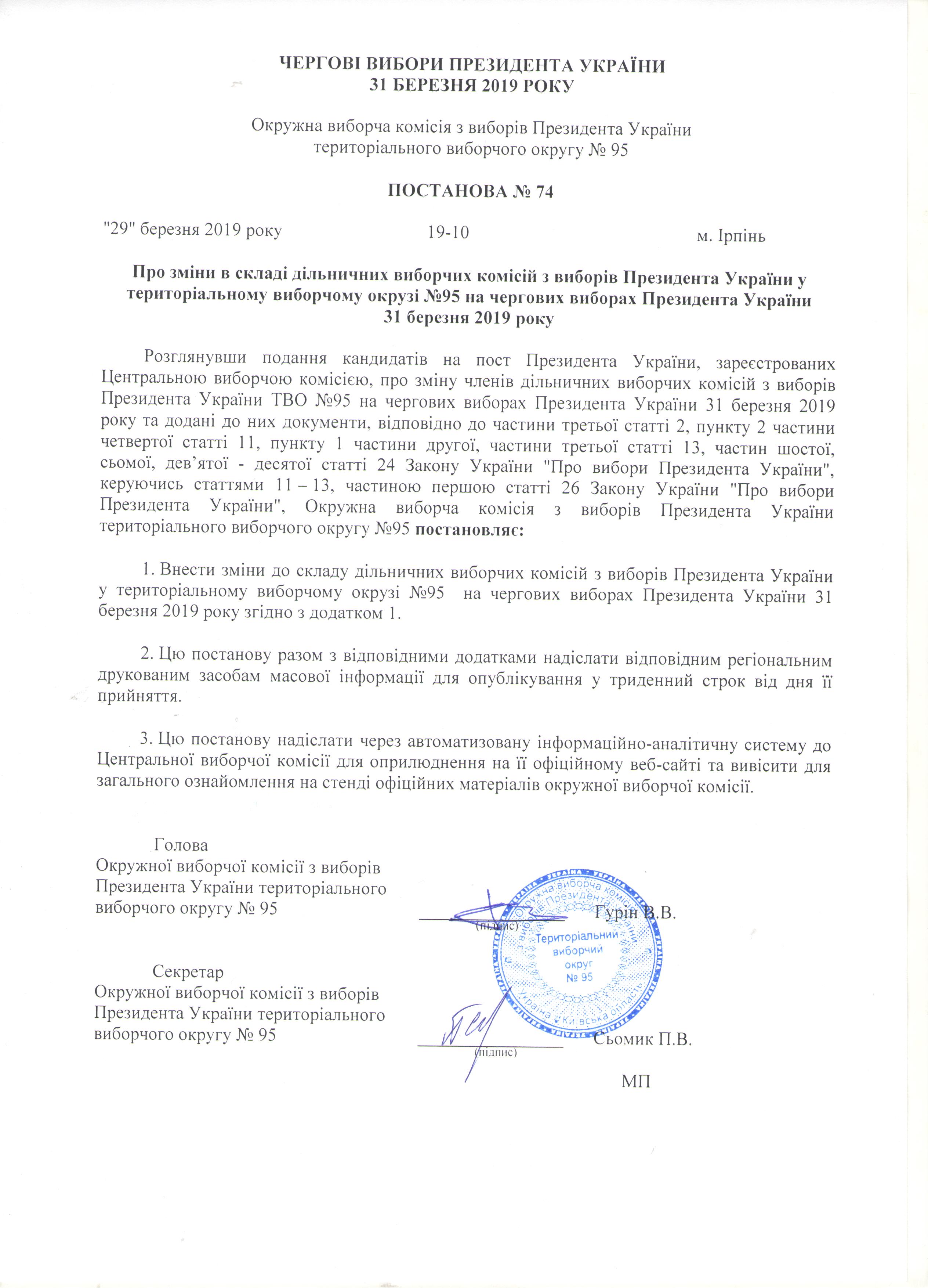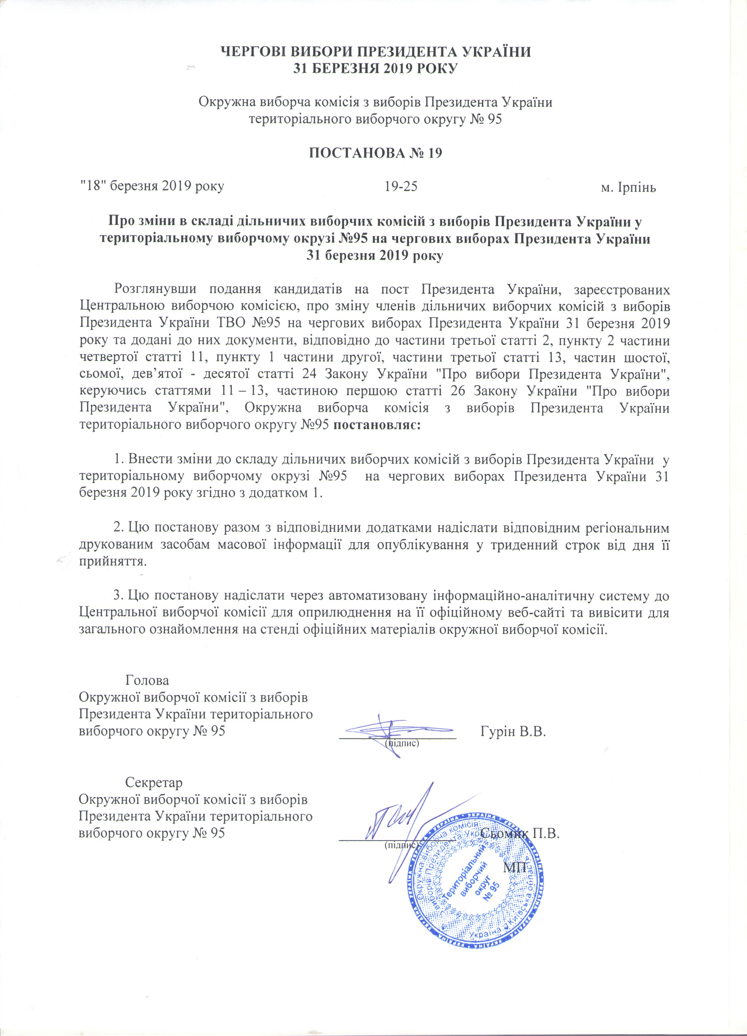Про зміни в складі дільничих виборчих комісій з виборів Президента України у територіальному виборчому окрузі №95 на чергових виборах Президента України 31 березня 2019 року |