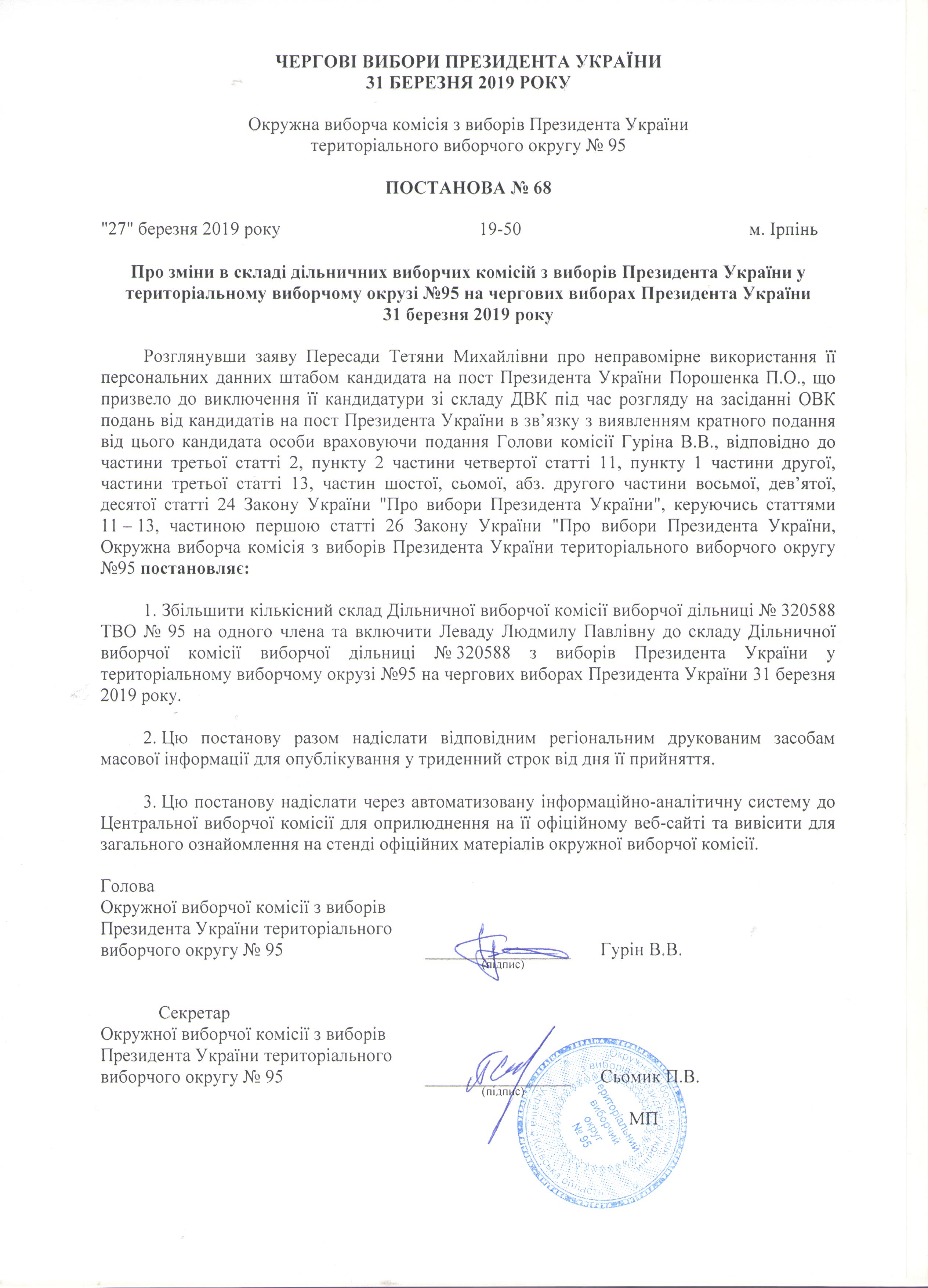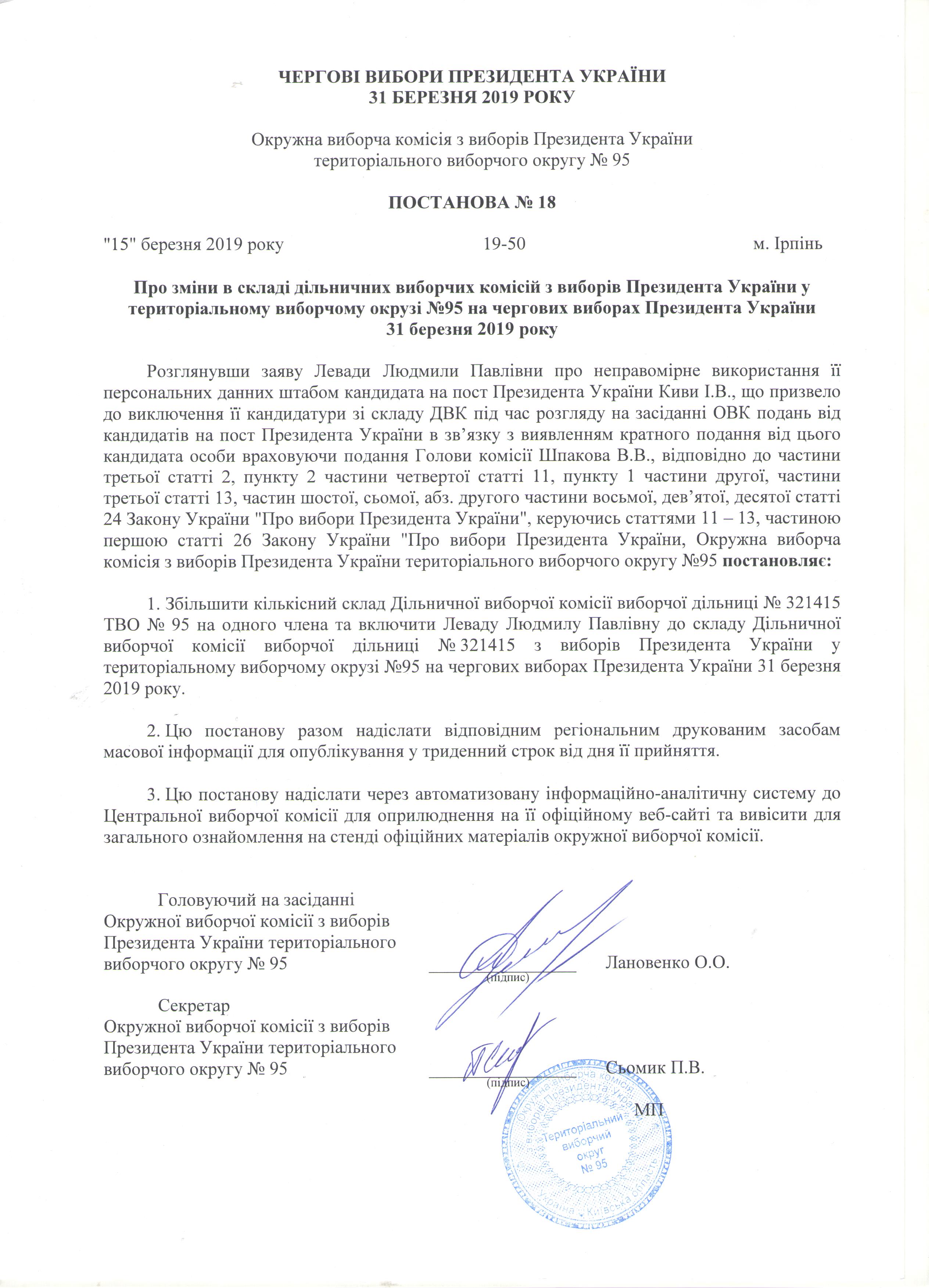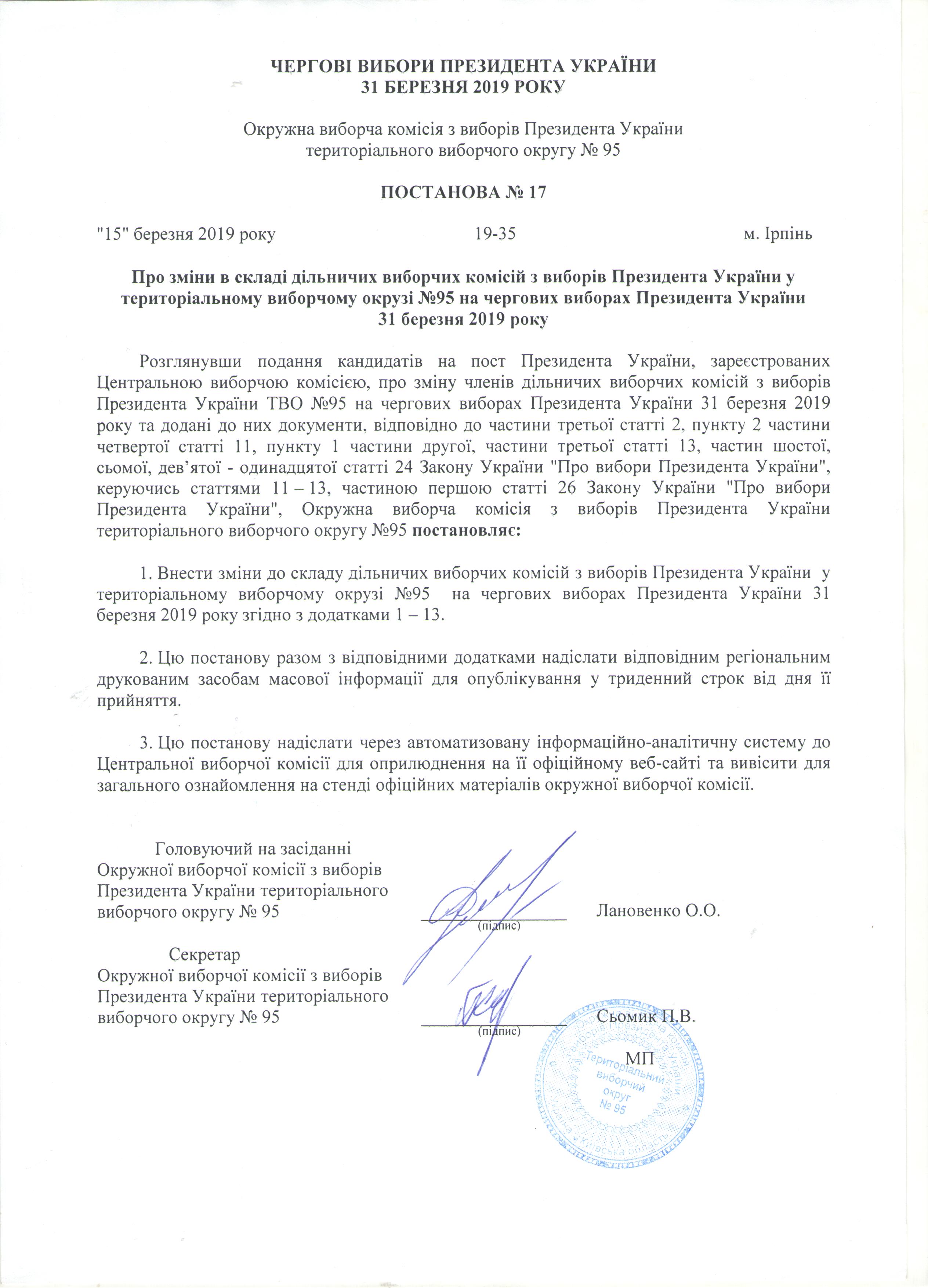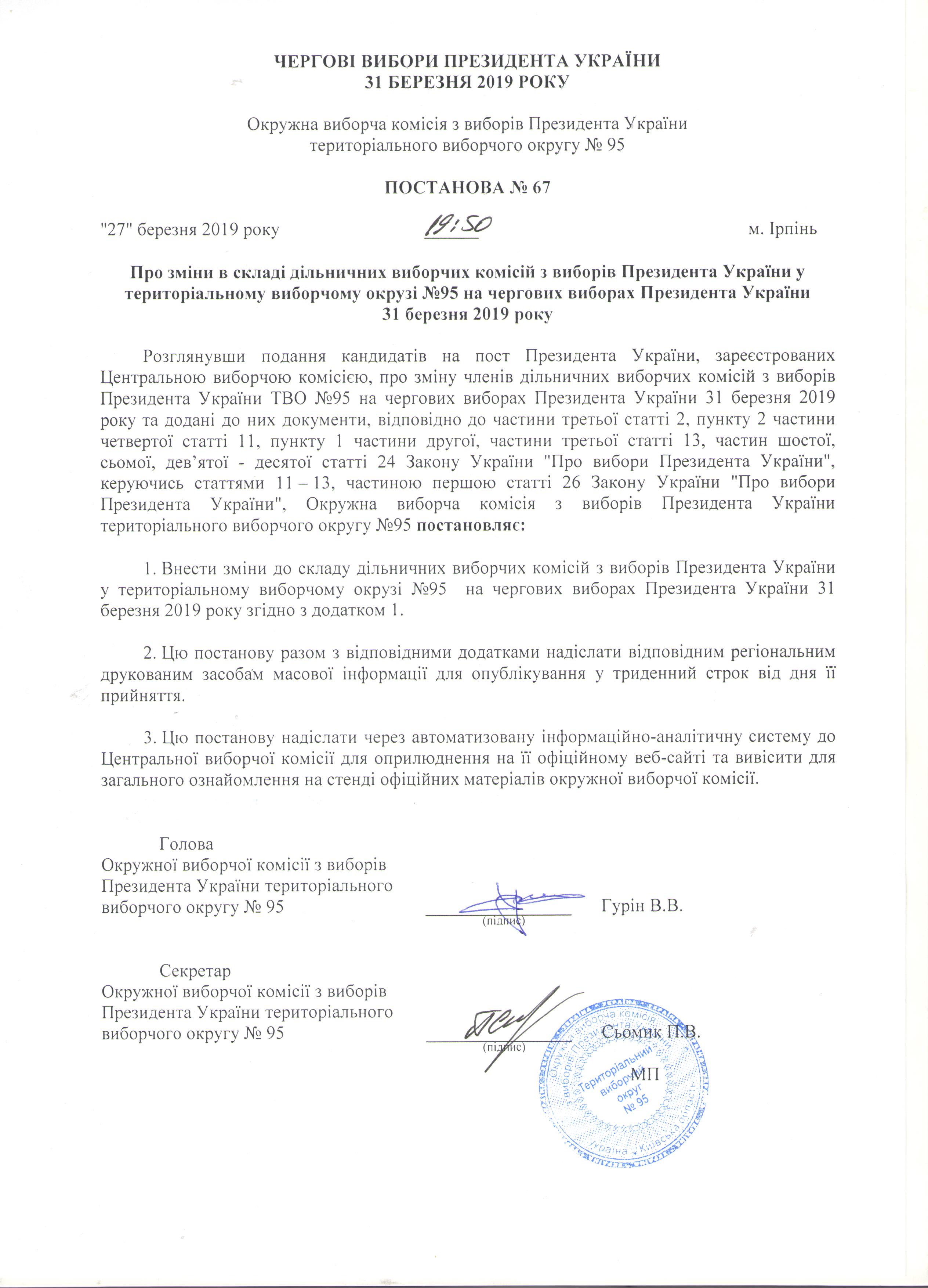 Про зміни в складі дільничих виборчих комісій з виборів Президента України у територіальному виборчому окрузі №95 на чергових виборах Президента України 31 березня 2019 року |