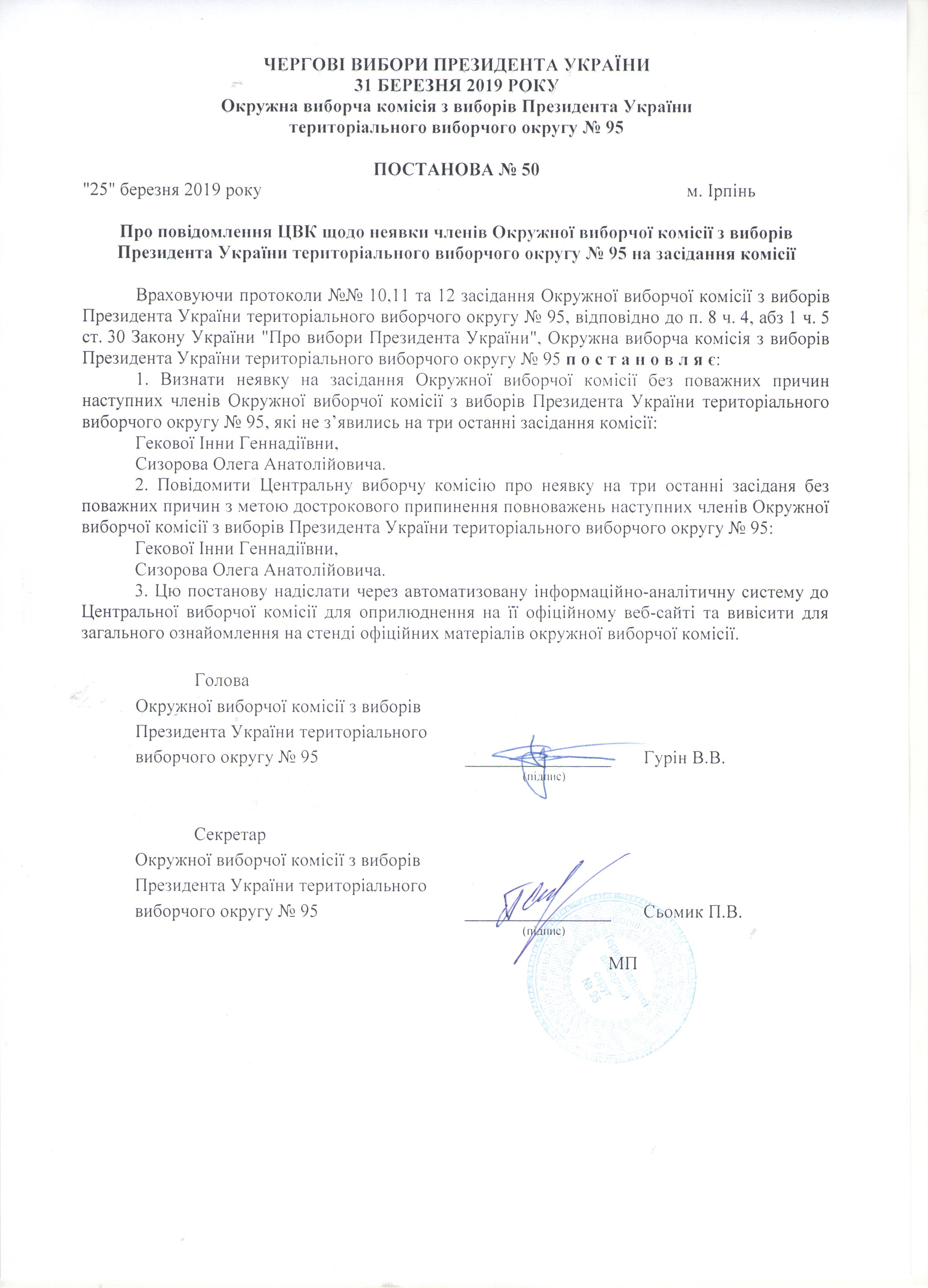 Про повідомлення ЦВК щодо неявки членів Окружної виборчої комісії з виборів Презилента України територівльного виборчого округу №95 на засіданні комісії |