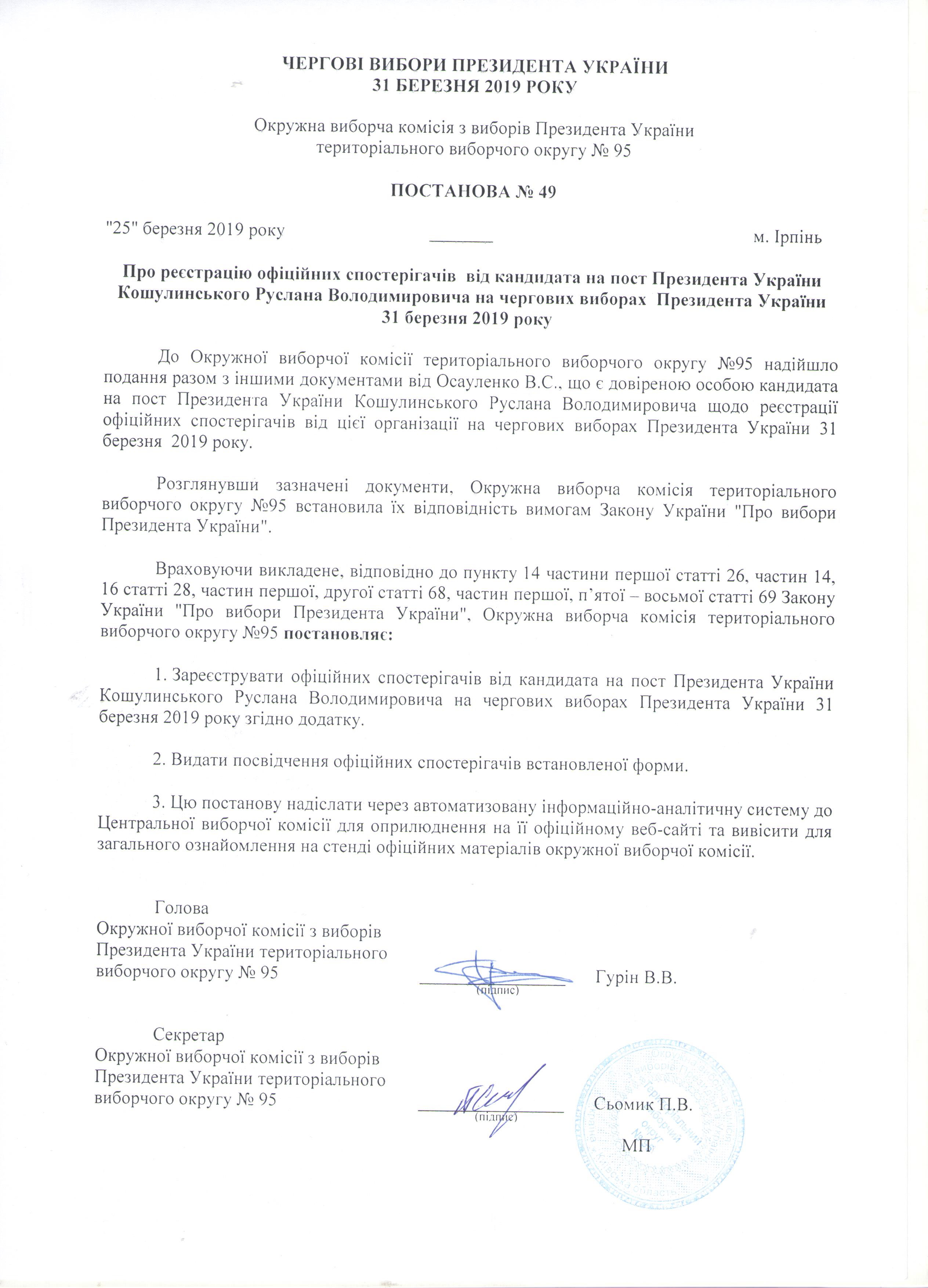 Про реєстрацію офіційних спостерігачів від кандидата на пост Президента України Кошулинського Руслана Володимировича на чергових виборах Президента України 31 березня 2019 року |