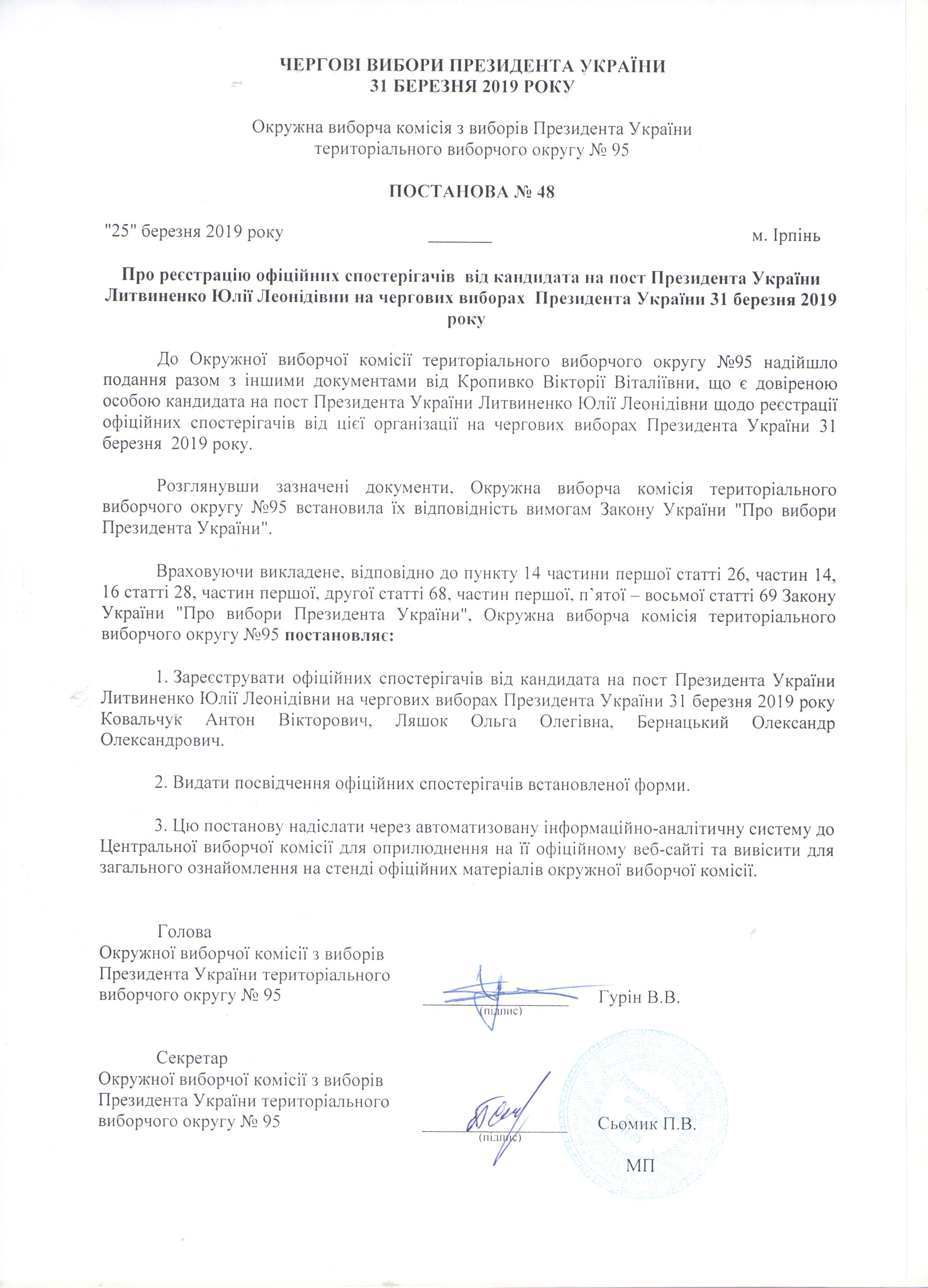 Про реєстрацію офіційних спостерігачів від кандидата на пост Президента України Литвиненко Юлії Леонідівни на чергових виборах Президента України 31 березня 2019 року |