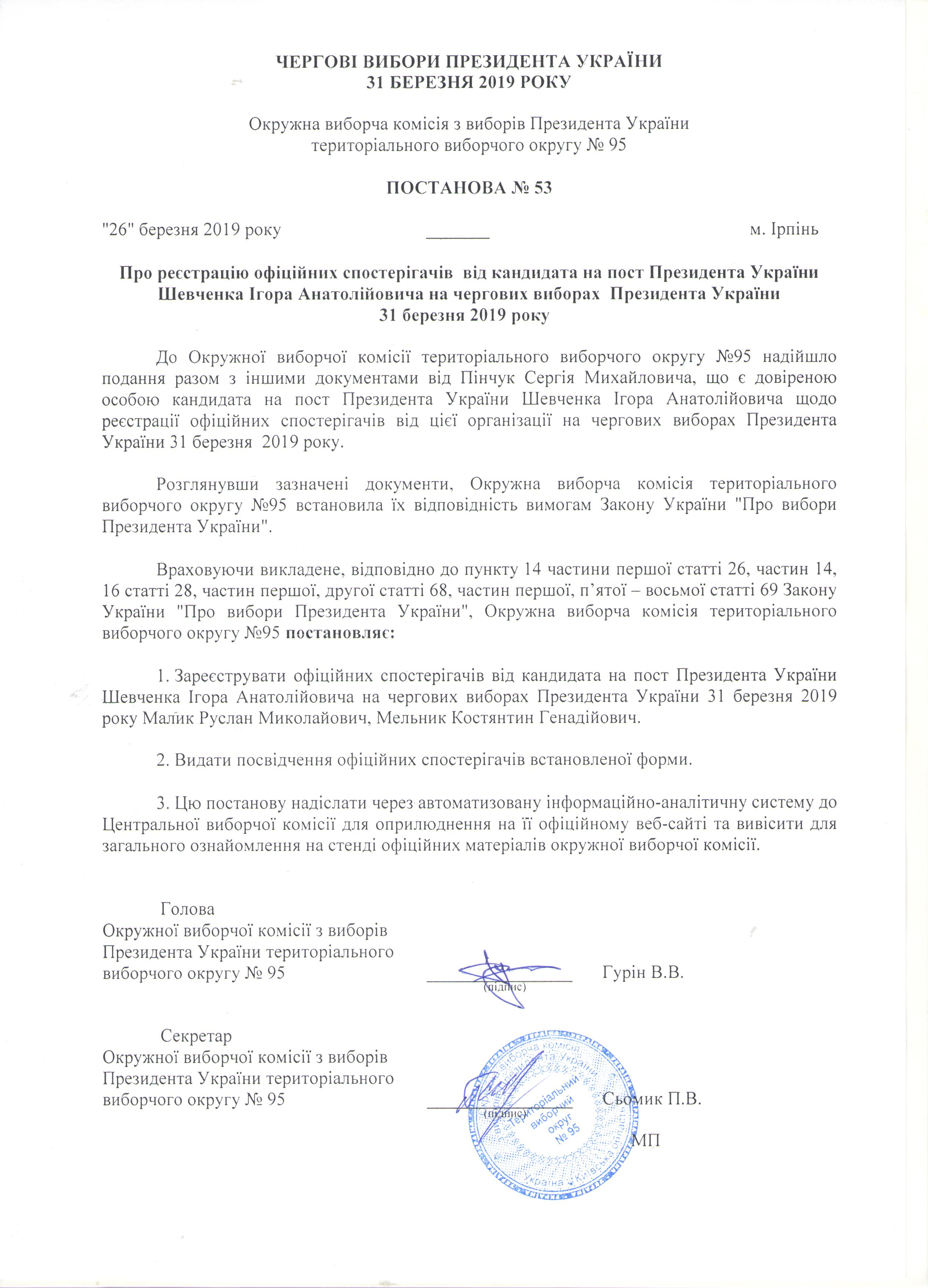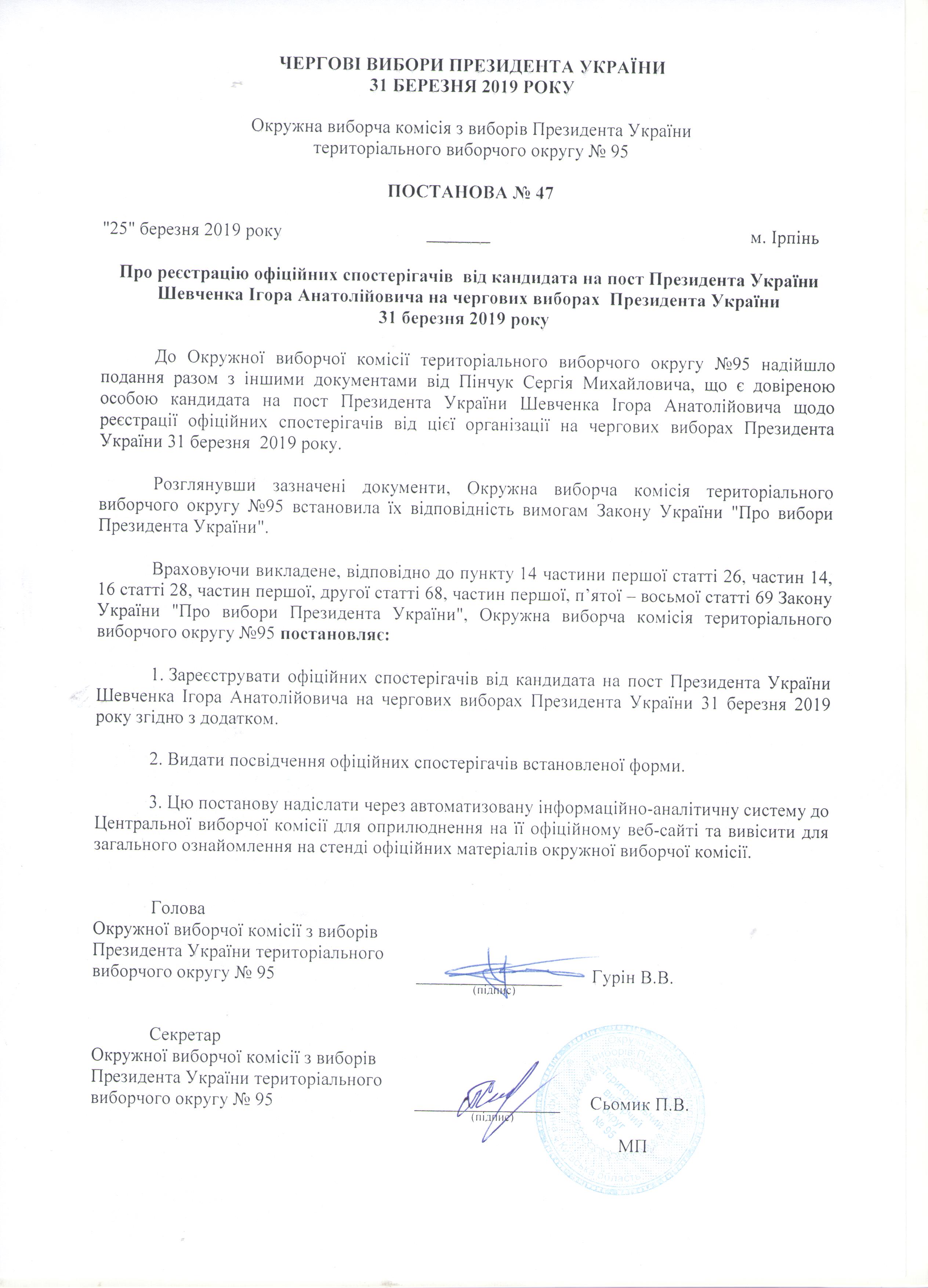 Про реєстрацію офіційних спостерігачів від кандидата на пост Президента України Шевченка Ігора Анатолійовича на чергових виборах Президента України 31 березня 2019 року |
