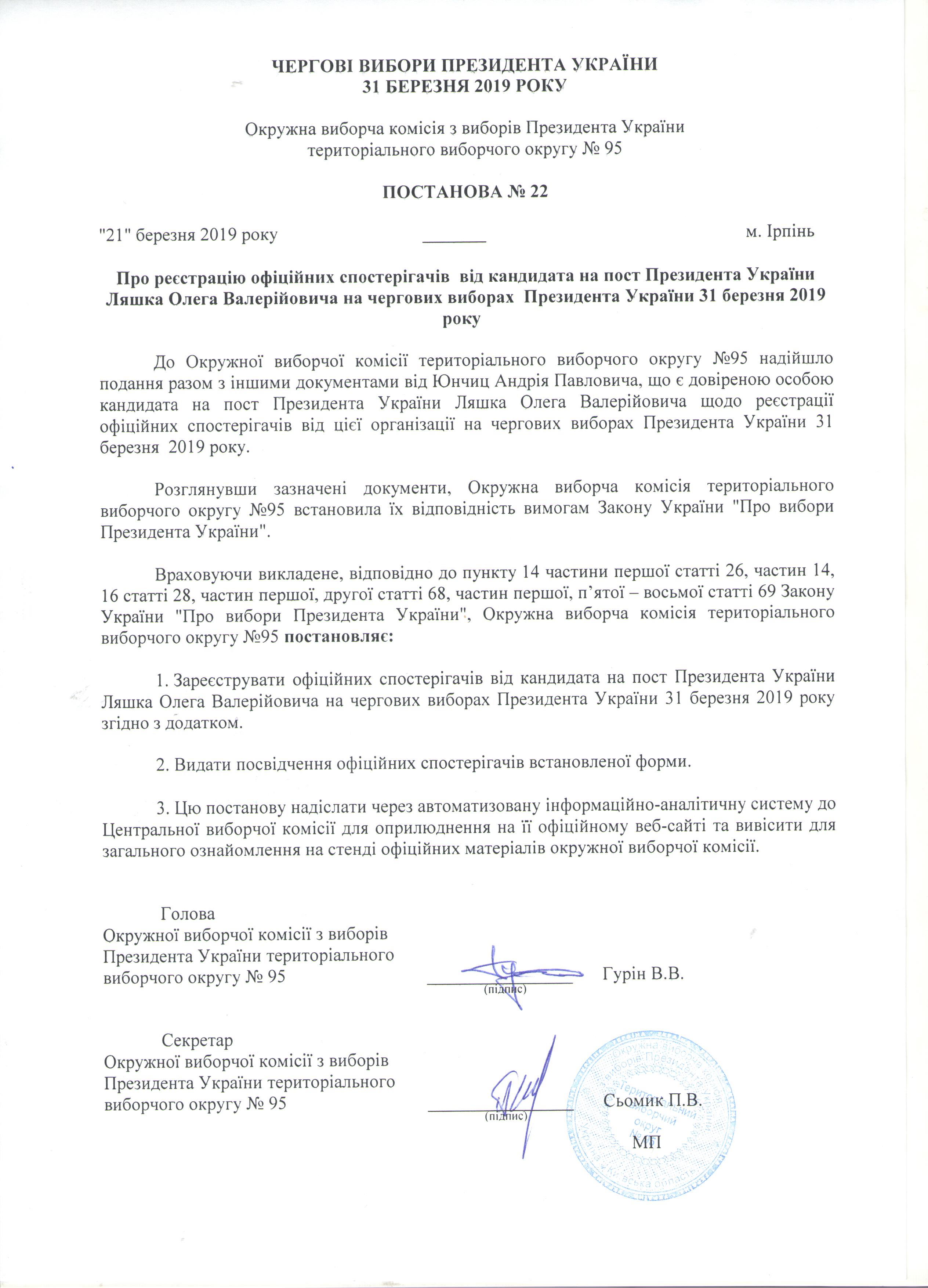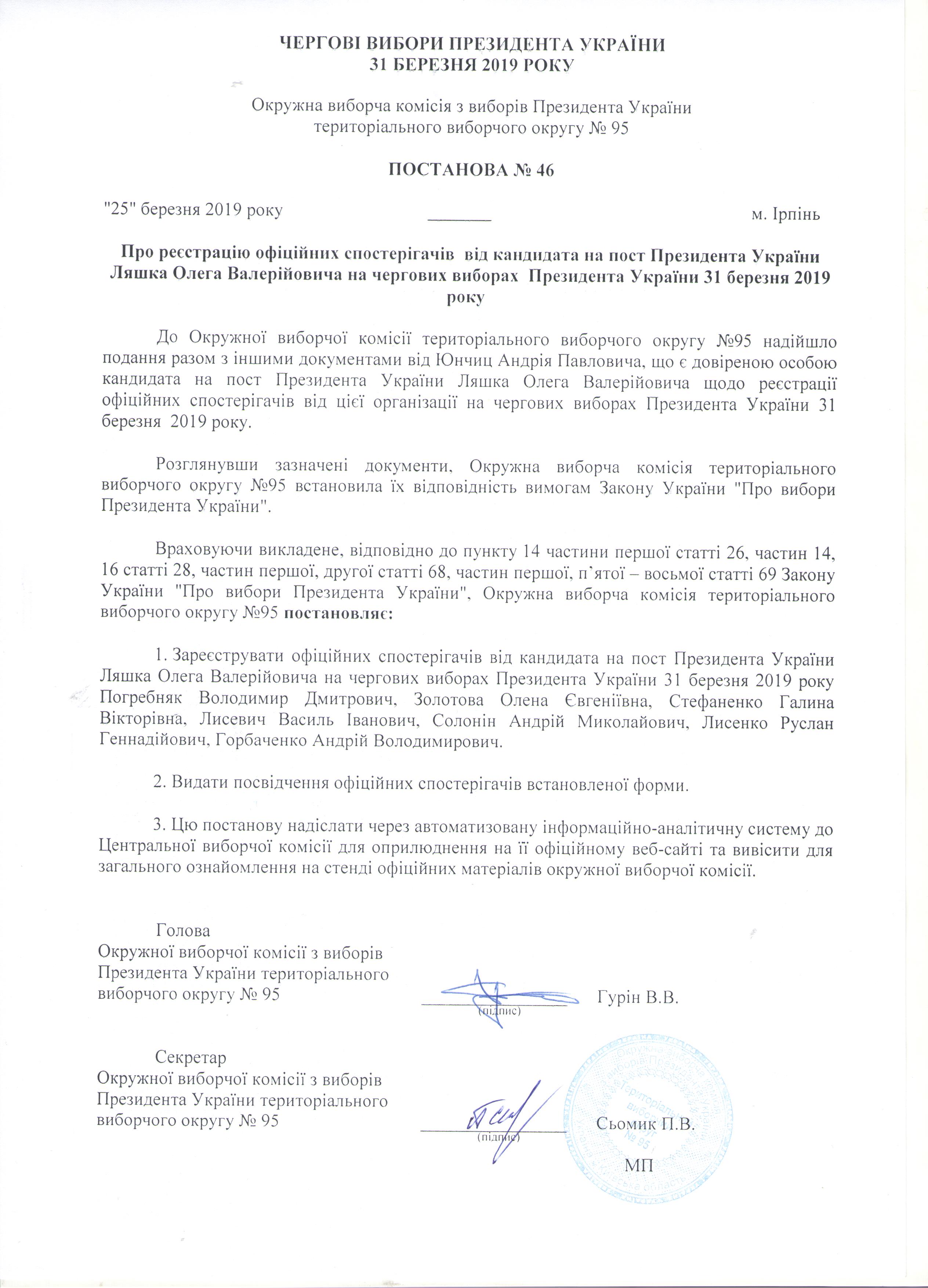 Про реєстрацію офіційних спостерігачів від кандидата на пост Президента України Ляшка Олега Валерійовича на чергових виборах Президента України 31 березня 2019 року |