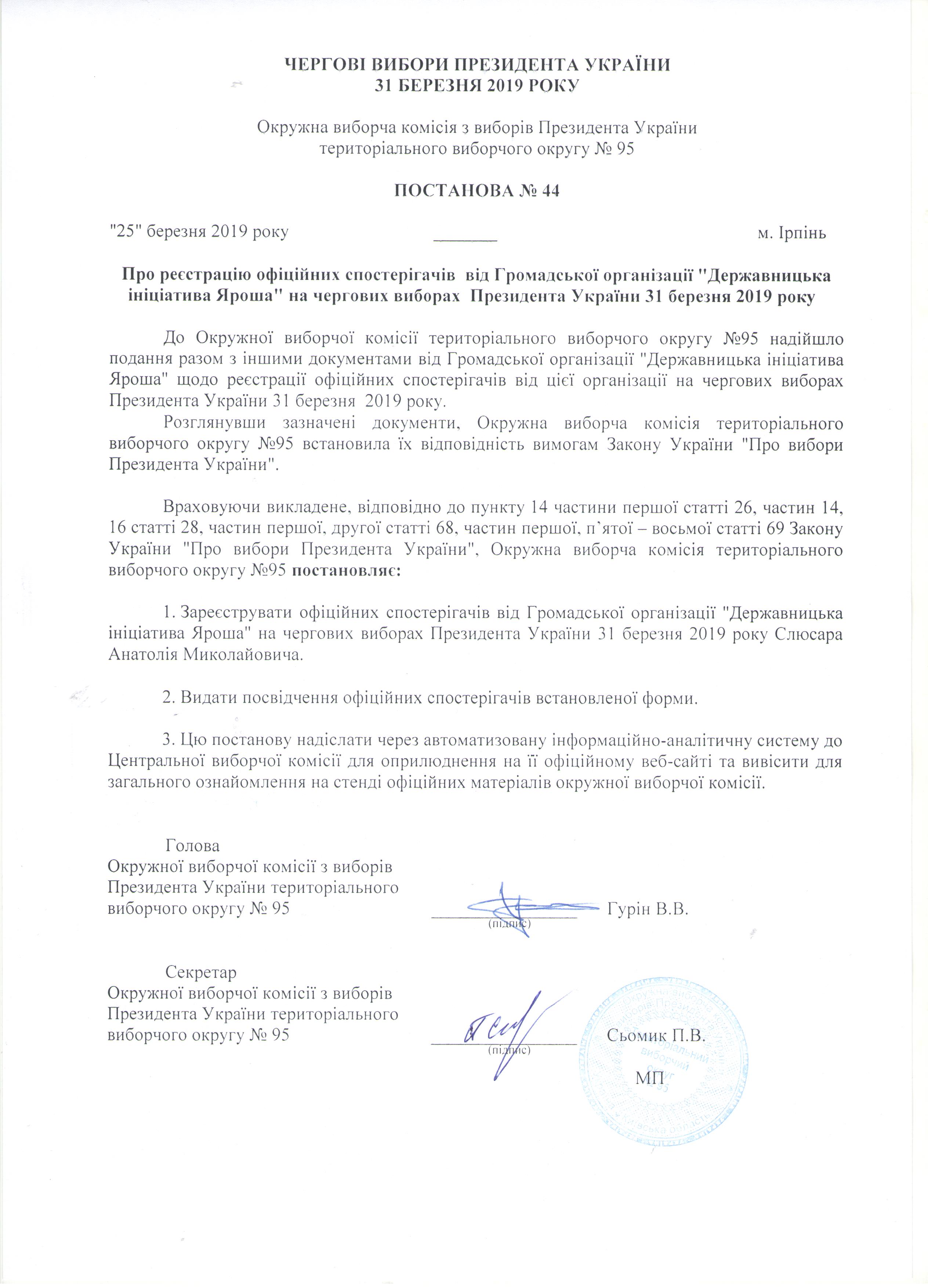 Про реєстрацію офіційних спостерігачів від Громадської організації "Державницька ініціатива Яроша" на чергових виборах Президента України 31 березня 2019 року |