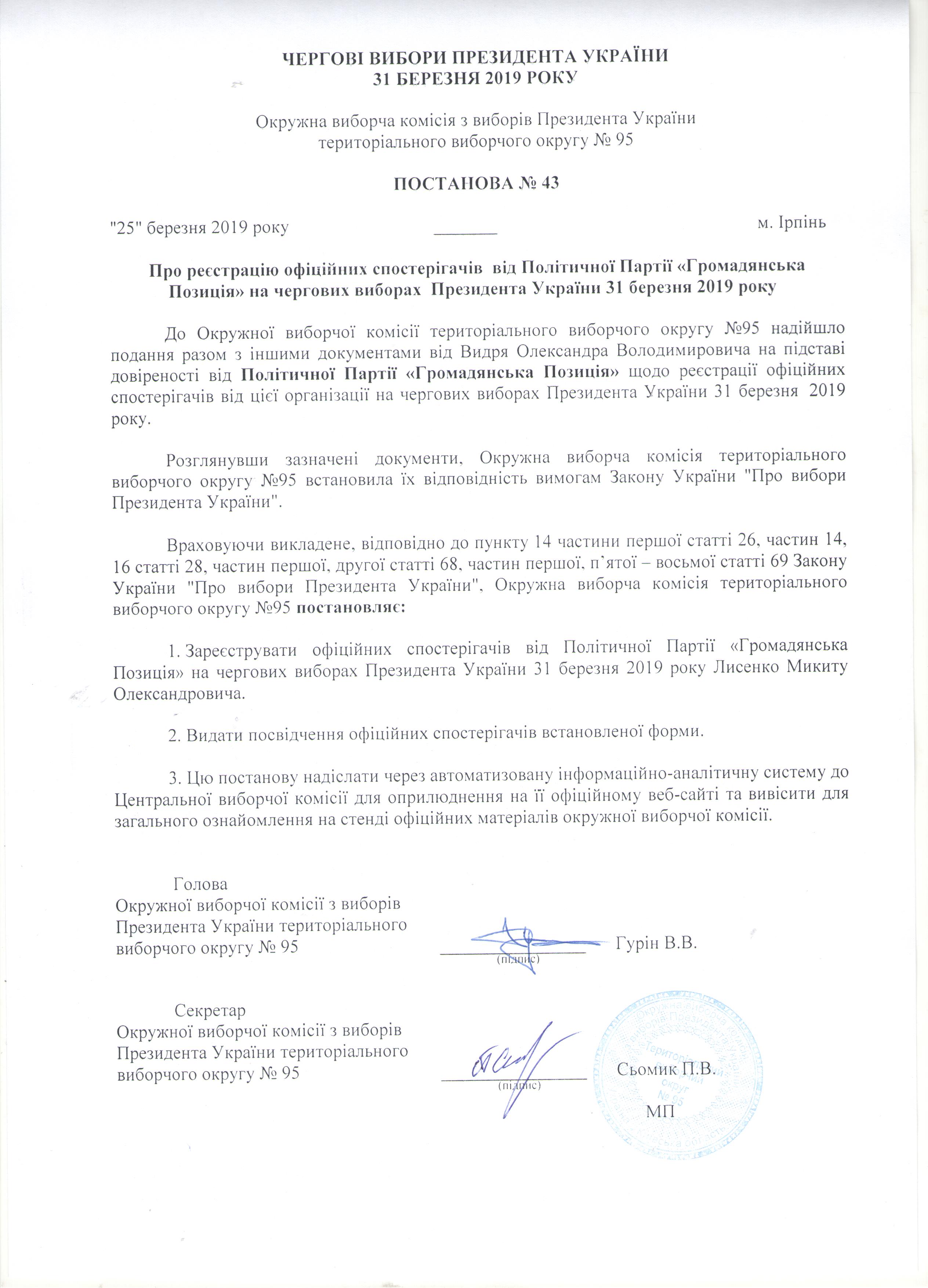 Про реєстрацію офіційних спостерігачів від Політичної Партії "Громадянська Позиція" на чергових виборах Президента України 31 березня 2019 року |