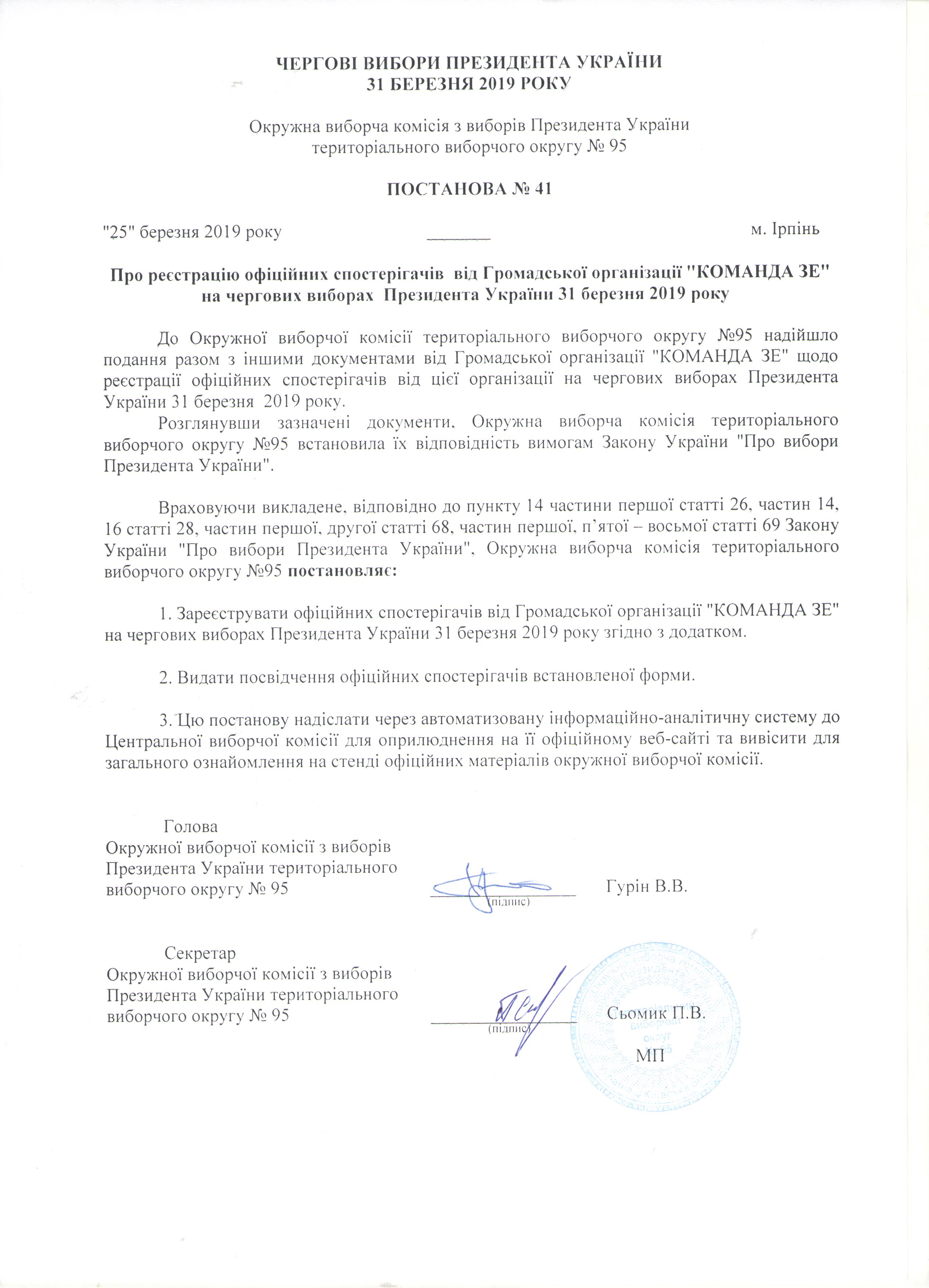 Про реєстрацію офіційних спостерігачів від Громадської організації "КОМАНДА ЗЕ" на чергових виборах Президента України 31 березня 2019 року |
