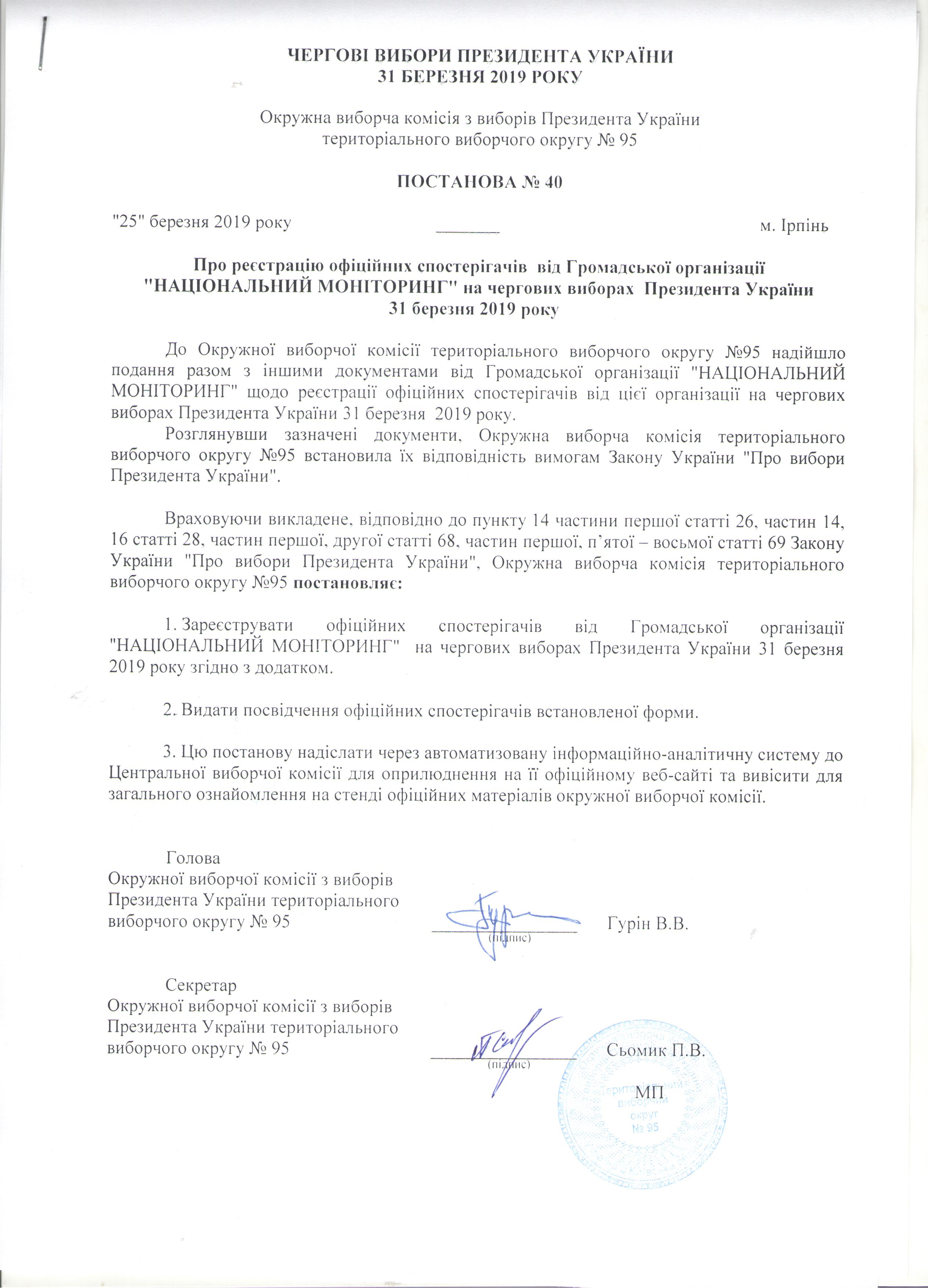 Про реєстрацію офіційних спостерігачів від Громадської організації "НАЦІОНАЛЬНИЙ МОНІТОРИНГ" на чергових виборах Президента України 31 березня 2019 року |