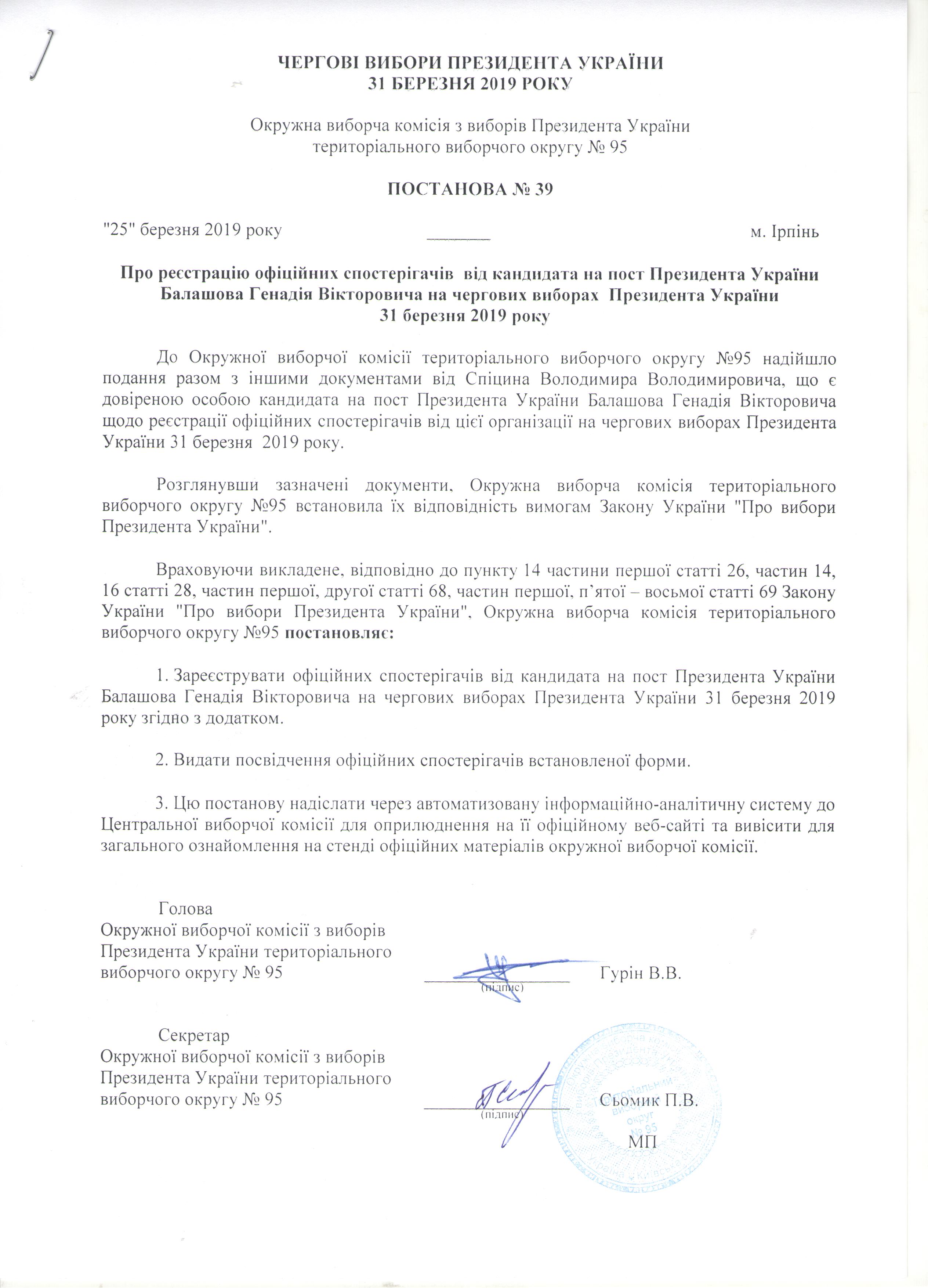 Про реєстрацію офіційних спостерігачів від кандидата на пост Президента України Балашова Генадія Вікторовича на чергових виборах Президента України 31 березня 2019 року |