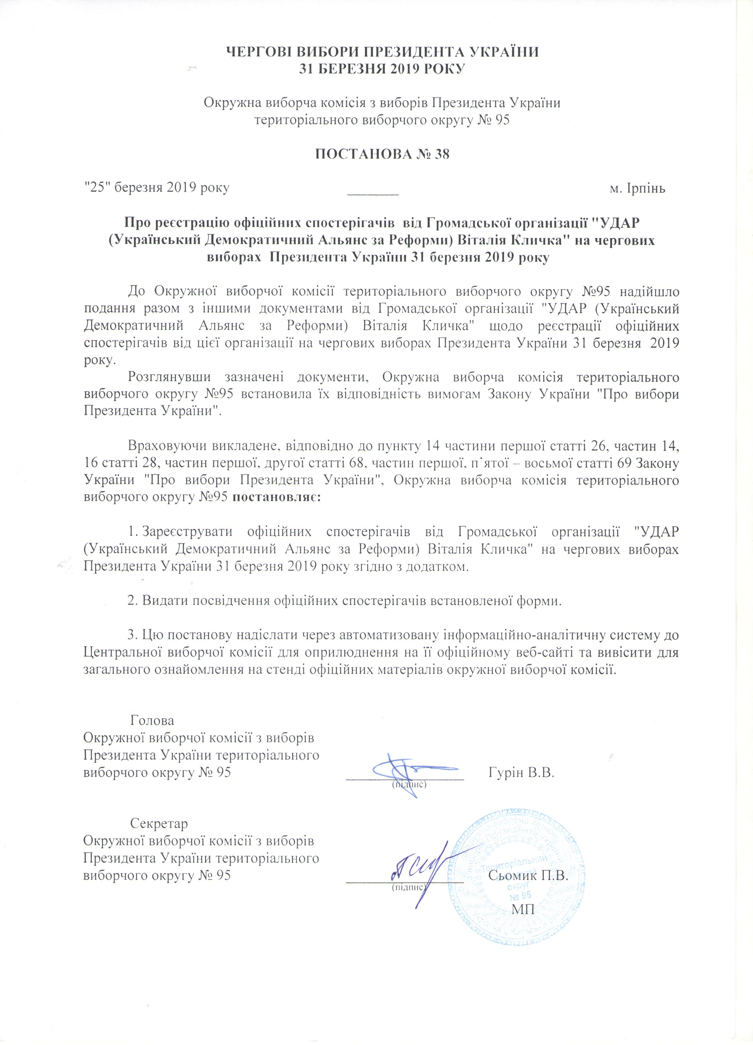 Про реєстрацію офіційних спостерігачів від Всеукраїнської громадської організації "Громадянська мережа "ОПОРА" " на чергових виборах Президента України 31 березня 2019 рок |