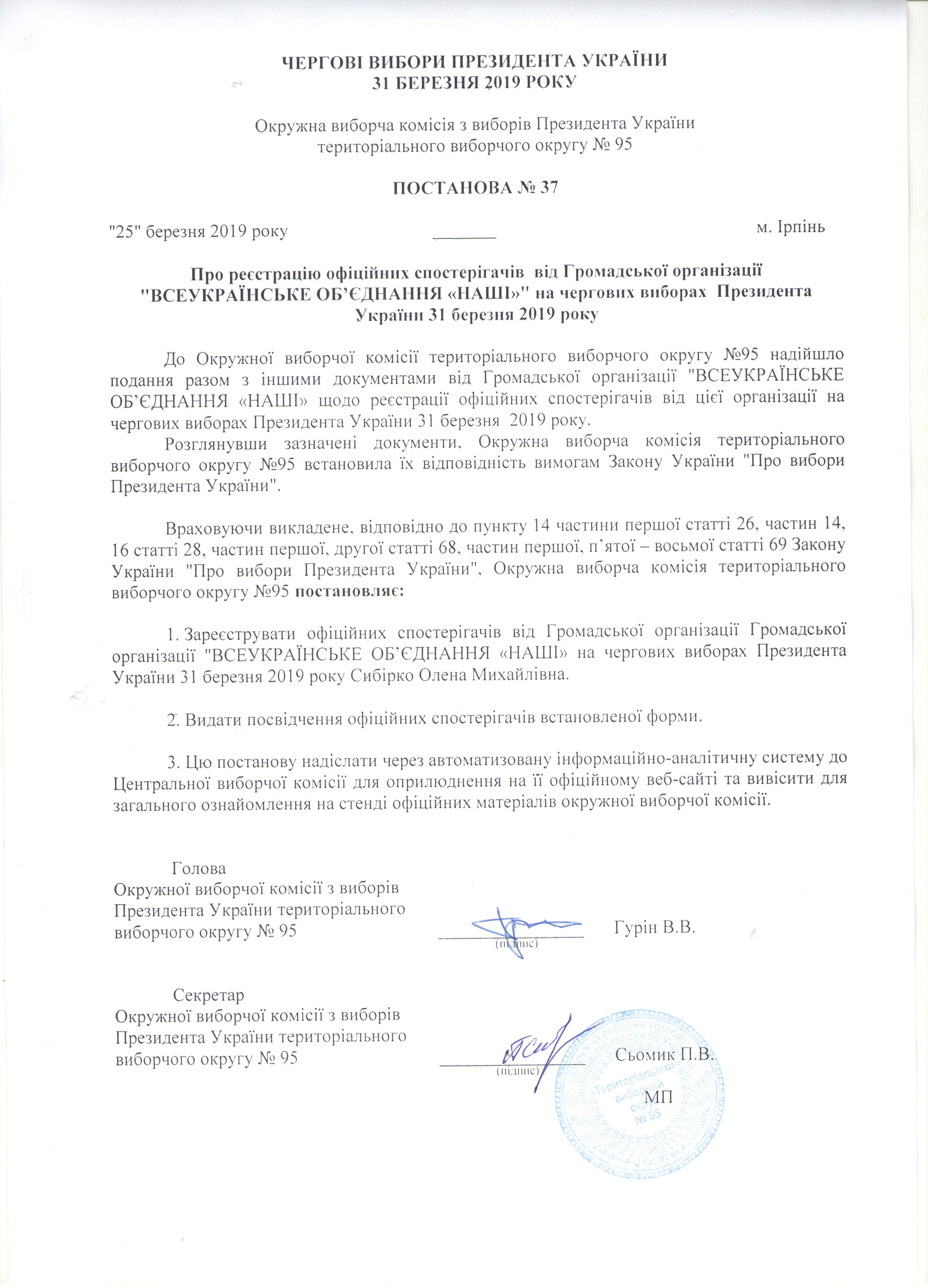 Про реєстрацію офіційних спостерігачів від Громадської організації ""ВСЕУКРАЇНСЬКЕ ОБ'ЄДНАННЯ"НАШІ"" на чергових виборах Президента України 31 березня 2019 року |