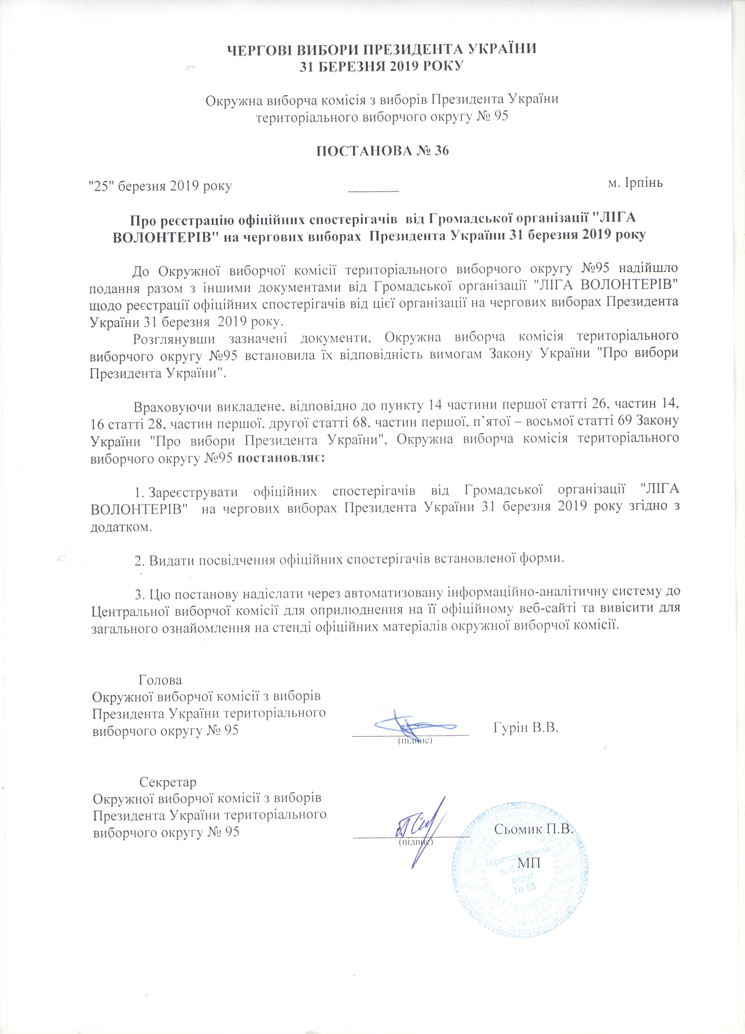 Про реєстрацію офіційних спостерігачів від Громадської організації "ЛІГА ВОЛОНТЕРІВ"" на чергових виборах Президента України 31 березня 2019 року |