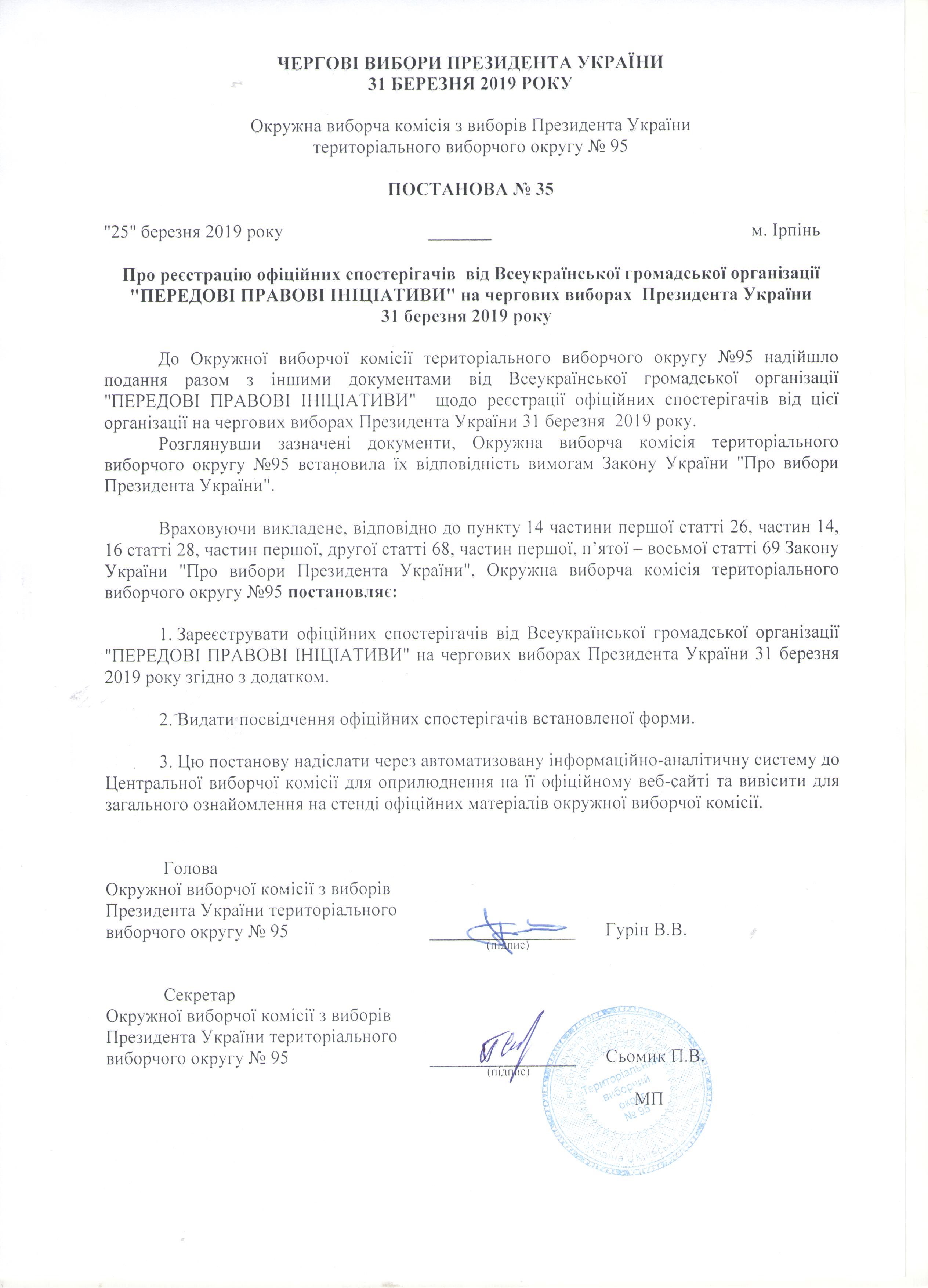 Про реєстрацію офіційних спостерігачів від Всеукраїнської громадської організації "ПЕРЕДОВІ ПРАВОВІ ІНІЦІАТИВИ" на чергових виборах Президента України 31 березня 2019 року |
