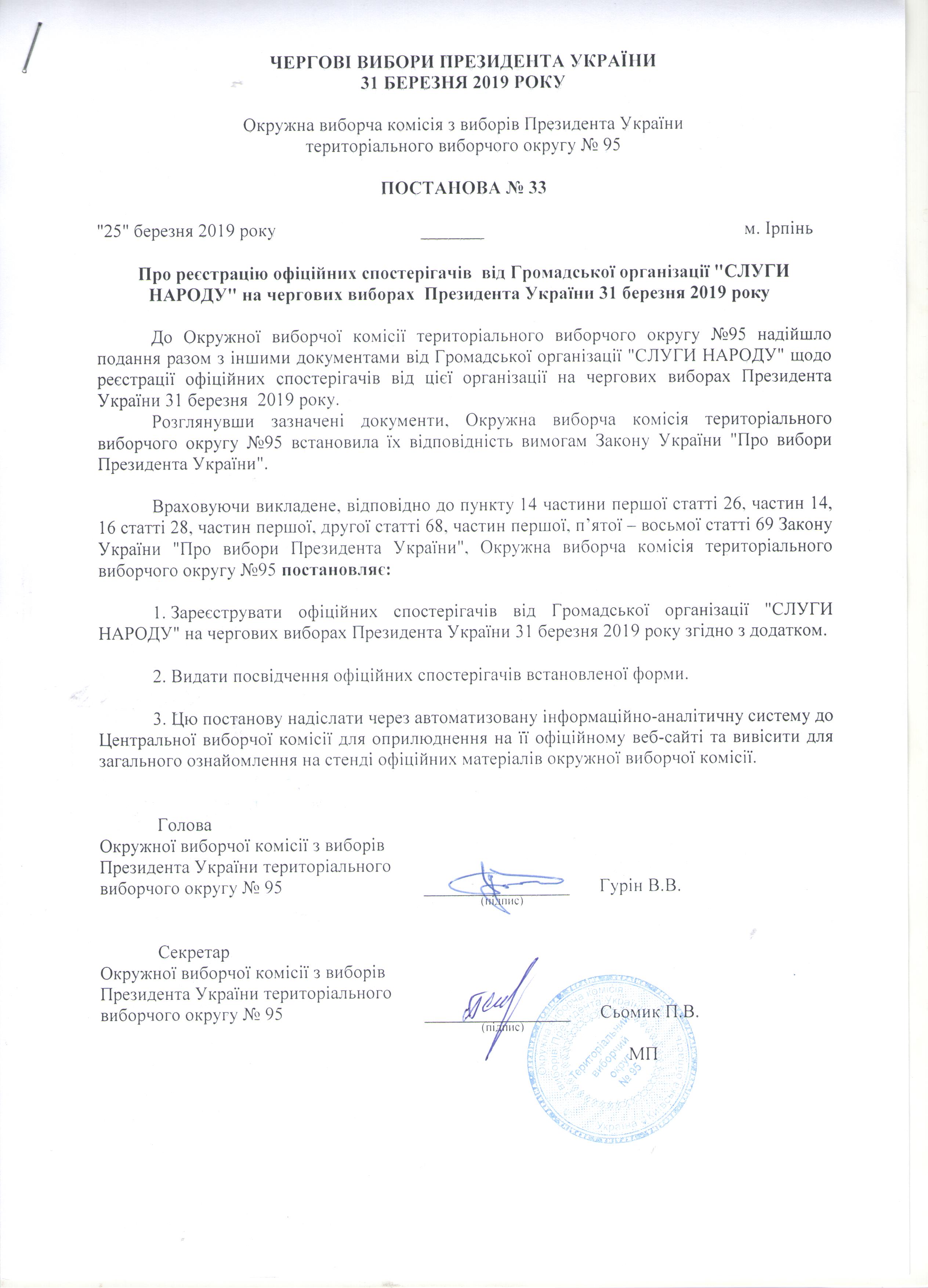 Про реєстрацію офіційних спостерігачів від Громадської організації "СЛУГИ НАРОДУ" на чергових виборах Президента України 31 березня 2019 року |