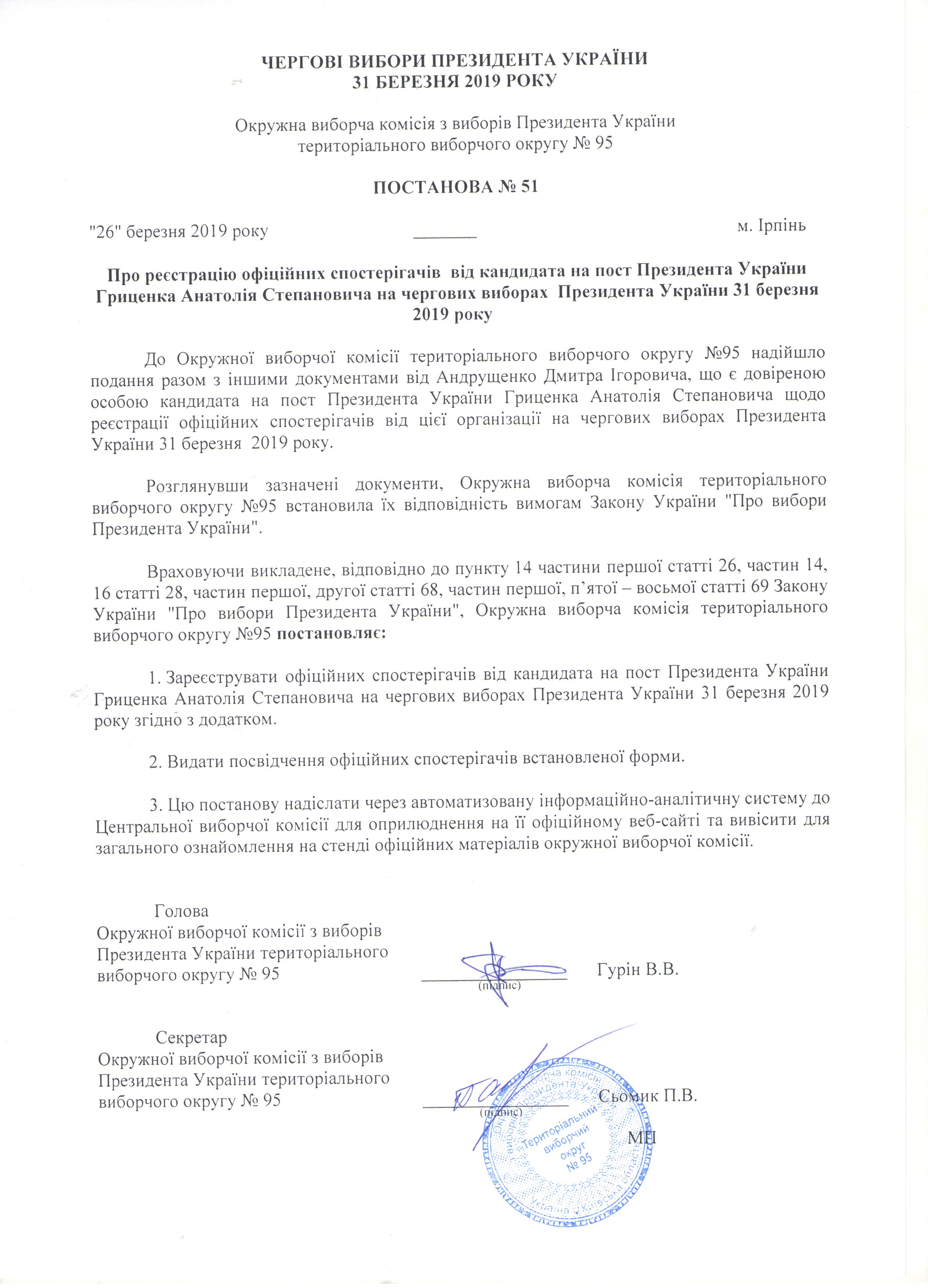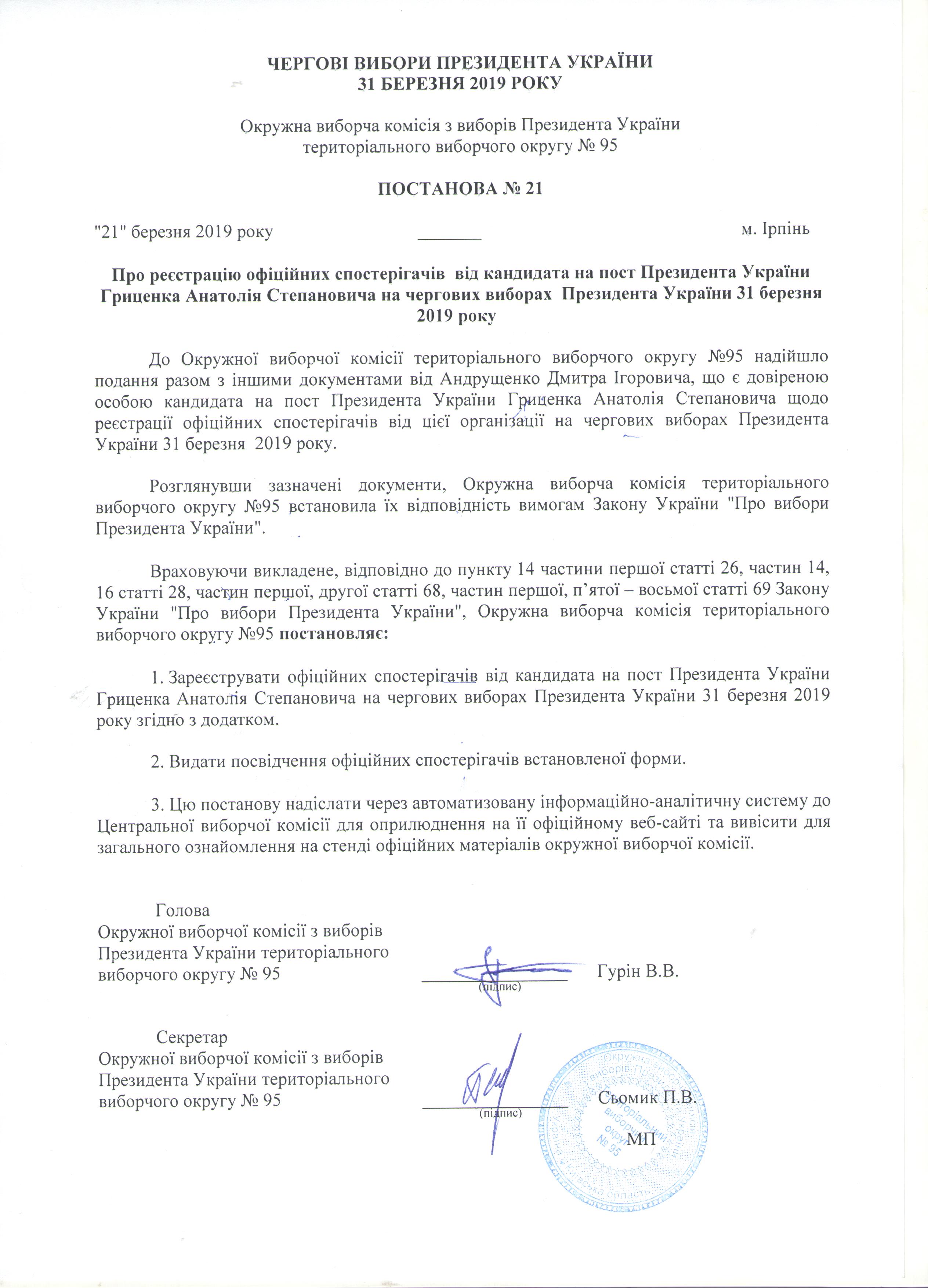 Про реєстрацію офіційних спостерігачів від кандидата на пост Президента України Гриценка Анатолія Степановича на чергових виборах Президента України 31 березня 2019 року |