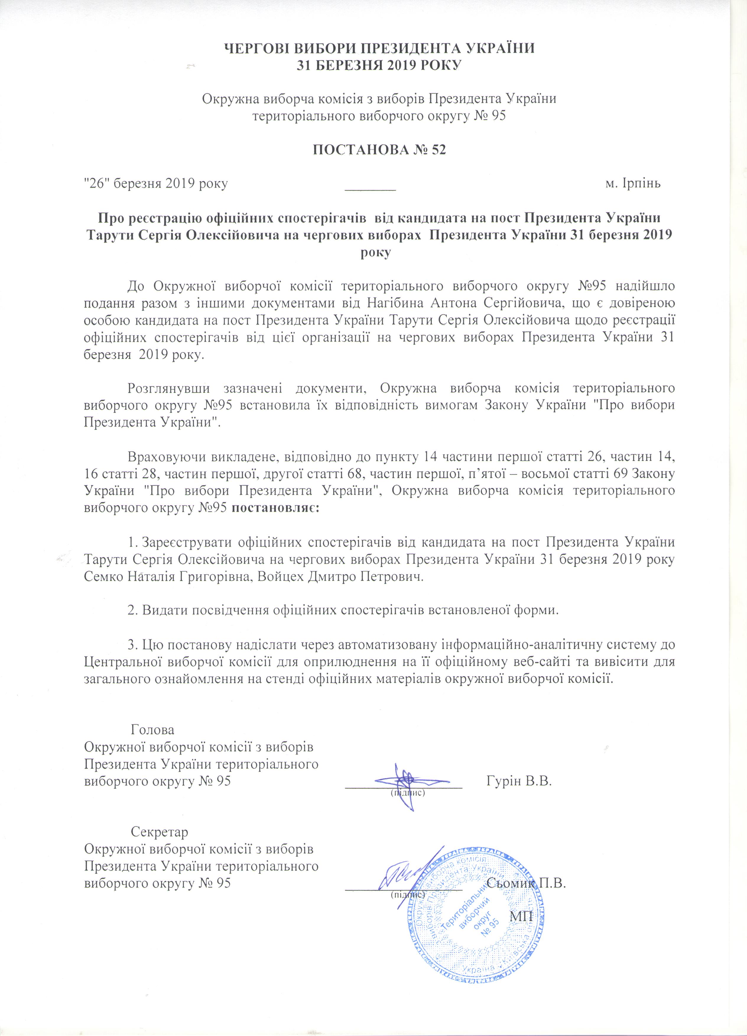 Про реєстрацію офіційних спостерігачів від кандидата на пост Президента України Тарути Сергія Олексійовича на чергових виборах Президента України 31 березня 2019 року |