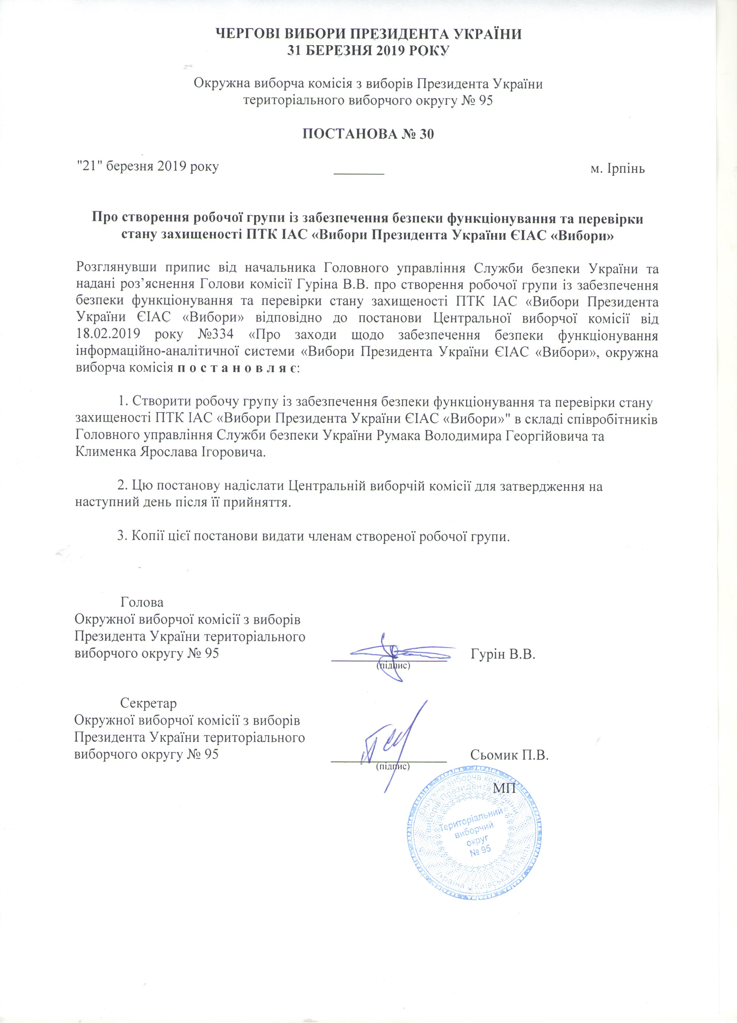 Про створення групи із забезпечення безпеки функціонування та перевірки стану захищеності ПТК ІАС "Вибори Президента України ЄІАС"Вибори" " |