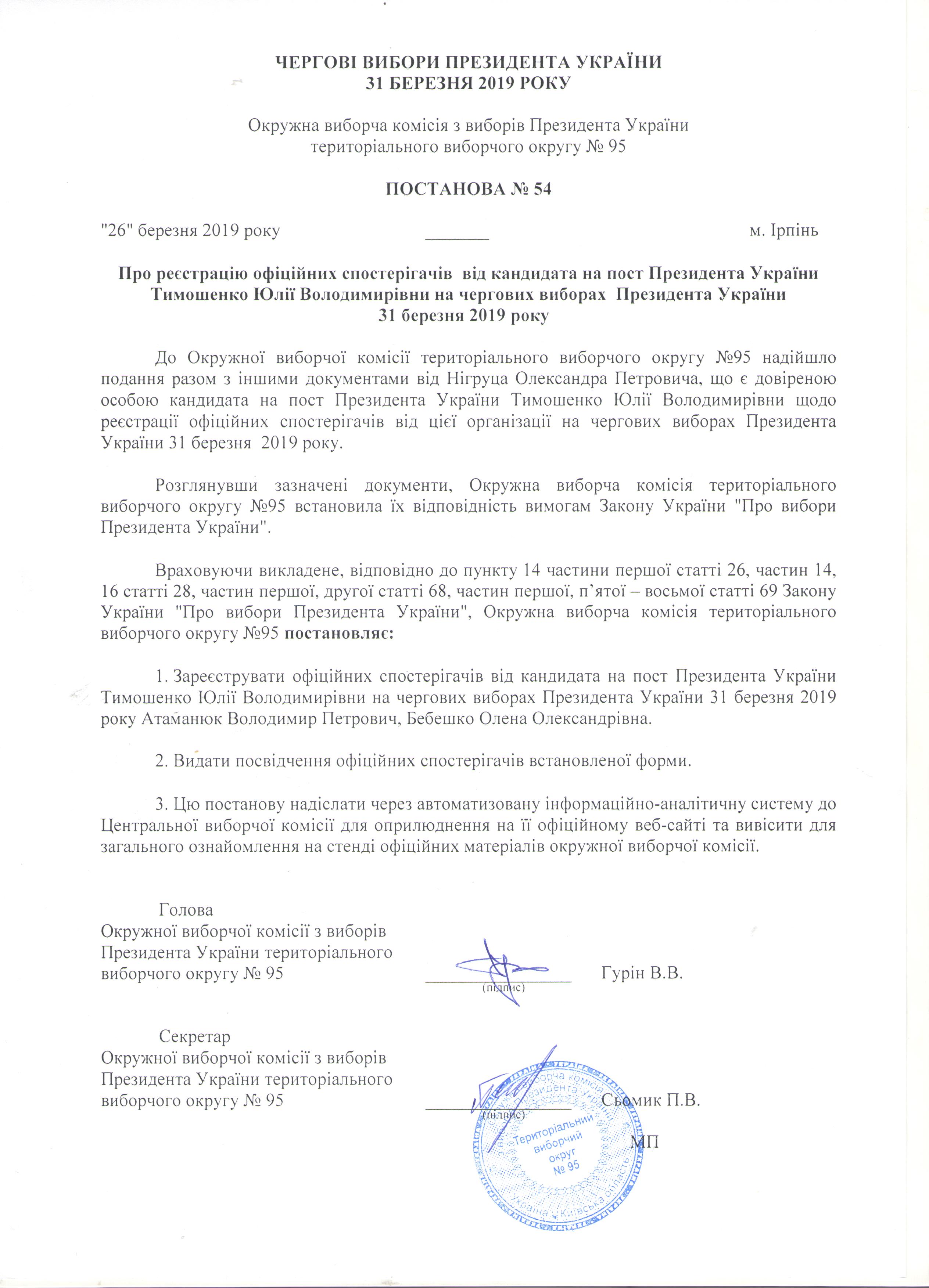 Про реєстрацію офіційних спостерігачів від кандидата на пост Президента України Тимошенко Юлії Володимирівни на чергових виборах Президента України 31 березня 2019 року |