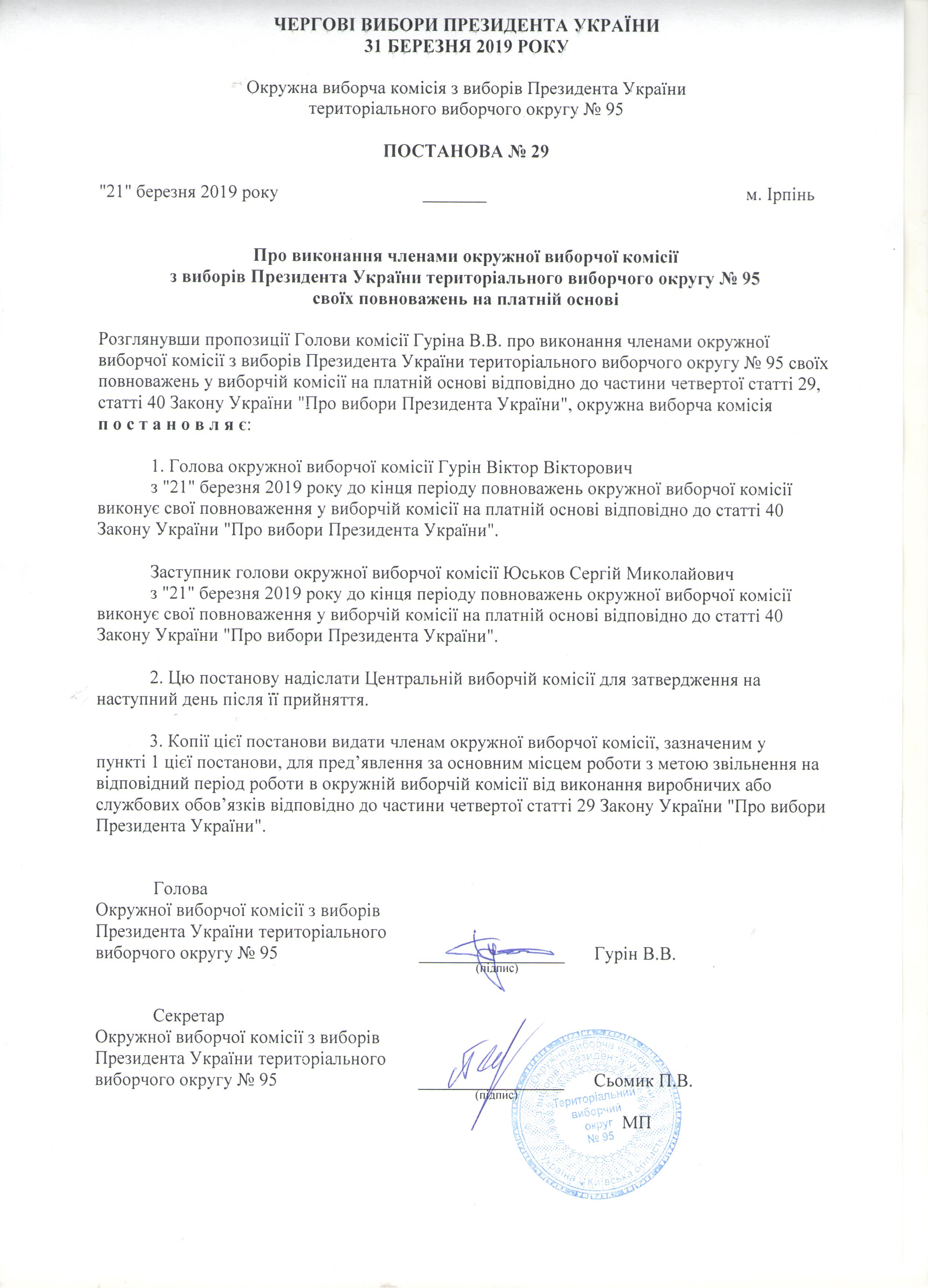 Про виконання членами окружної виборчої комісії з виборів Президента України територіального виборчого округу №95 своїх повноважень на платній основі |