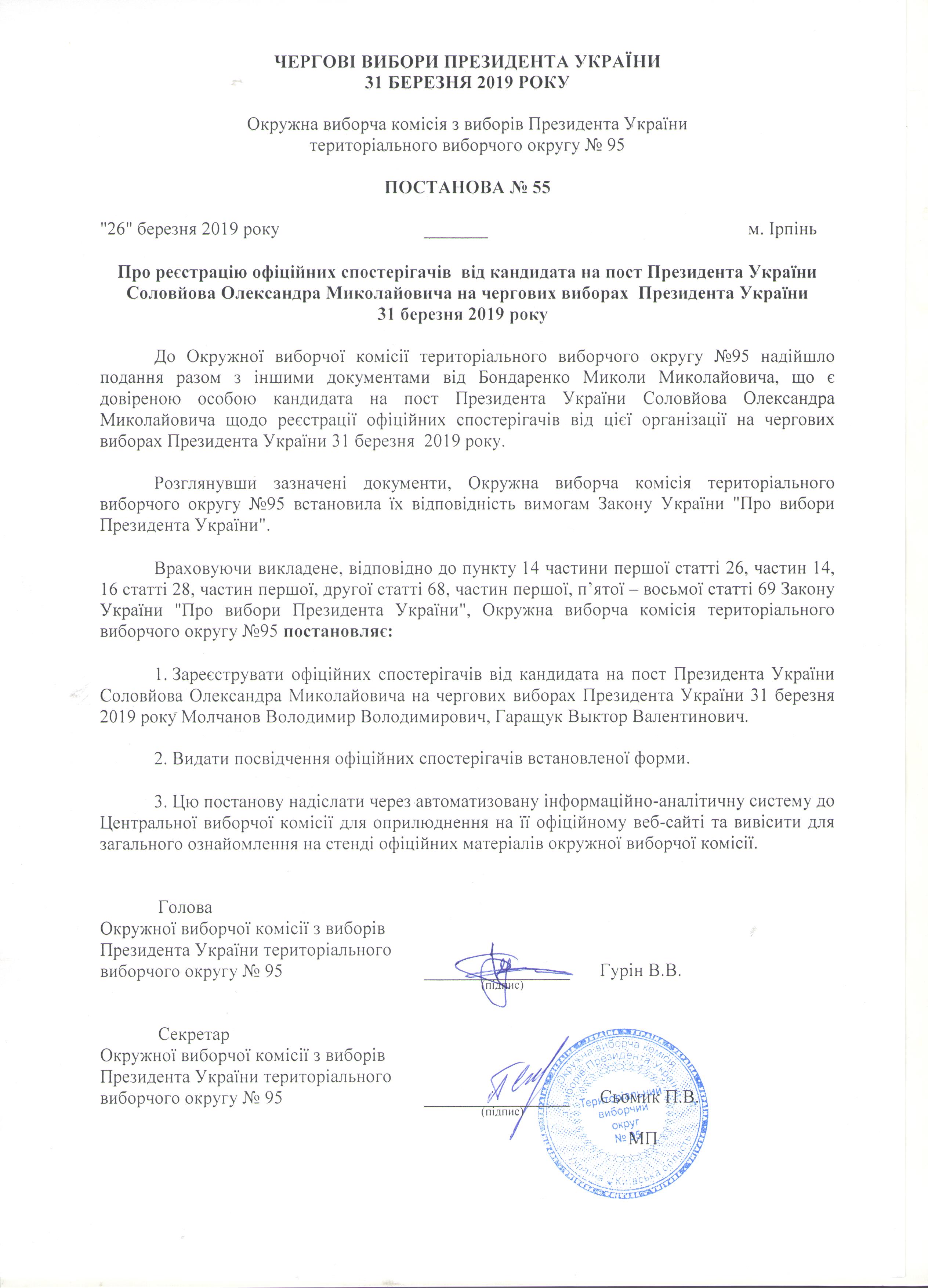 Про реєстрацію офіційних спостерігачів від кандидата на пост Президента України Соловйова Олександра Миколайовича на чергових виборах Президента України 31 березня 2019 року |