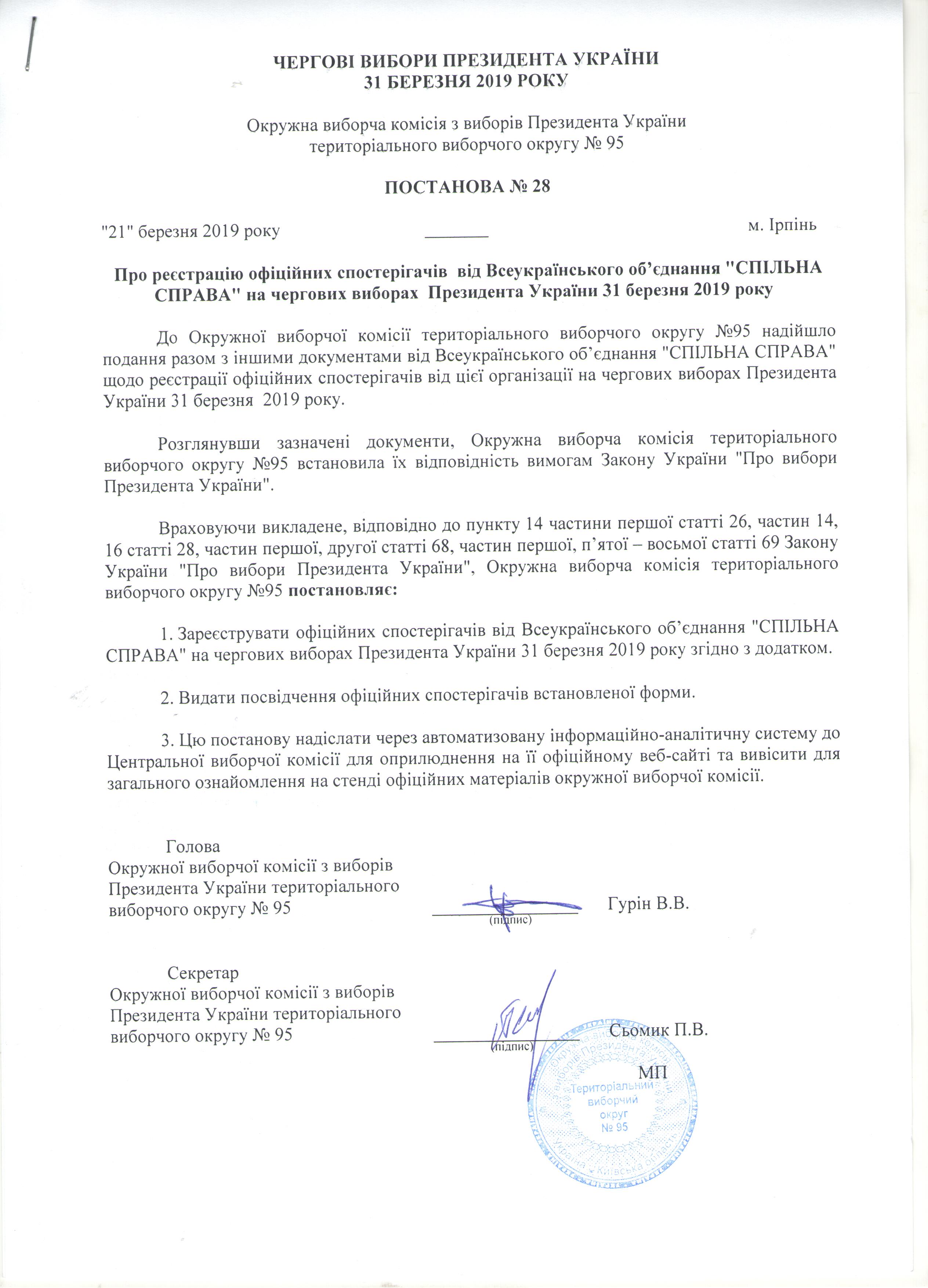 Про реєстрацію офіційних спостерігачів від Всеукраїнського об'єднання "СПІЛЬНА СПРАВА" на чергових виборах Президента України 31 березня 2019 рок |