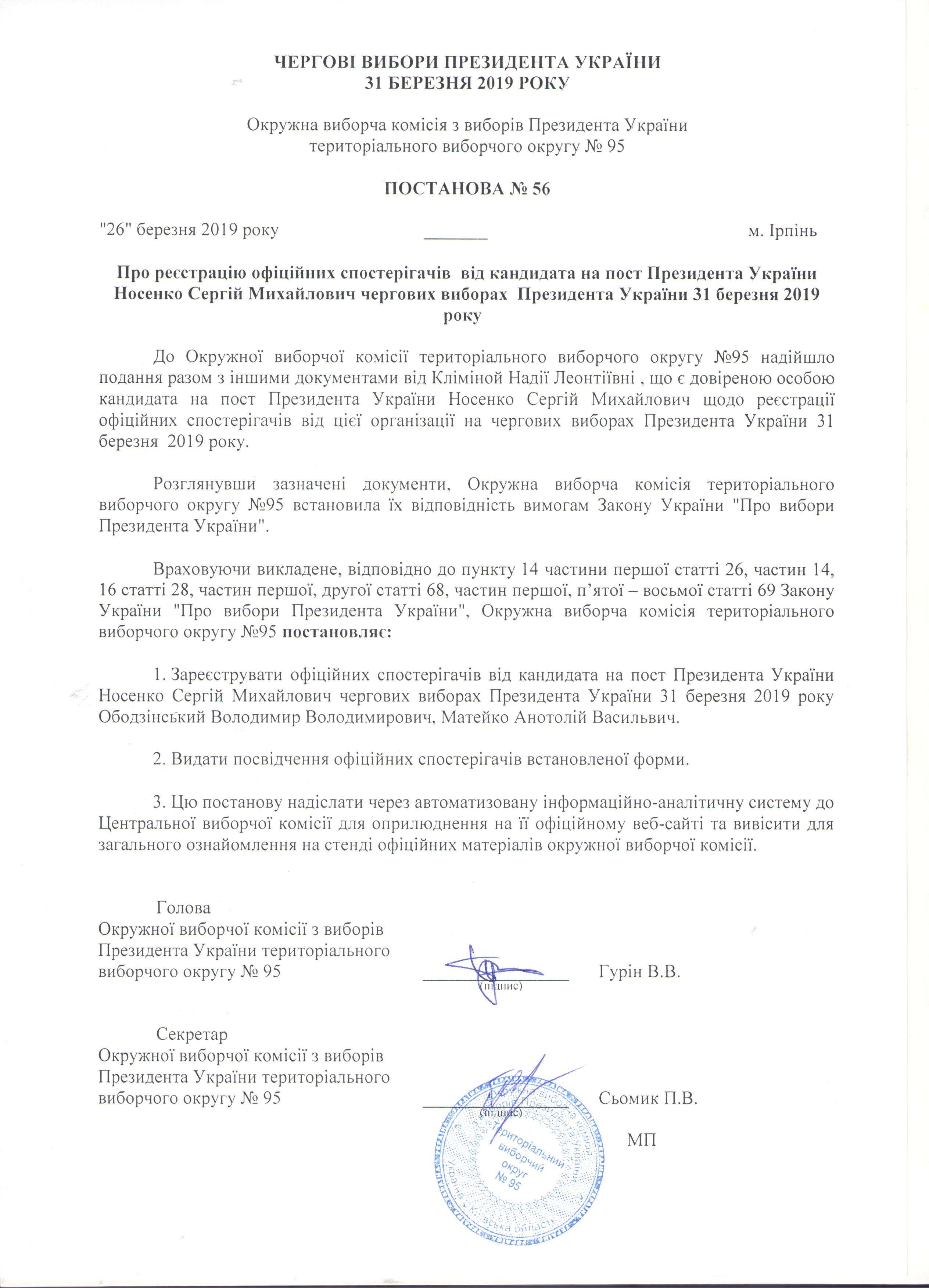 Про реєстрацію офіційних спостерігачів від кандидата на пост Президента України Носенко Сергій Михайлович на чергових виборах Президента України 31 березня 2019 року |