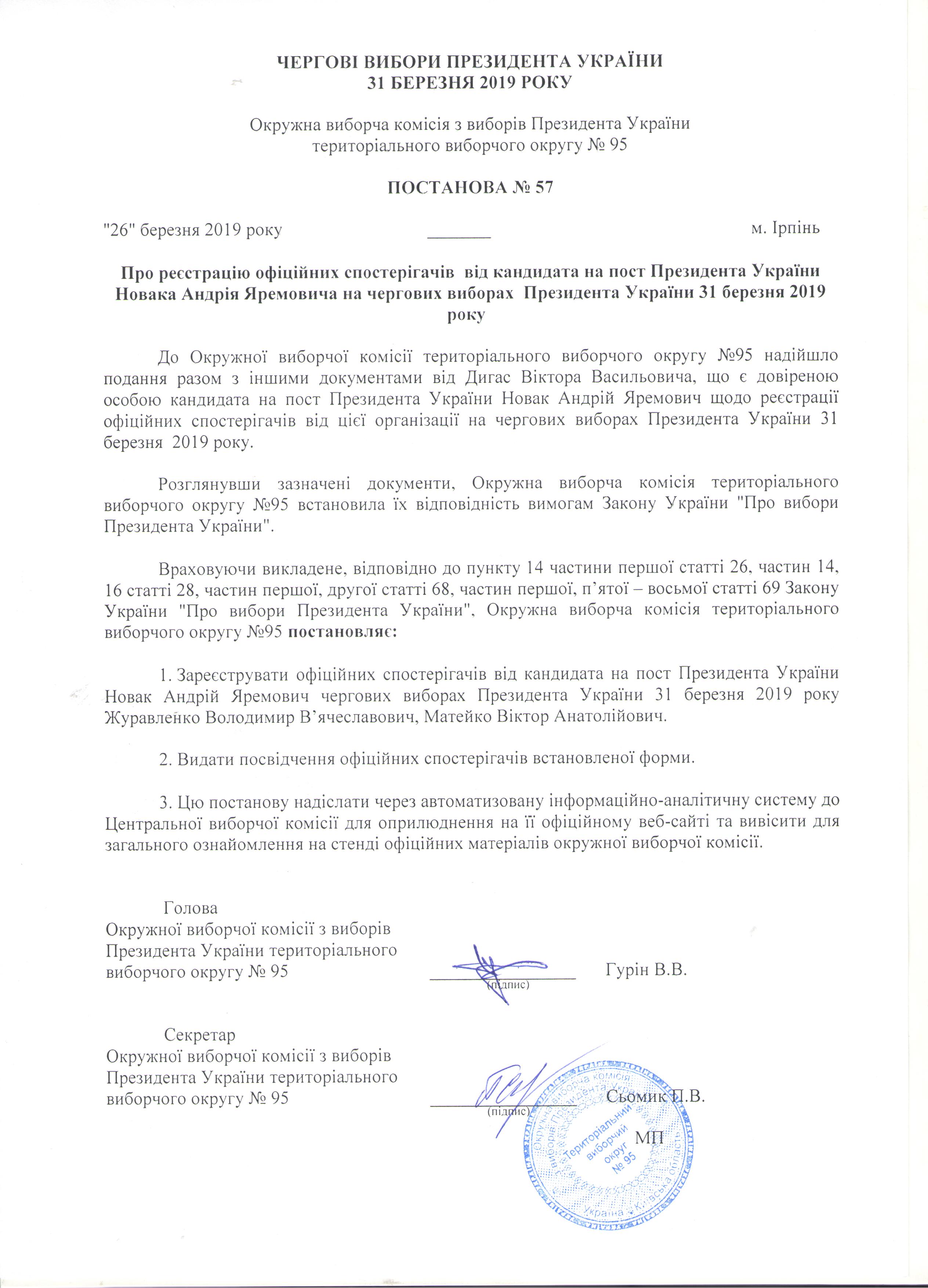 Про реєстрацію офіційних спостерігачів від кандидата на пост Президента України Новака Андрія Яремовича на чергових виборах Президента України 31 березня 2019 року |