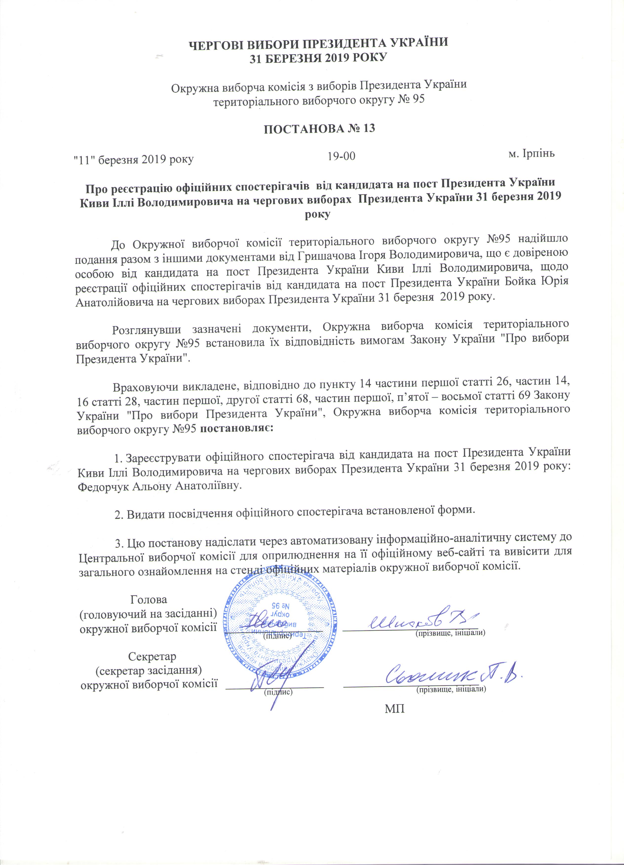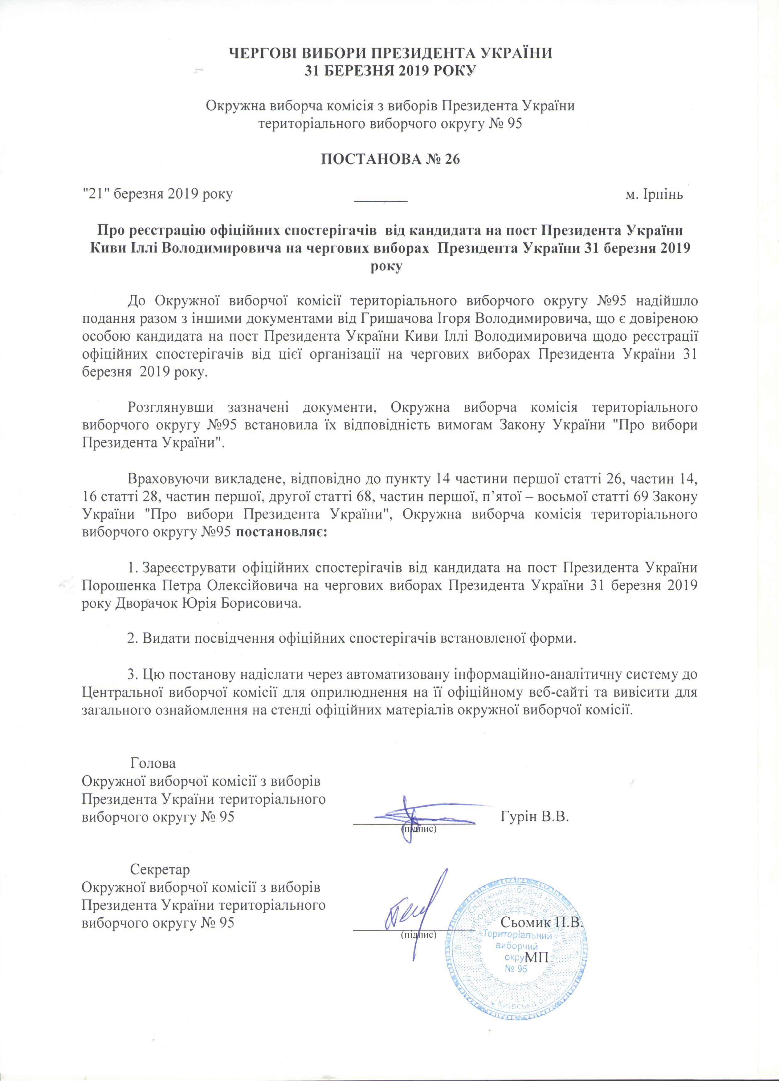 Про реєстрацію офіційних спостерігачів від кандидата на пост Президента України Киви Іллі Володимировича на чергових виборах Президента України 31 березня 2019 рок |