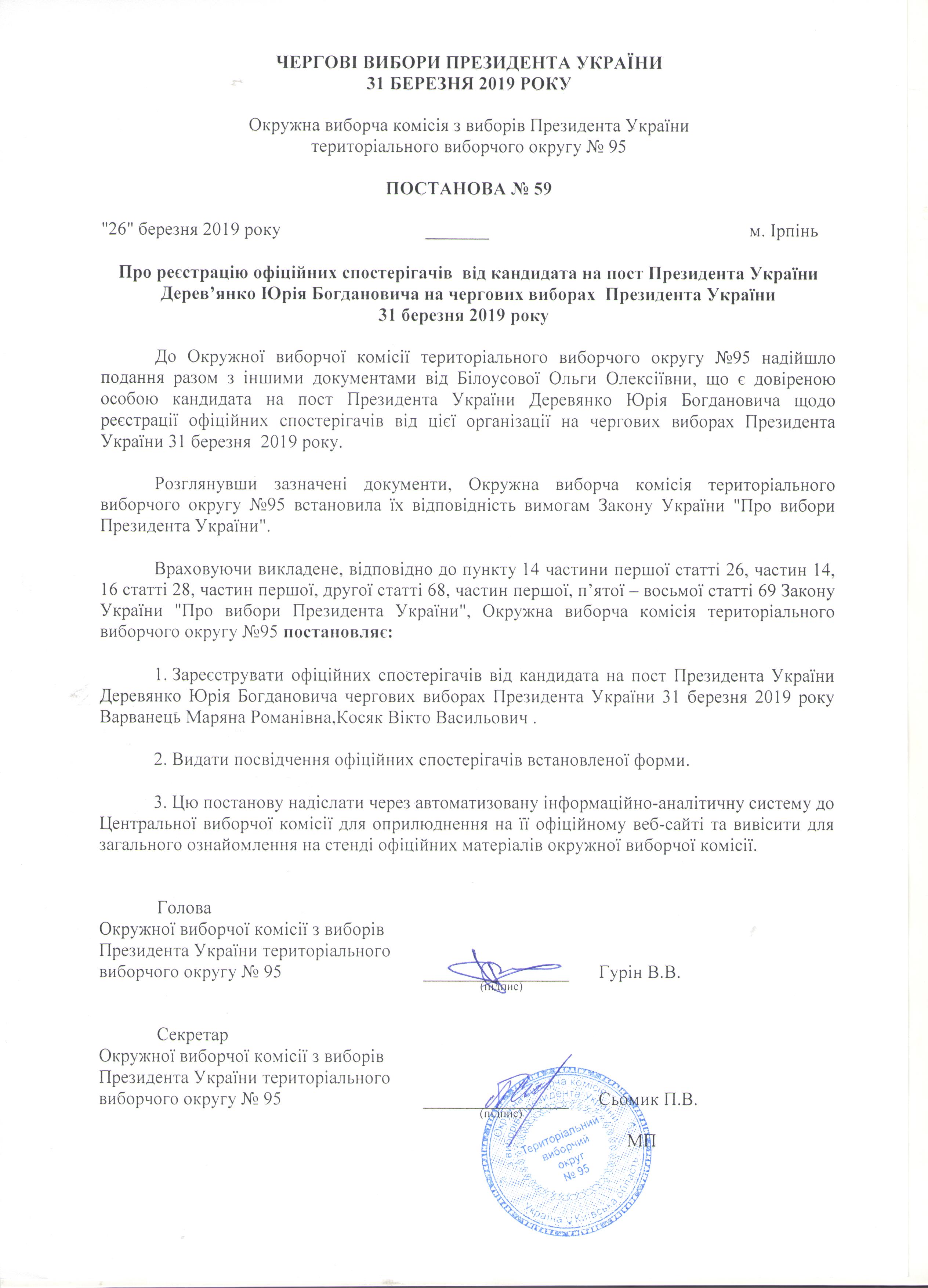 Про реєстрацію офіційних спостерігачів від кандидата на пост Президента України Дерев'янко Юрія Богдановича на чергових виборах Президента України 31 березня 2019 року |
