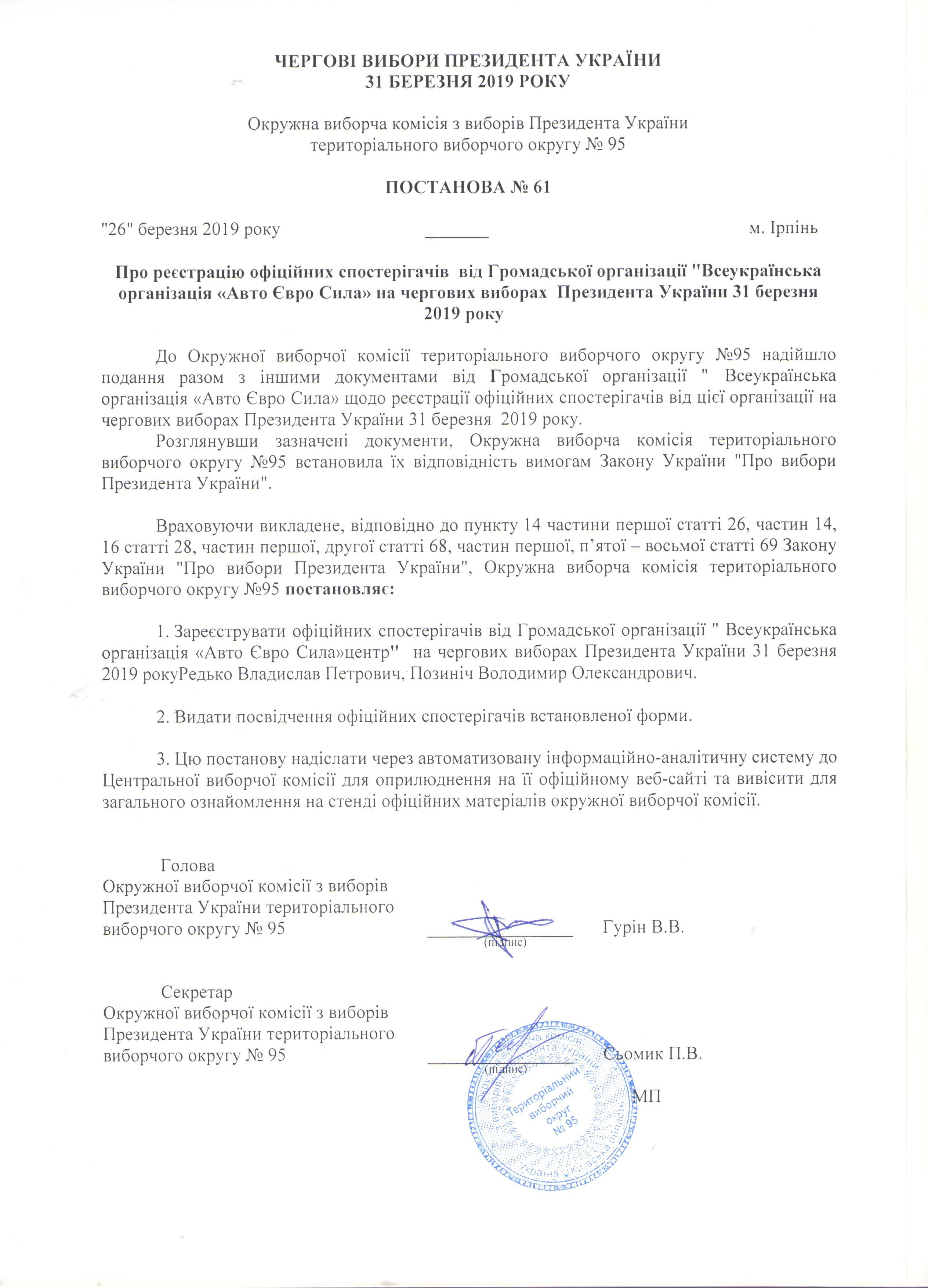 Про реєстрацію офіційних спостерігачів від Громадської організації "Всеукраїнська організація "Авто Євро Сила" на чергових виборах Президента України 31 березня 2019 року |