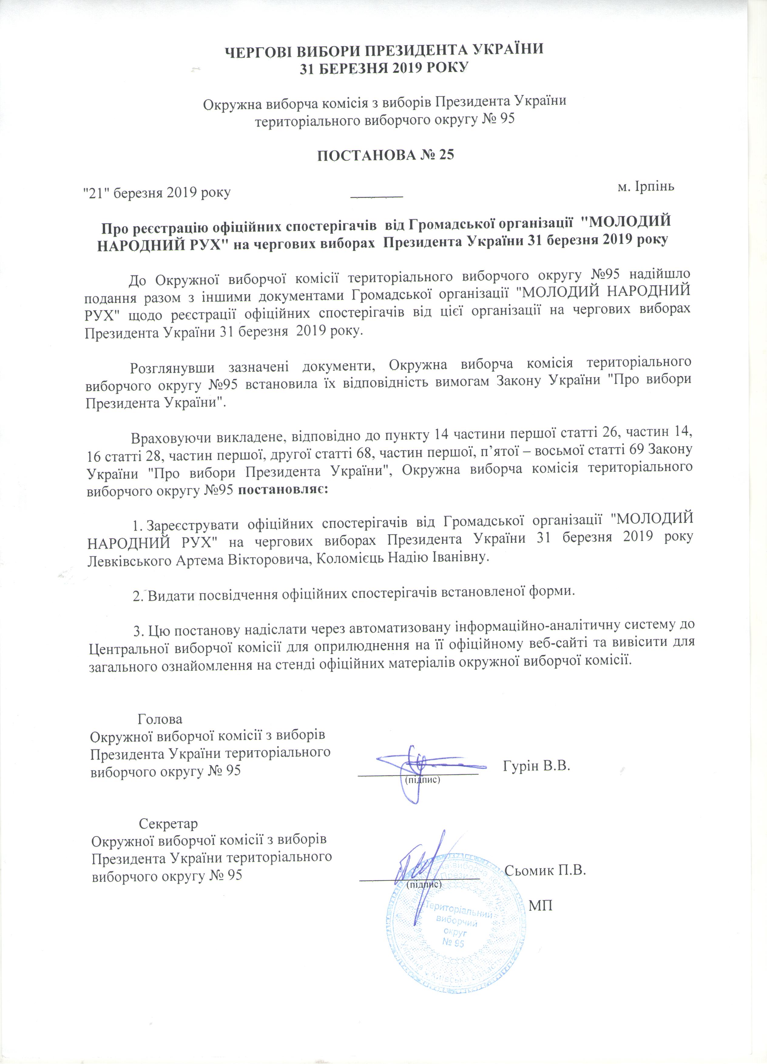 Про реєстрацію офіційних спостерігачів від Громадської організації "МОЛОДИЙ НАРОДНИЙ РУХ" на чергових виборах Президента України 31 березня 2019 року |