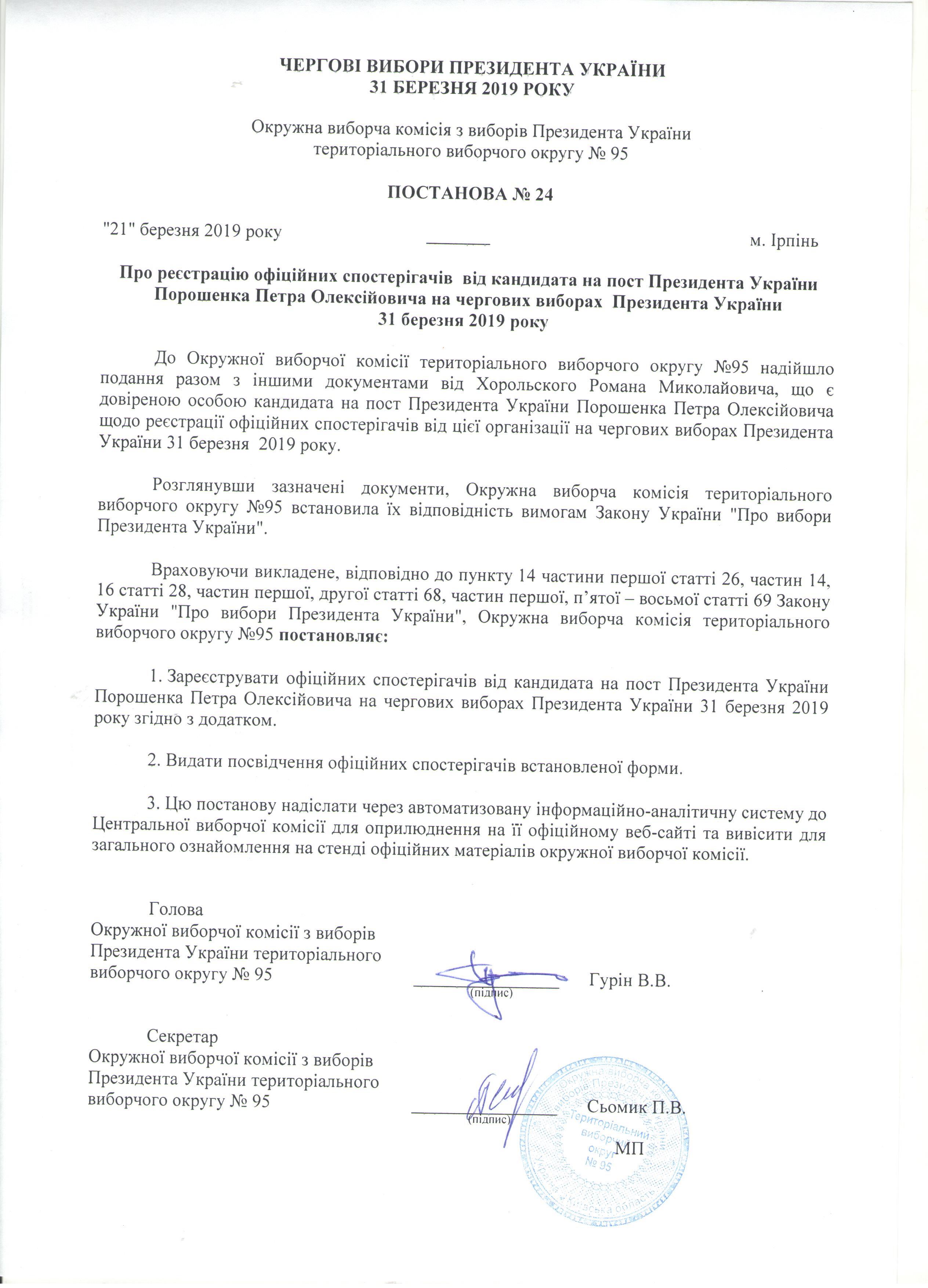 Про реєстрацію офіційних спостерігачів від кандидата на пост Президента України Порошенка Петра Олексійовича на чергових виборах Президента України 31 березня 2019 року |