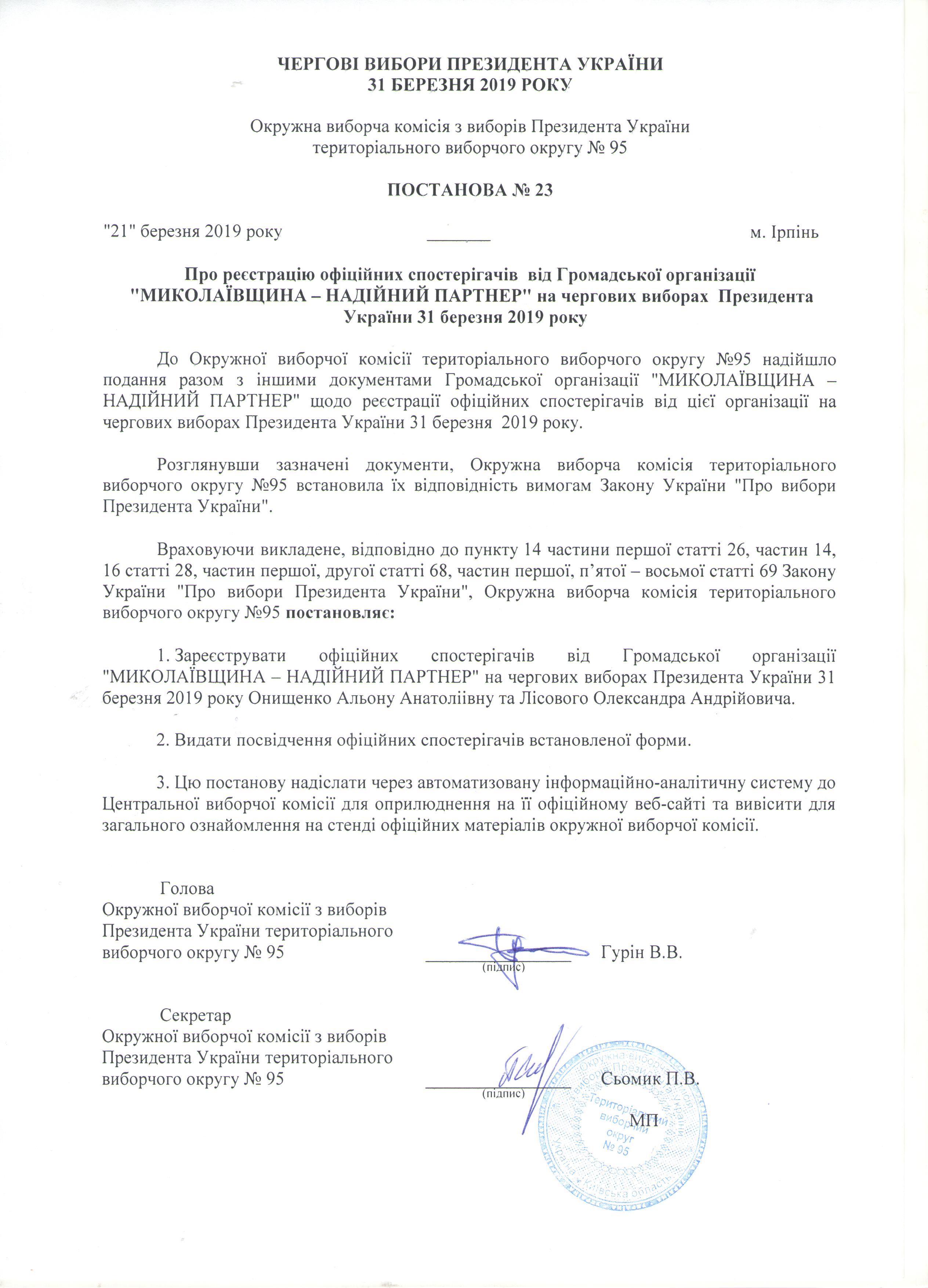Про реєстрацію офіційних спостерігачів від Громадської організації "МИКОЛАЇВЩИНА - НАДІЙНИЙ ПАРТНЕР" на чергових виборах Президента України 31 березня 2019 року |