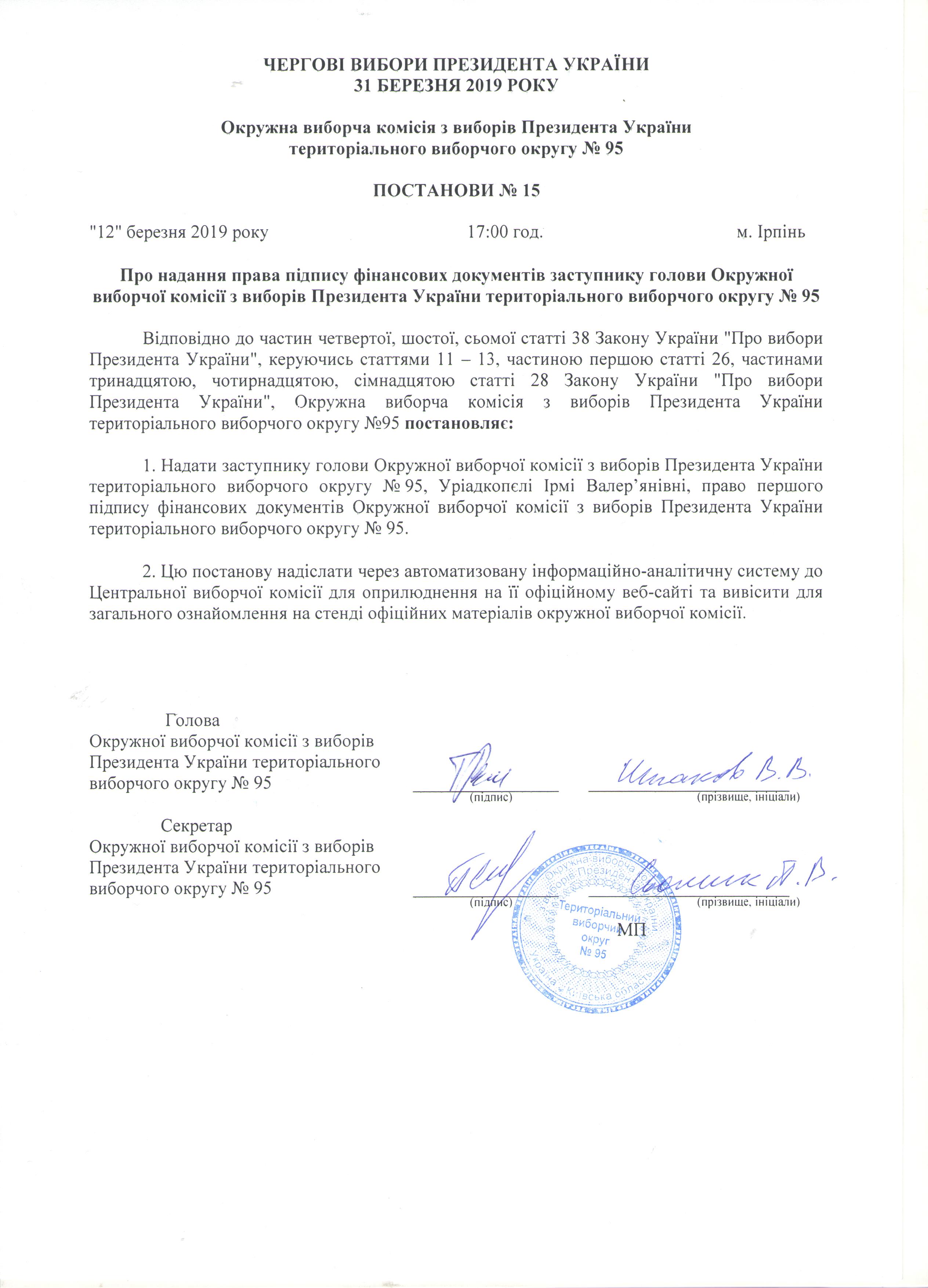 Про надання права підпису фінансових документів заступнику голови Окружної виборчої комісії з виборів Президента України територіального виборчого округу №95 |