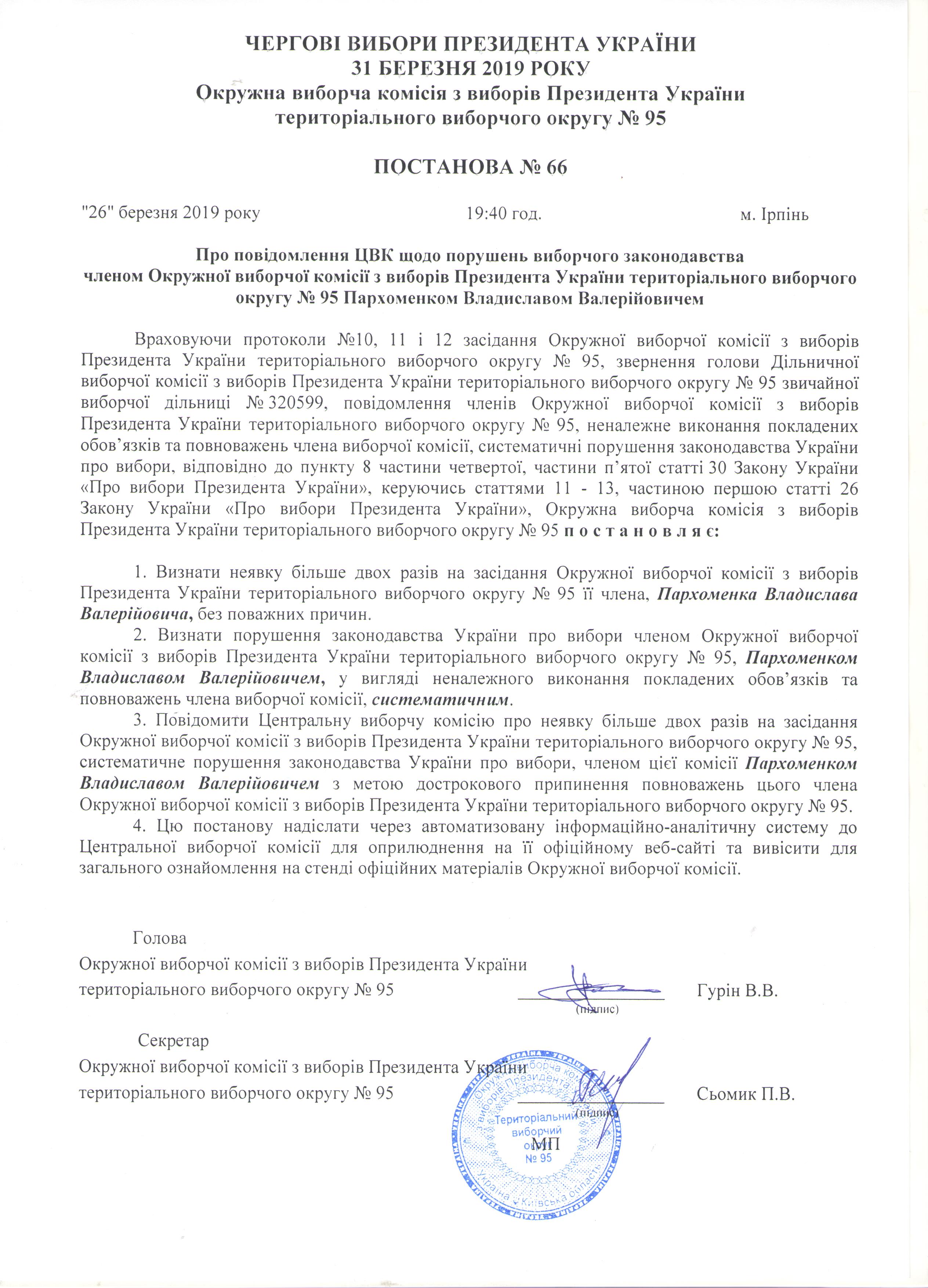 Про повідомлення ЦВК щодо порушень законодавства членом ОВК з виборів Президента України територіального виборчого округу №95 Пархоменком Владиславом Валерійовичем |