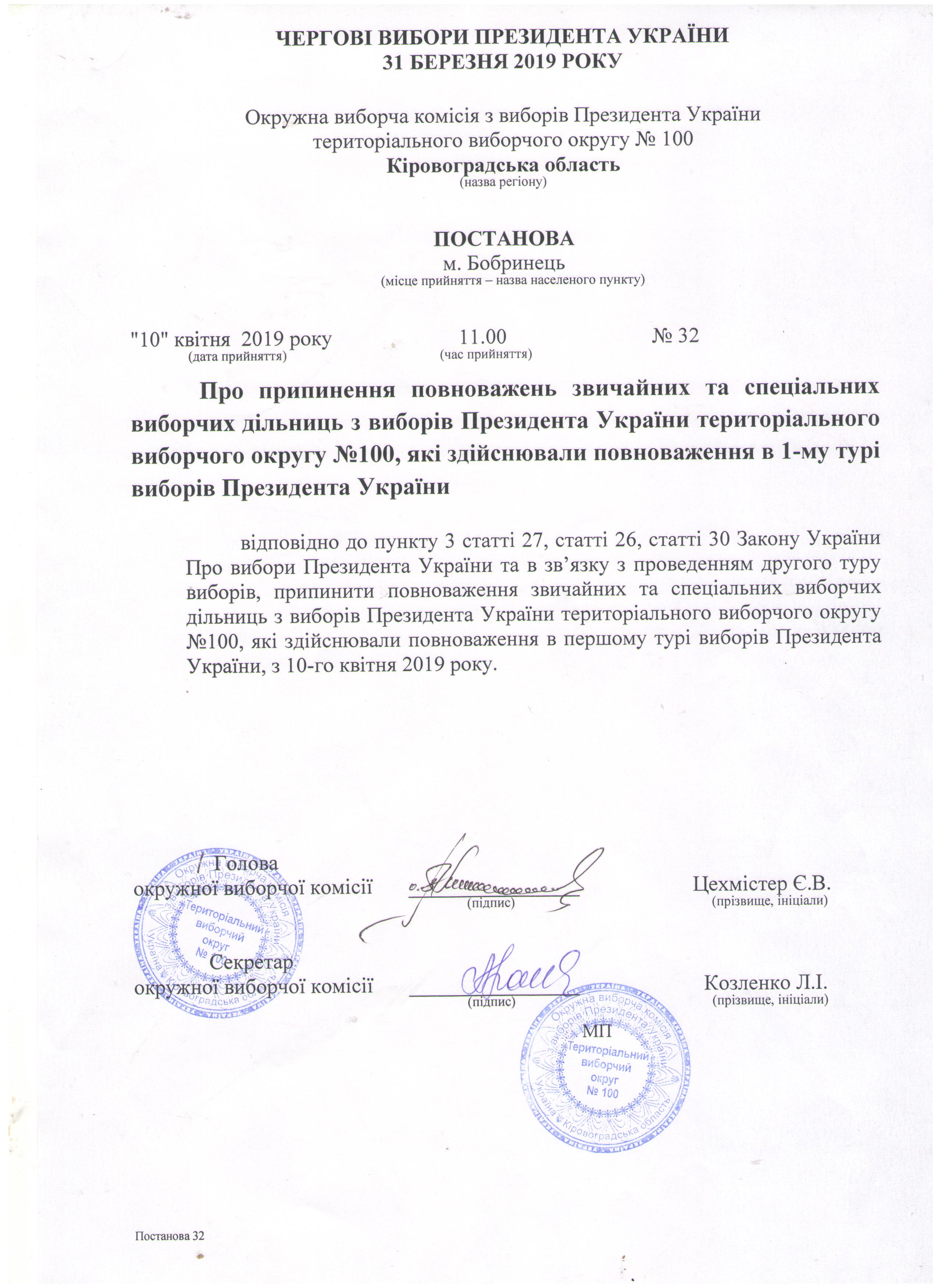 Про припинення повноважень звичайних та спеціальних виборчих дільниць з виборів Президента України територіального виборчого округу № 100, які здійснювали повноваження в 1-му турі виборів Президента України |