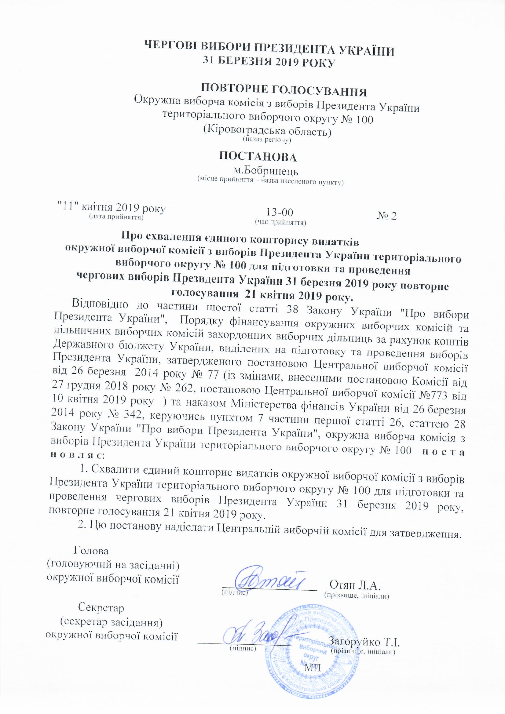 Про схвалення єдиного кошторису видатків окружної виборчої комісії з виборів Президента України територіального виборчого округу №100 для підготовки та проведення чергових Виборів Президента України 31 березня 2019 року повторне голосування 21 квітня 2019 року |