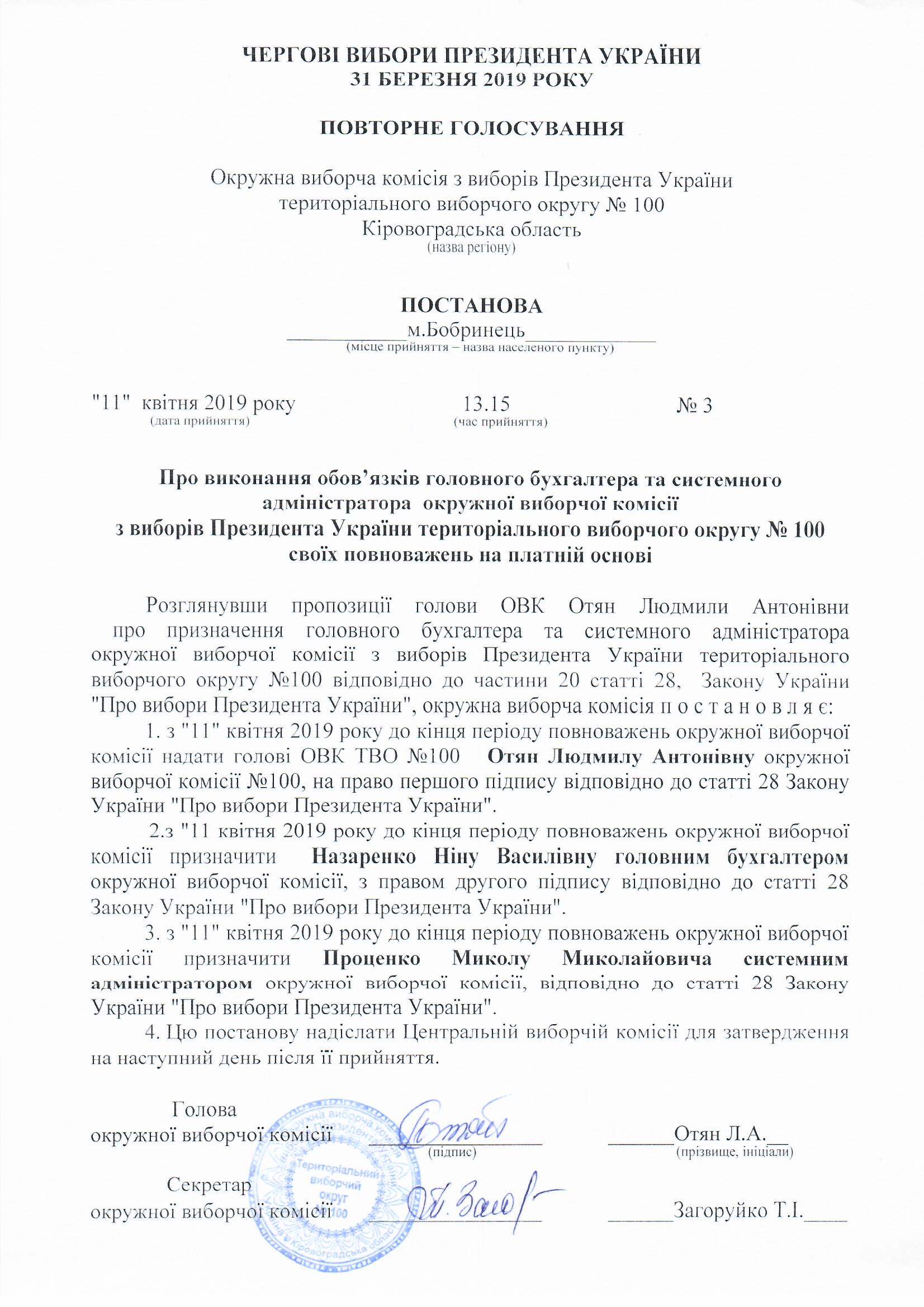 Про виконання обов'язків головного бухгалтера та системного адміністратора окружної виборчої комісії з Виборів Президента України територіального виборчого округу №100 своїх повноважень на платній основі |