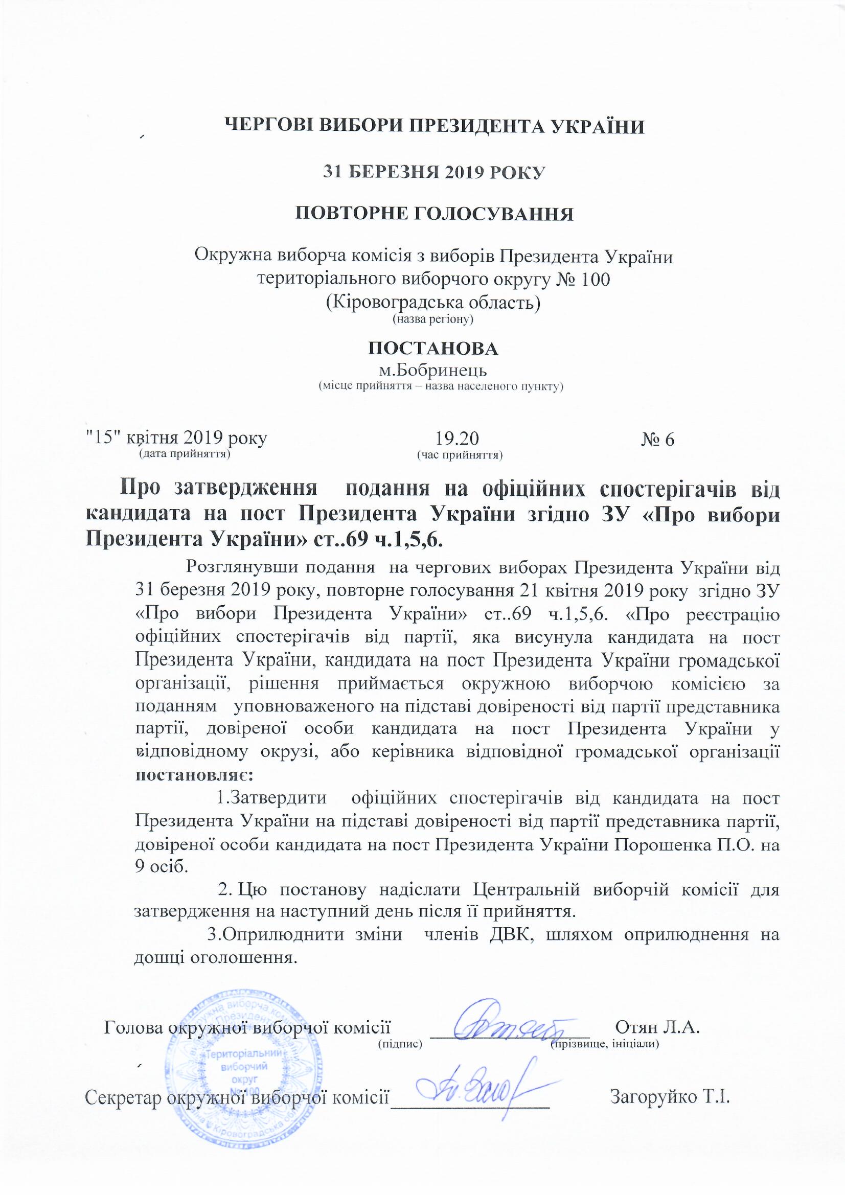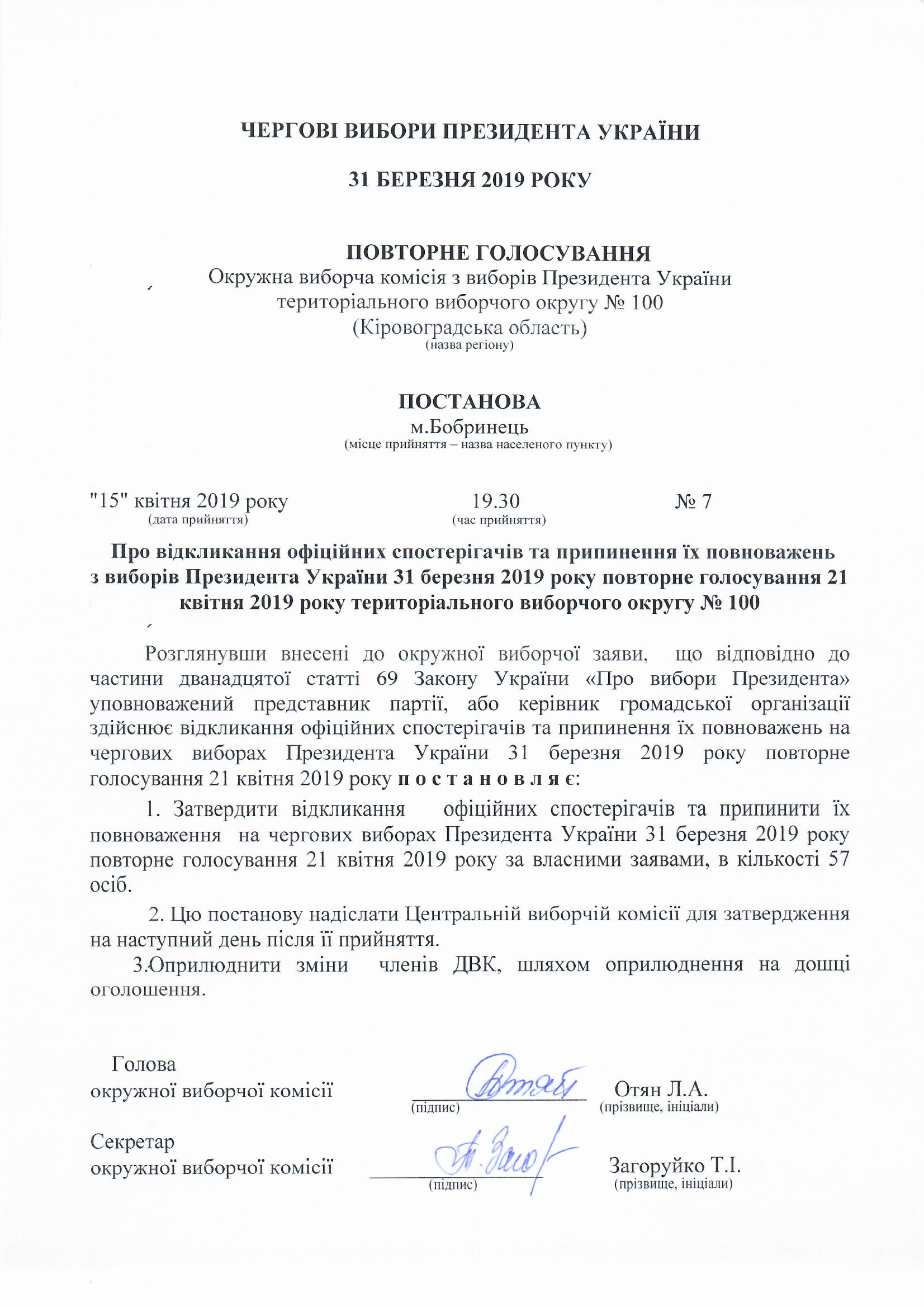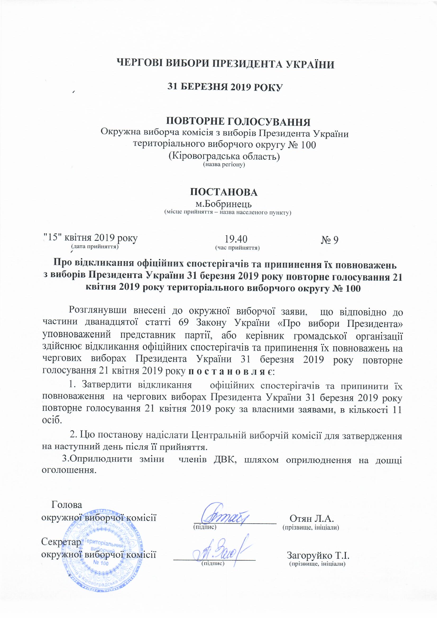 Про відкликання офіційних спостерігачів та припинення їх повноважень з виборів Президента України 31 березня 2019 року повторне голосування 21 квітня 2019 року територіального виборчого округу №100 |