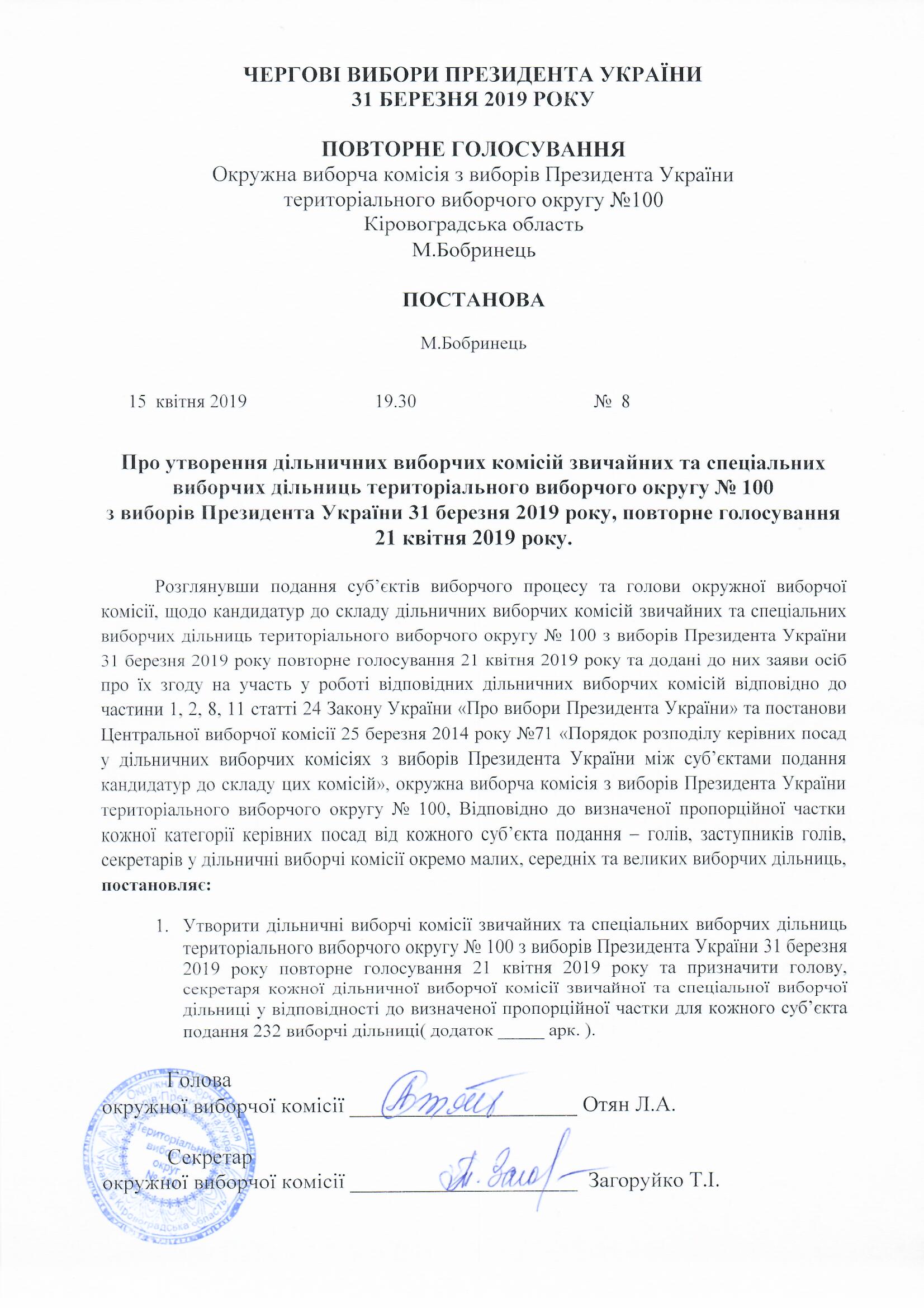 Про утворення дільничних вибочих комісій звичайних та спеціальних виборчих дільниць територіального виборчого округу №100 з виборів Президента України 31 березня 2019 року повторне голосування 21, квітня 2019 року |