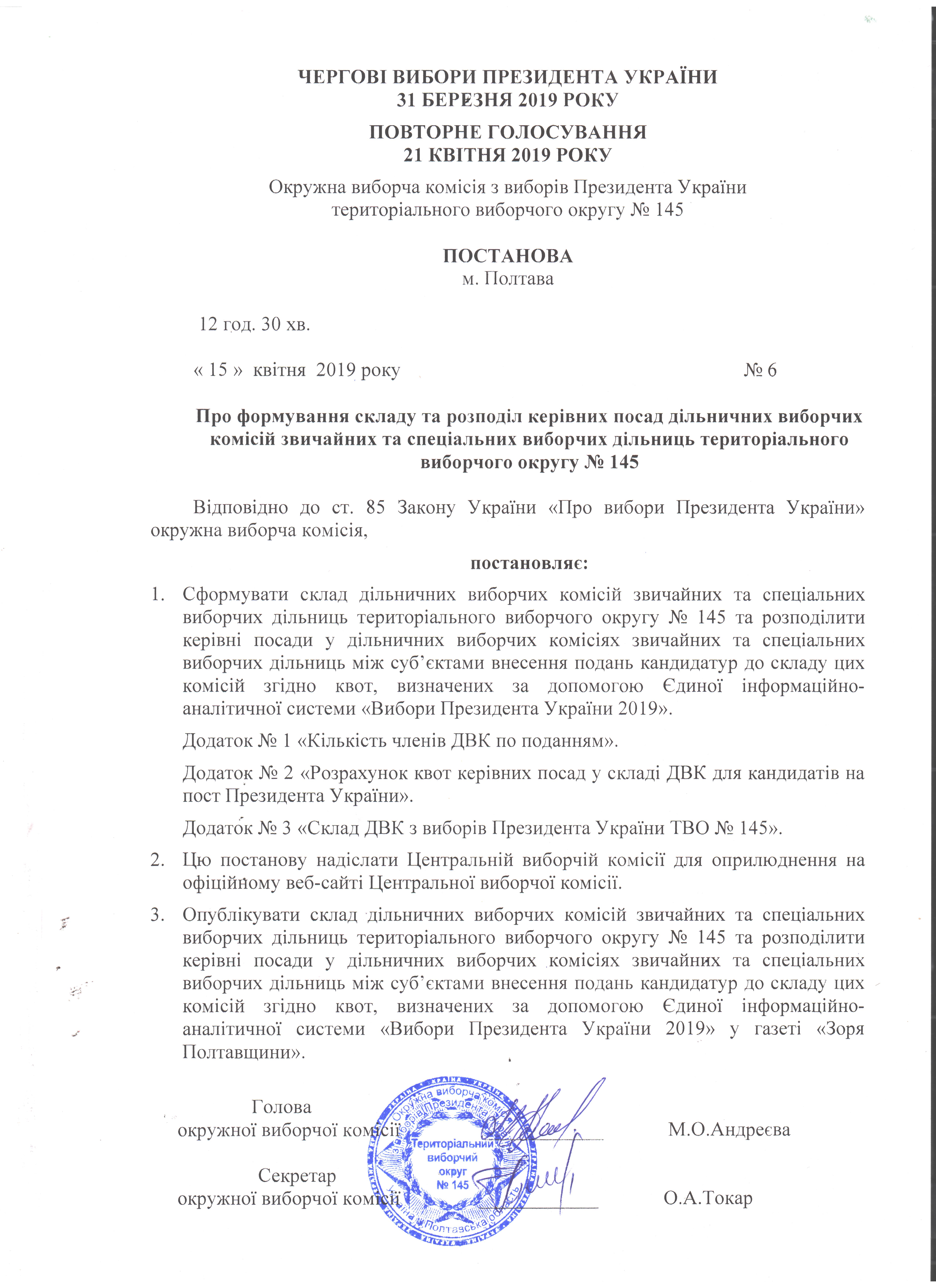 Про формування складу та розподіл керівних посад дільничних виборчих комісій звичайних та спеціальних виборчих дільниць територіального виборчого округу № 145 |