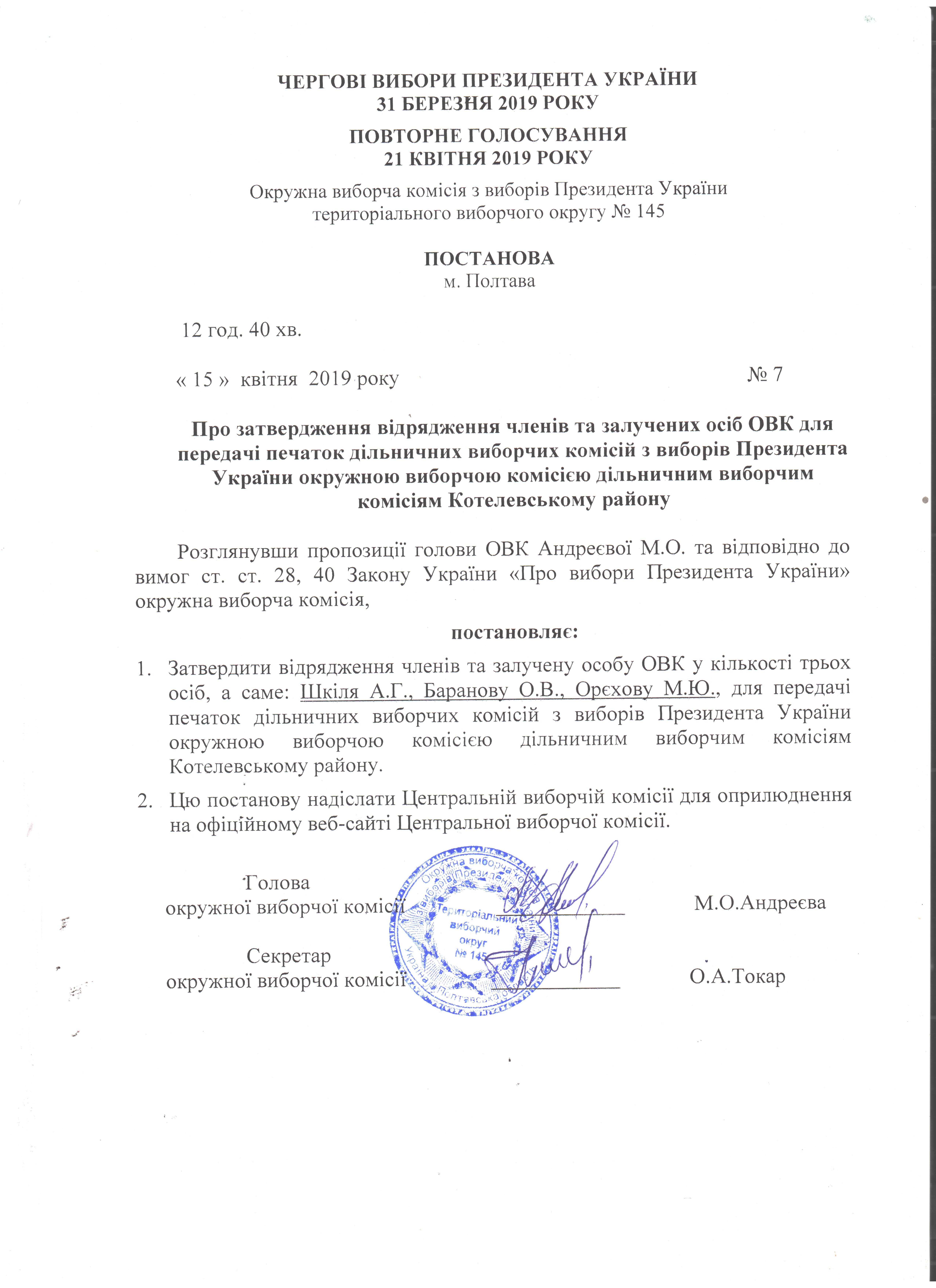 Про затвердження відрядження членів та залучених осіб ОВК для передачі печаток дільничних виборчих комісій з виборів Президента України окружною виборчою комісією дільничним виборчим комісіям Котелевському району |