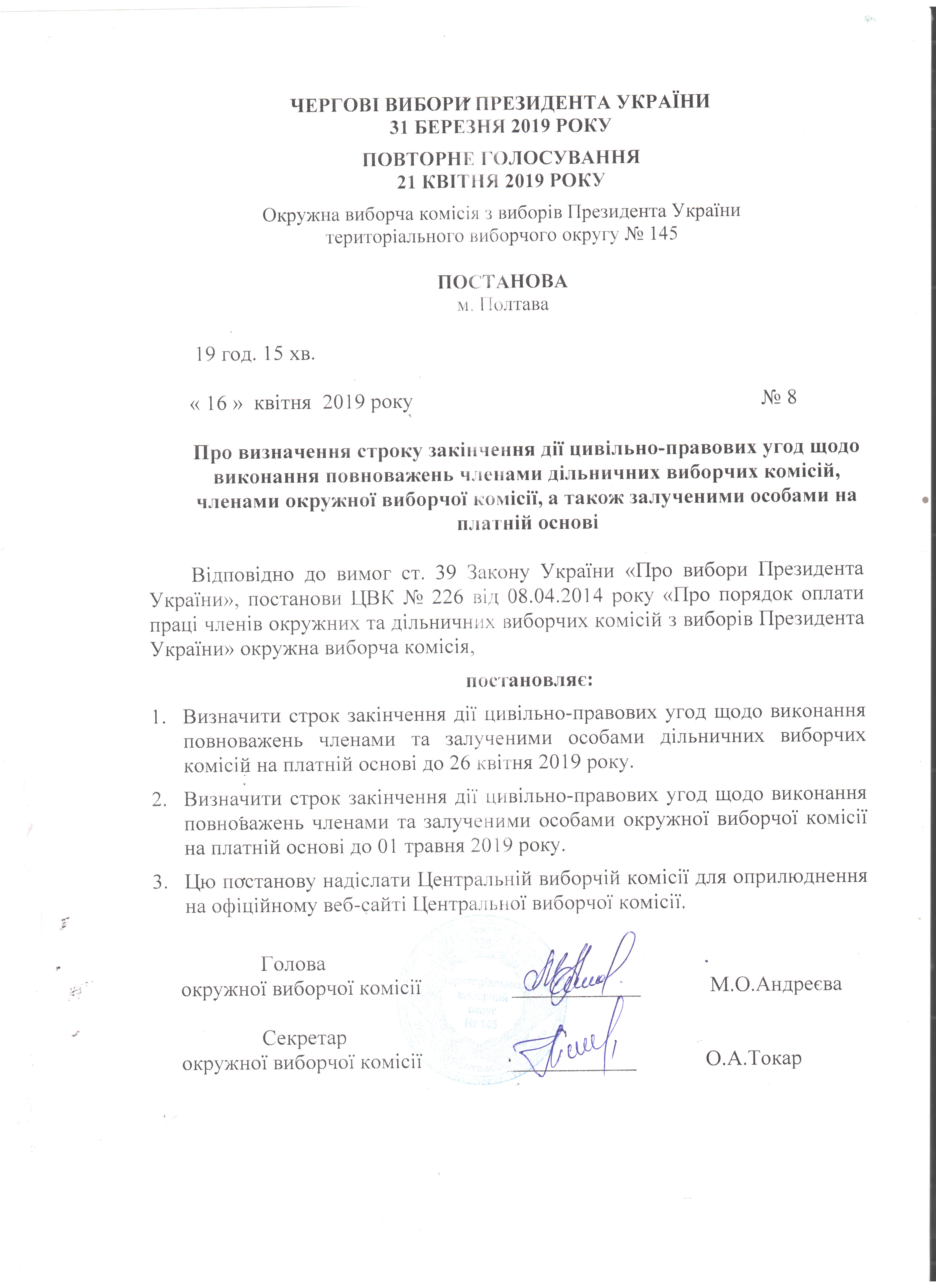 Про визначення строку закінчення дії цивільно-правових угод щодо виконання повноважень членами дільничних виборчих комісій, членами окружної виборчої комісії, а також залученими особами на платній основі |