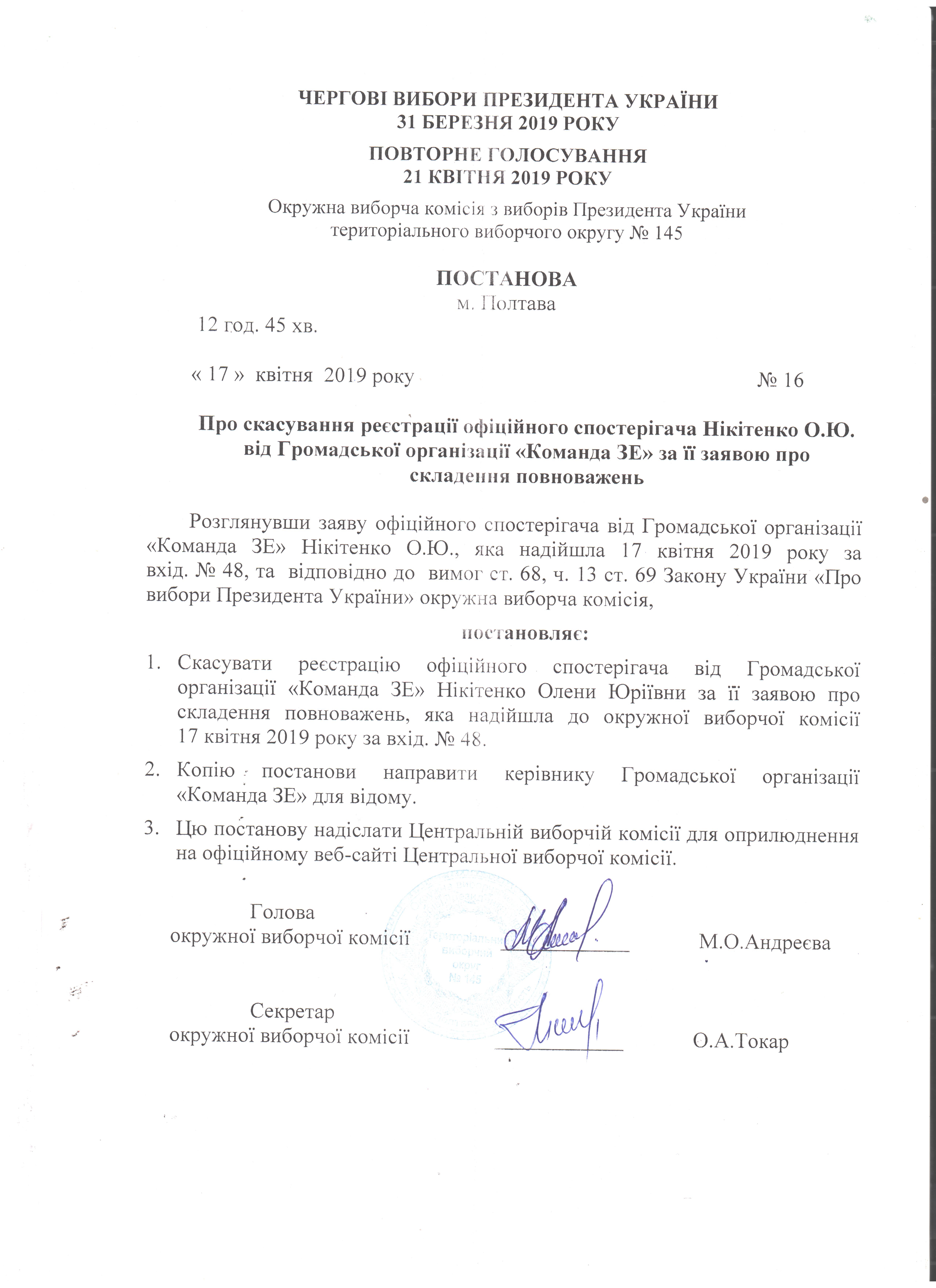 Про скасування реєстрації офіційного спостерігача Нікітенко О.Ю. від громадської організації «Команда ЗЕ» за її заявою про складення повноважень |