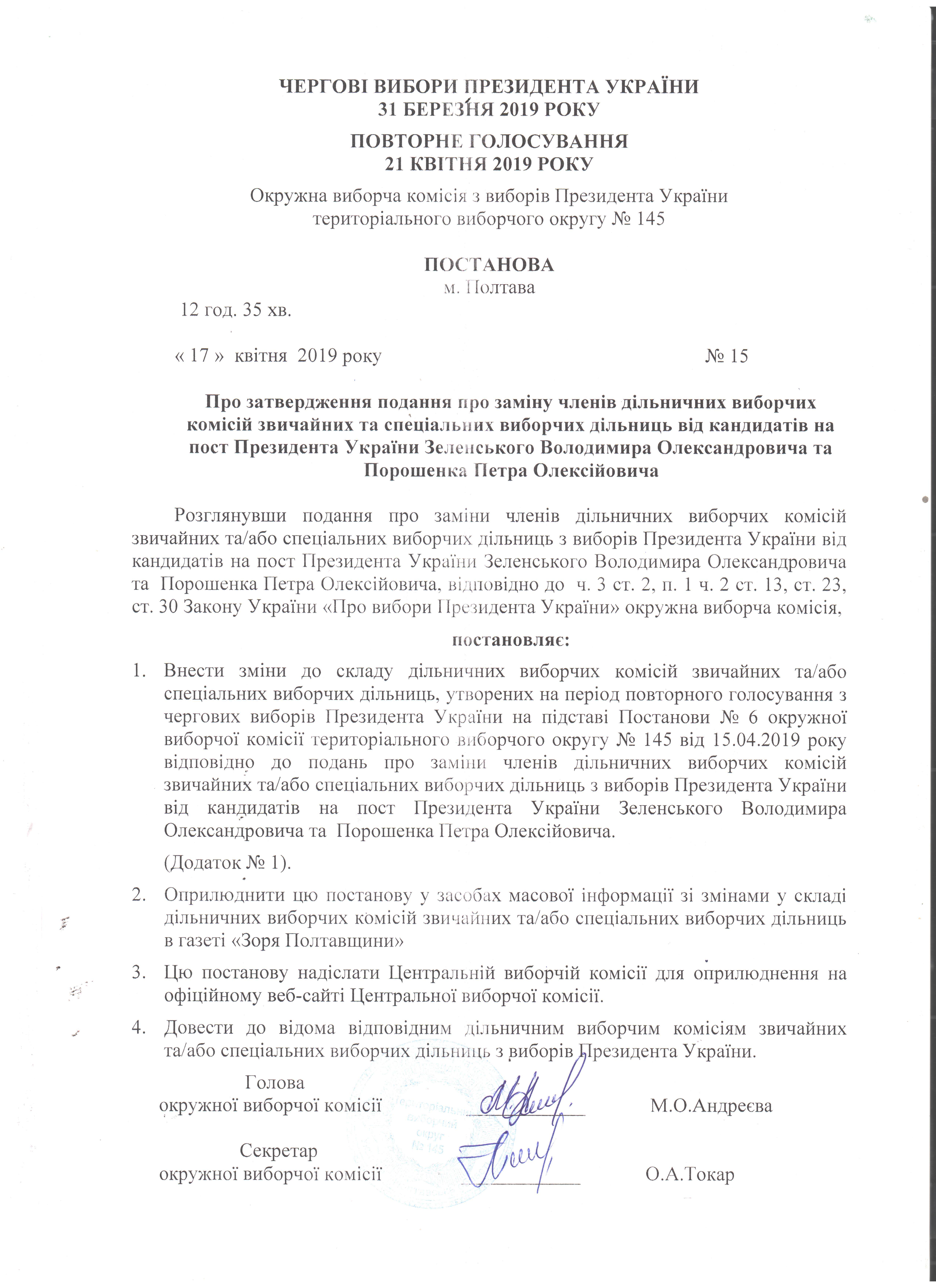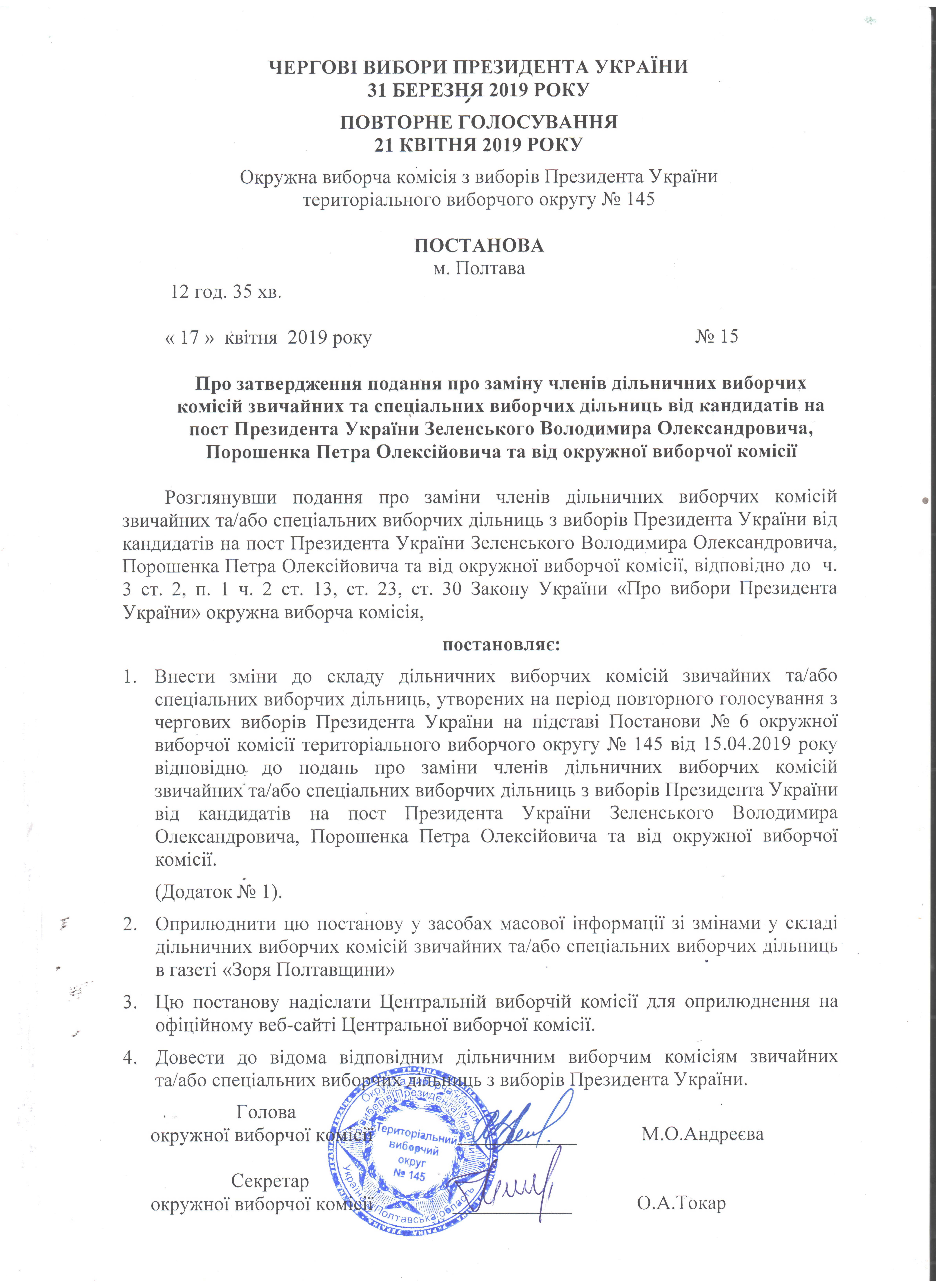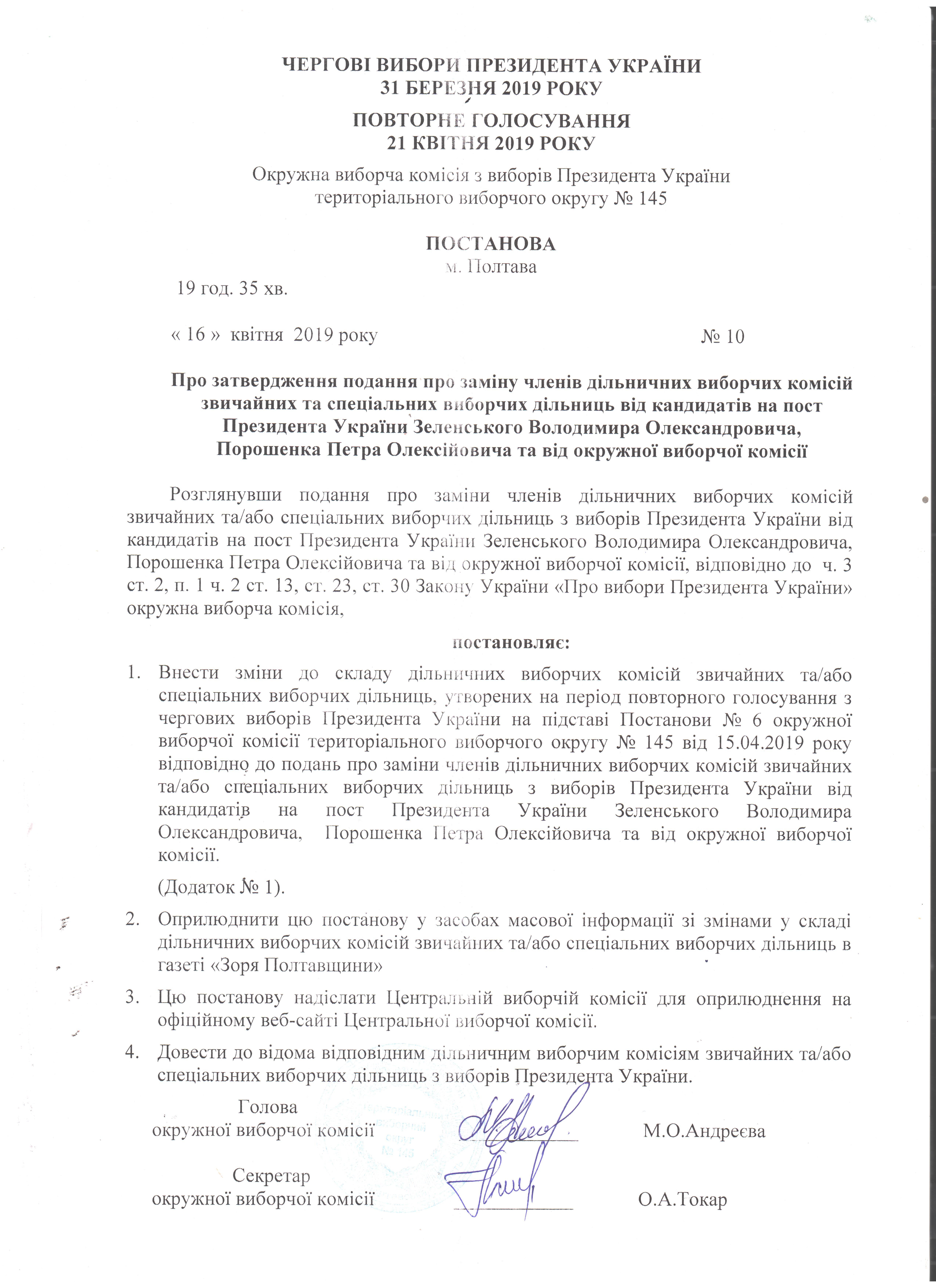 Про затвердження подання про заміну членів дільничних виборчих комісій звичайних та спеціальних виборчих дільниць від кандидатів на пост Президента України Зеленського Володимира Олександровича та Порошенка Петра Олексійовича |