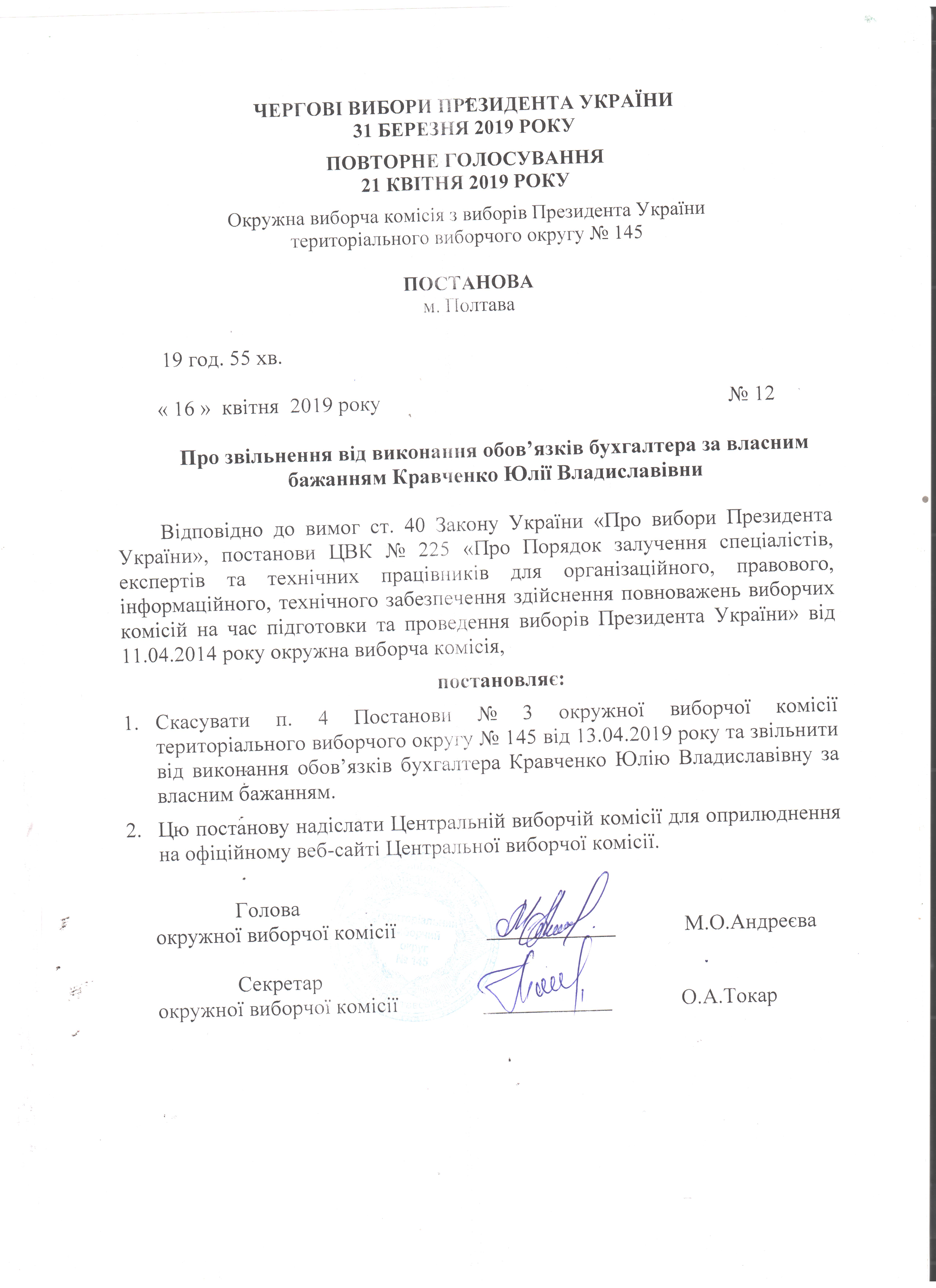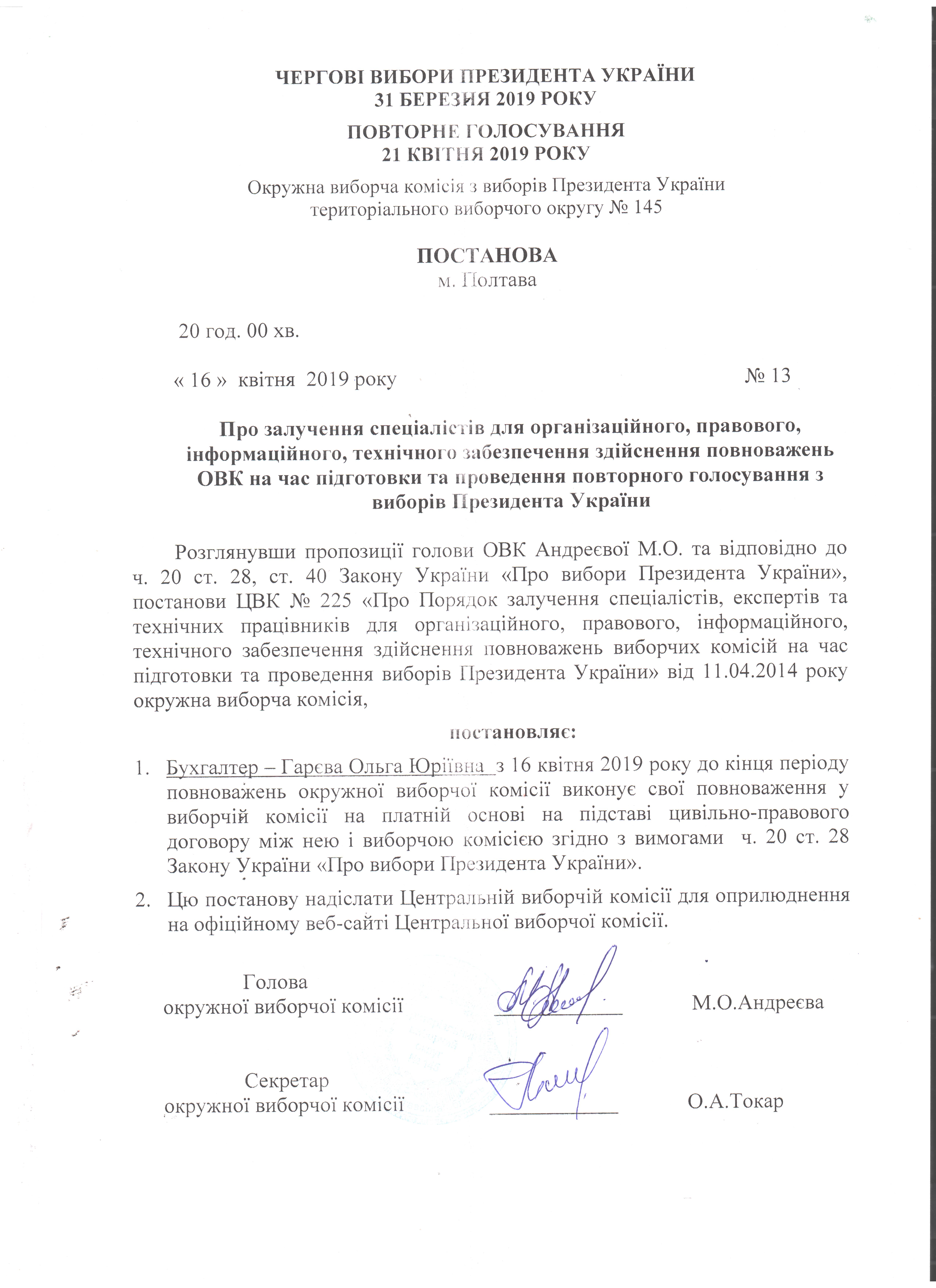 Про виконання членами окружної виборчоїї комісії з повторного голосування чергових виборів Президента України ТВО № 145 своїх пововажень на платній основі |
