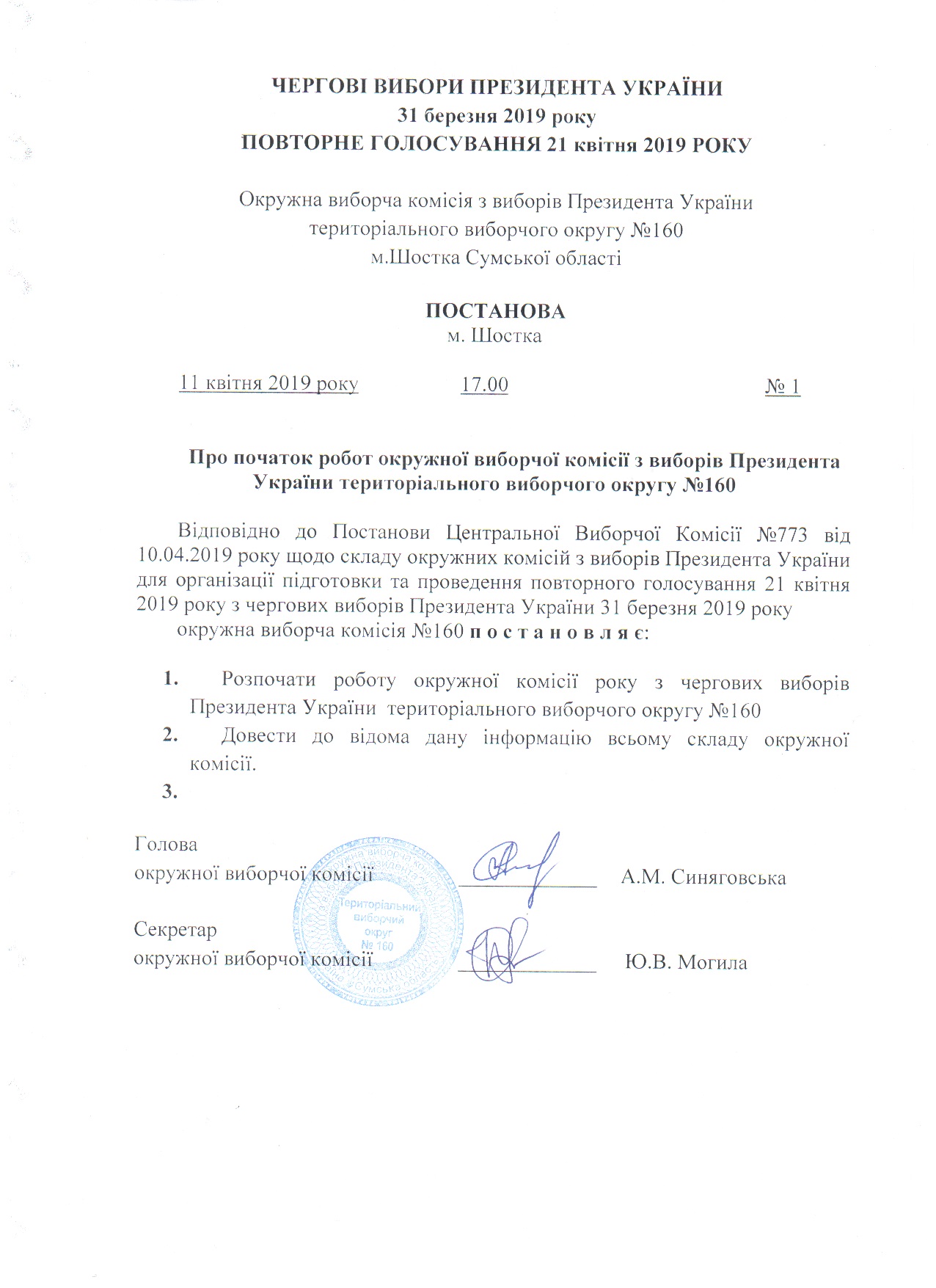 Про початок роботи окружної виборчої комісії з виборів Президента України територіального виборчого округу № 160 |