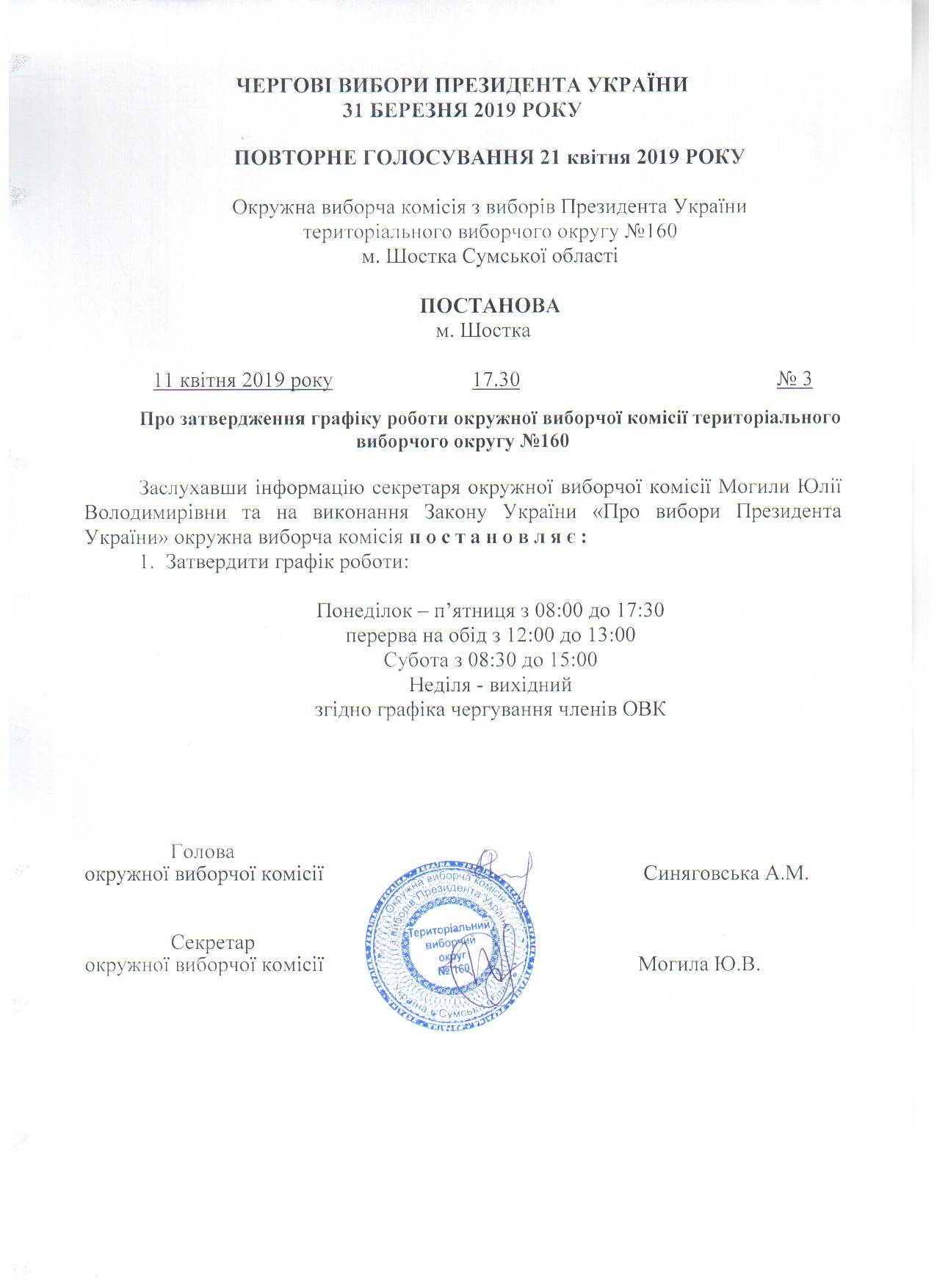 Про затвердження графіку роботи окружної виборчої комісії територіального виборчого округу № 160 |